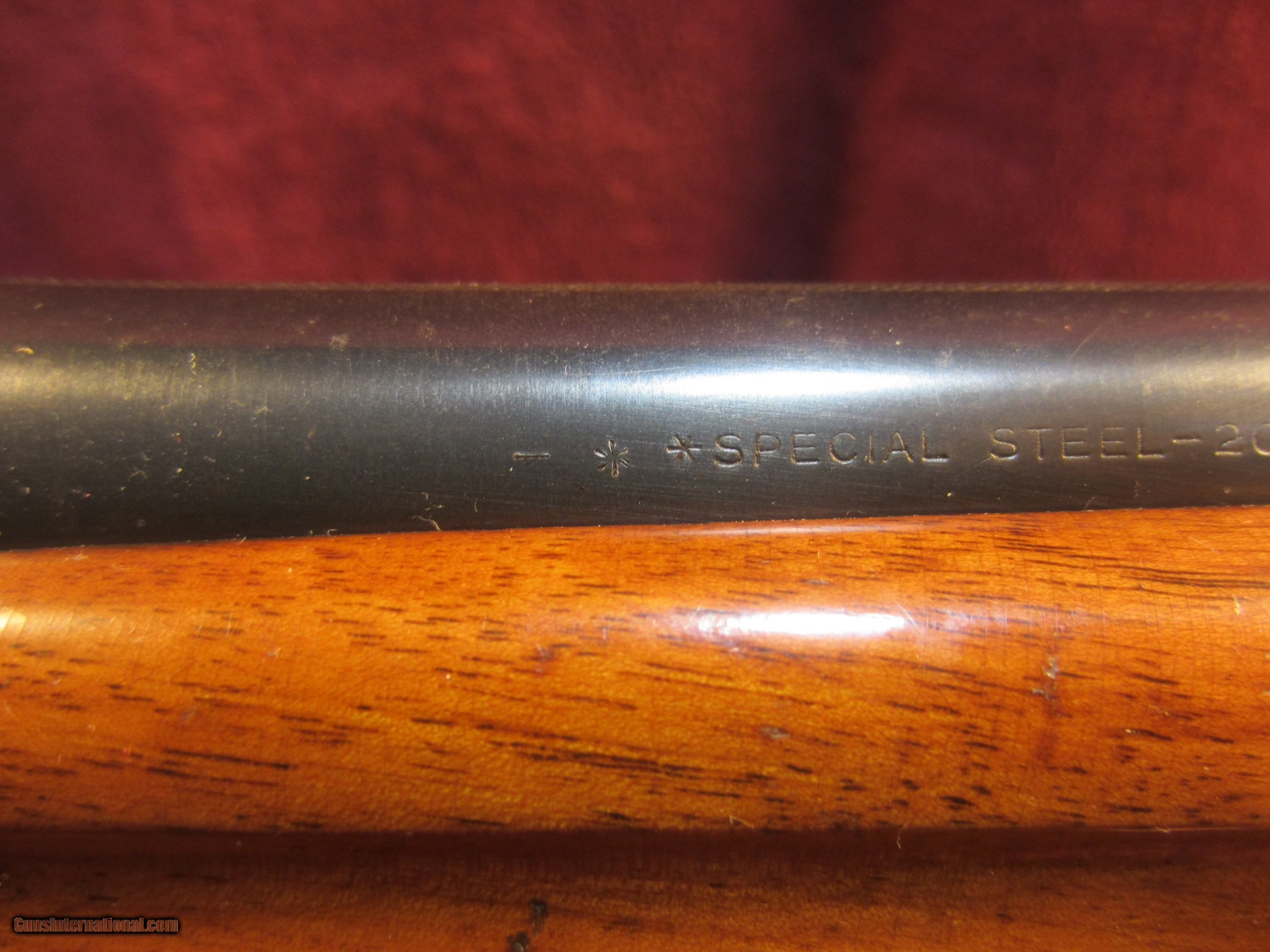 Description: ((((((((((SOLD DEL)))))))))))))))))))))))))BROWNING A5 20GA MAGNUM MADE IN BELGIUM RARE 26" BARREL CHOKE MARKED IMPROVED CYL AND SO MARKED. MATTED BARREL SOME LIGHT HANDLING MARKS ON WOOD FROM FIELD USE. FACTORY BLUE 95% SERIAL NUMBER 7X 5613 WANT TO PURCHASE CALL SHOP 716-941-3946 SOLD Curio/Relic: Yes |