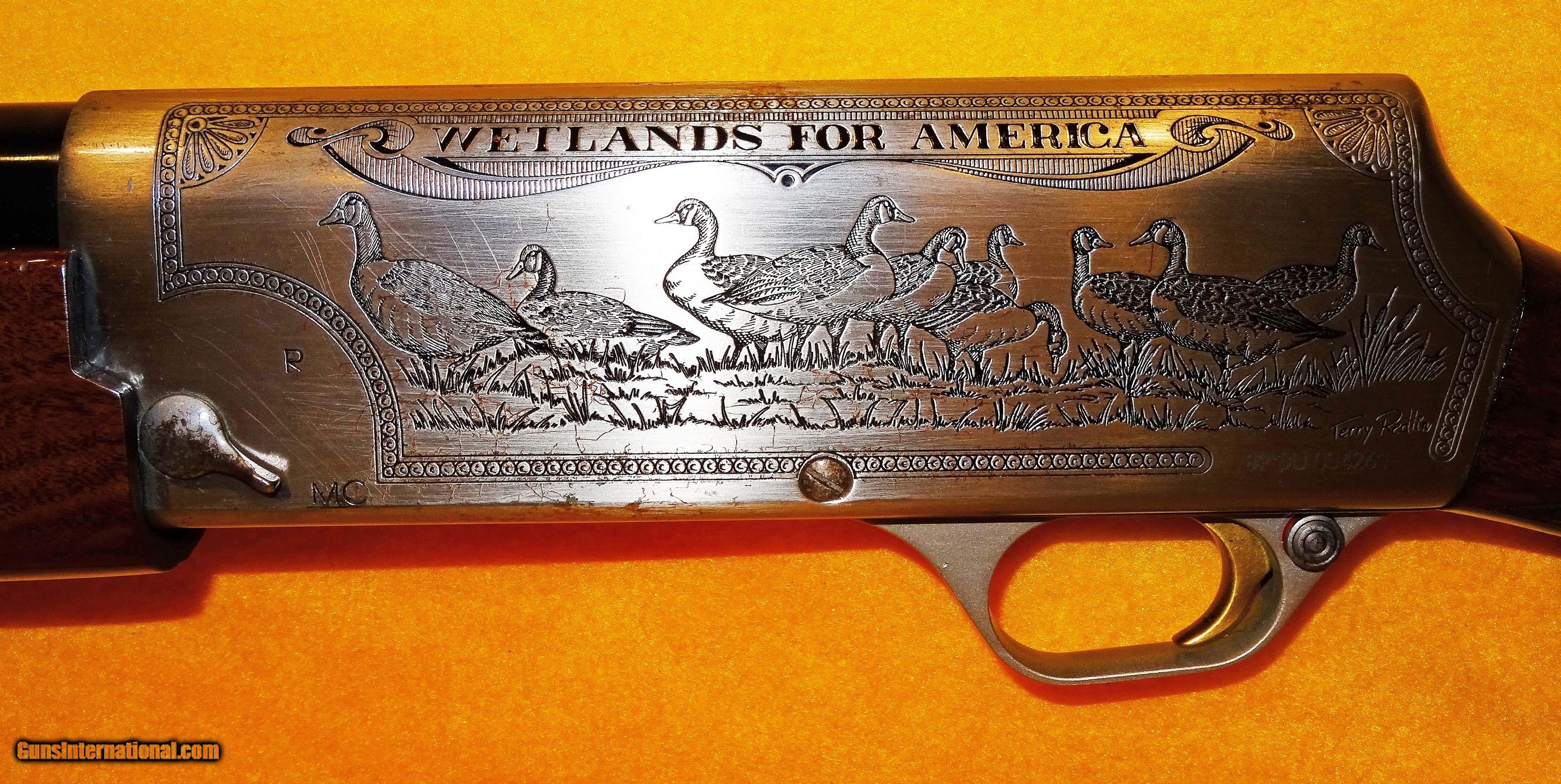 Description: BROWNING A5 (DUCKS UNLIMITED) IN 12 GA. CAL., WITH 28" BARREL. COLOR SILVER. CONDITION 94%. SERIAL NUMBER 89DU004261. BROWNING MODEL A5 DUCKS UNLIMITED MADE IN BELGIUM ASSEMBLED IN PORTUGAL (WETLANDS FOR AMERICA), 2 3/4" AND 3" CHAMBER, BRIGHT SHINY BORE TWO BEAD VENT RIBED BARREL WITH A IMPROVED SCREW IN CHOKE, SINGLE TO SEMI AUTO SWITCH, WOOD IS EXCELLENT, RECEIVER HAS SOME DULL AREAS ON THE BOTTOM OF RECEIVER WITH SLIGHT SCRATCHES ON THE LEFT SIDE, 94% OVERALL CONDITION, OUR STOCK # D1162. SOLD |