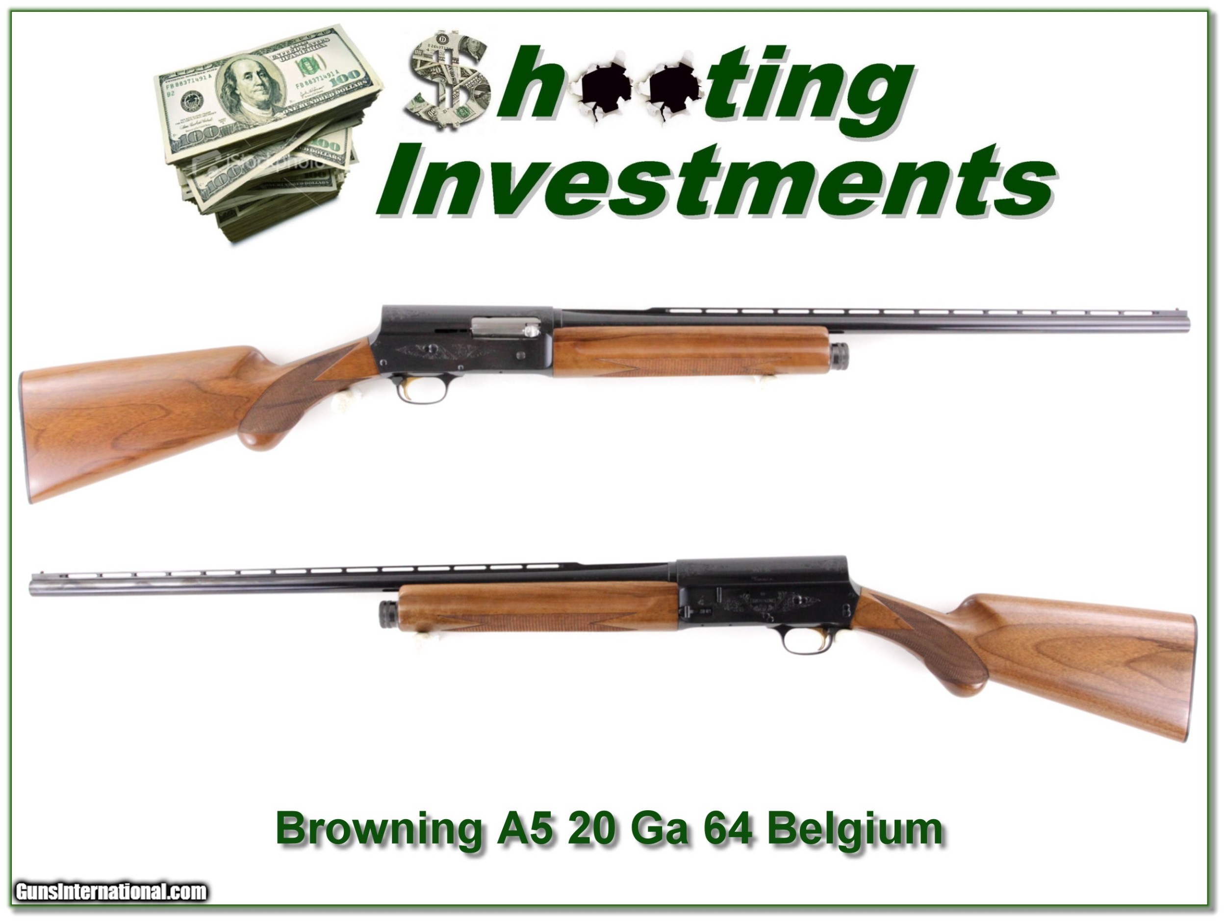 Description: This is beautiful Browning A5 20 Gauge made in Belgium in 1964. It see no edge, recoil or gold trigger wear and it has a 26in IC Vent Rib barrel. I am sure only a few rounds fired and see just a couple marks of the forearm. It will make a fine addition to your collection! Shipping with insurance is $49. Please email me with any questions or larger pictures. (Consign your quality firearms with Shooting Investments for only 12%! Let me know if you have any you would like to sell!) 19-0084 Payment: Payment is by Money Order, Cashiers Check or Personal Check. I can now also accept Credit Cards (MasterCard, Visa, Discover & American Express) with a 3% convenience fee. PayPal can be used for some items but never for firearms. Shipping: The shipping charge will be listed in each description. It is $39 for most firearms. Some heavy guns or those insured for over $2000 will be higher. Shipments to Alaska and Hawaii are higher because air shipment is required. Most firearms are shipped on Tuesday and Thursday and usually in 5 days of receipt of payment. We package all shipments carefully and insure them. Optics are shipped Priority Mail and most other non-firearm shipments are shipped First Class. Returns: Our return policy is simple. If for any reason you are not pleased with your purchase, you may return your item for a full refund of purchase price. Ammunition cannot be returned. It is important to us that you are happy. Guns cannot be fired or dissembled before returning them and they must be returned in the same condition as received. Notification of a return must occur with-in 3 days of receipt at your dealer. Shipping, convenience and dealer fees are not refundable and are the responsibility of the buyer. Lay-a-way: If needed, we offer a 60 day lay-a-way option on most firearms. It is 1/3 now, 1/3 in 30 days and 1/3 in 60 days. Lay-a-way firearm sales are final and if not completed the first payment cannot be returned. Consigning your firearms with Shooting Investments: We will help you get top dollar for your firearms. While most local guns shops charge 20% or more, our fee is only 12% with a minimum of $75. At your local gun shop it might take months to sell. Selling on-line provides instant access to thousands of interested buyers. You won’t find any other on-line dealer willing to sell your firearms for only 12% or listing every gun on 3 separate s. Selling through an House typically costs the seller 15% and the buyer an addition 15% (so 30%) and you have to wait several months to sell and longer to receive funds. If properly priced, we will sell your firearms in a few weeks. Send us an email or give us a call and we’ll explain how easy it is for you to get top dollar. Trading: Trading for use is really just buying your gun to re-sell. If you have a gun you want to trade, please email a picture and we will let you know what we can give or it. You will always get more if we sell it for you on consignment. Help for California Buyers: We are happy to ship to California. It is the buyer’s responsibility to make sure any item you buy is legal in your state. We are also happy to help with your purchase of a firearm from someone other than us. If you see a gun you would like to buy but the seller can’t or won’t ship to California they can ship to use and we’ll then ship it to your California dealer. The cost for this service is only $30 + shipping. Let us know if we can help! SOLD |