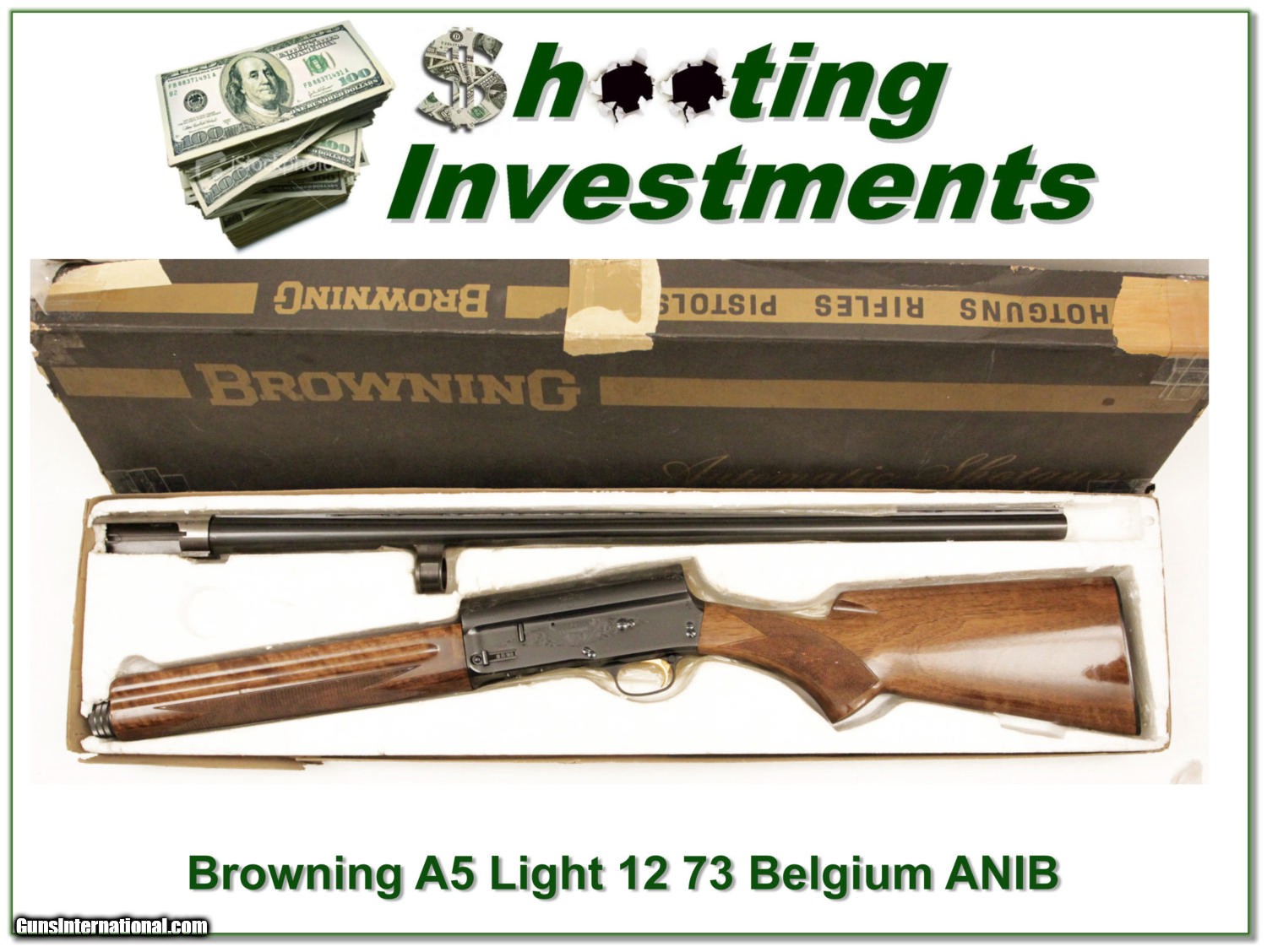 Description: Collectors, this is a 1973 Belgium made Browning A5 light 12. It is in as new condition and I believe unfired. The wood has MUCH nicer grain than most. The vent rib barrel is a 28in Modified. It comes in box as shown. The box is worn and the end that had the label is missing. This beauty will make a fine addition to your collection! Shipping and insurance is $30 or $18 more if you want it shipped in a new Plano hard case. Please email me with any questions or larger pictures. (I now consign quality firearms only 10%! Let me know if you have any you would like to sell!) [15-1456] Payment: Payment is by Money Order, Cashiers Check or Personal Check. I can now also accept MasterCard and Visa with a 3% convenience fee. PayPal can be used for some items but never firearms. Please let us know if you would like to pay via PayPal. Shipping: The shipping charge will be listed in each description. It is $30 for most guns. Some heavy guns or those insured for over $2000 may be higher. Shipments to Alaska and Hawaii are higher because air shipment is required. Most firearms are shipped within 5 days of receipt of payment. We prefer shipping at the beginning of the week to avoid firearms in transit over weekends. We package all shipments carefully and insure them for the full purchase price, rounded up to the next $100. In the unlikely event that damage occurs, it is important that you save all packaging material for the claims process. Optics are shipped Priority Mail and most other non-firearm shipments are shipped First Class. Returns: Our return policy is simple. If for any reason you are not pleased with your purchase, you may return your item for a refund. The only exception is ammunition, it cannot be returned. It is important to us that you are happy. Guns cannot be fired or dissembled before returning them and must be returned in the same condition as received. Notification of a return must occur with-in 3 days of receipt at your dealer. Shipping, convenience and dealer fees are not refundable and are the responsibility of the buyer. Lay-a-way: If needed, we offer a 60 day lay-a-way option on most firearms. It is 1/3 now, 1/3 in 30 days and 1/3 in 60 days. Lay-a-way firearm sales are final. Consigning your firearms with Shooting Investments: We will help you get top dollar for your firearms. While most local guns shops charge 20% or more, our fee is only 10% with a minimum of $50. At your local gun shop it might take months to sell. Selling on-line provides instant access to thousands of interested buyers. You won’t find any other on-line dealer willing to sell your firearms for only 10% or listing every gun on 4 separate s. Selling through an House typically costs the seller 15% and the buyer an addition 15% (so 30%) and you have to wait several months to sell and longer to receive funds. If properly priced, we will sell your firearms in a week or two. Send us an email or give us a call and we’ll explain how easy it is for you to get top dollar. Trading: We collect guns and usually just trade for guns we want to add to our collections. We often sell guns for others wanting to purchase one of ours. We find this the most fair to both of us. Our Commission is only 10% and we hold the gun you want until yours sells. Please contact us if you want to sell one of yours to buy one of ours. Help for California Buyers: We are happy to ship to California. It is the buyer’s responsibility to make sure any item you buy is legal in your state. We are also happy to help with your purchase of a firearm from someone other than us. If you see a gun you would like to buy but the seller can’t or won’t ship to California we can help. You buy the gun and have it shipped to us. We’ll then ship it to your California dealer. The cost for this service is only $30 + shipping. Let me know if we can help! SOLD |