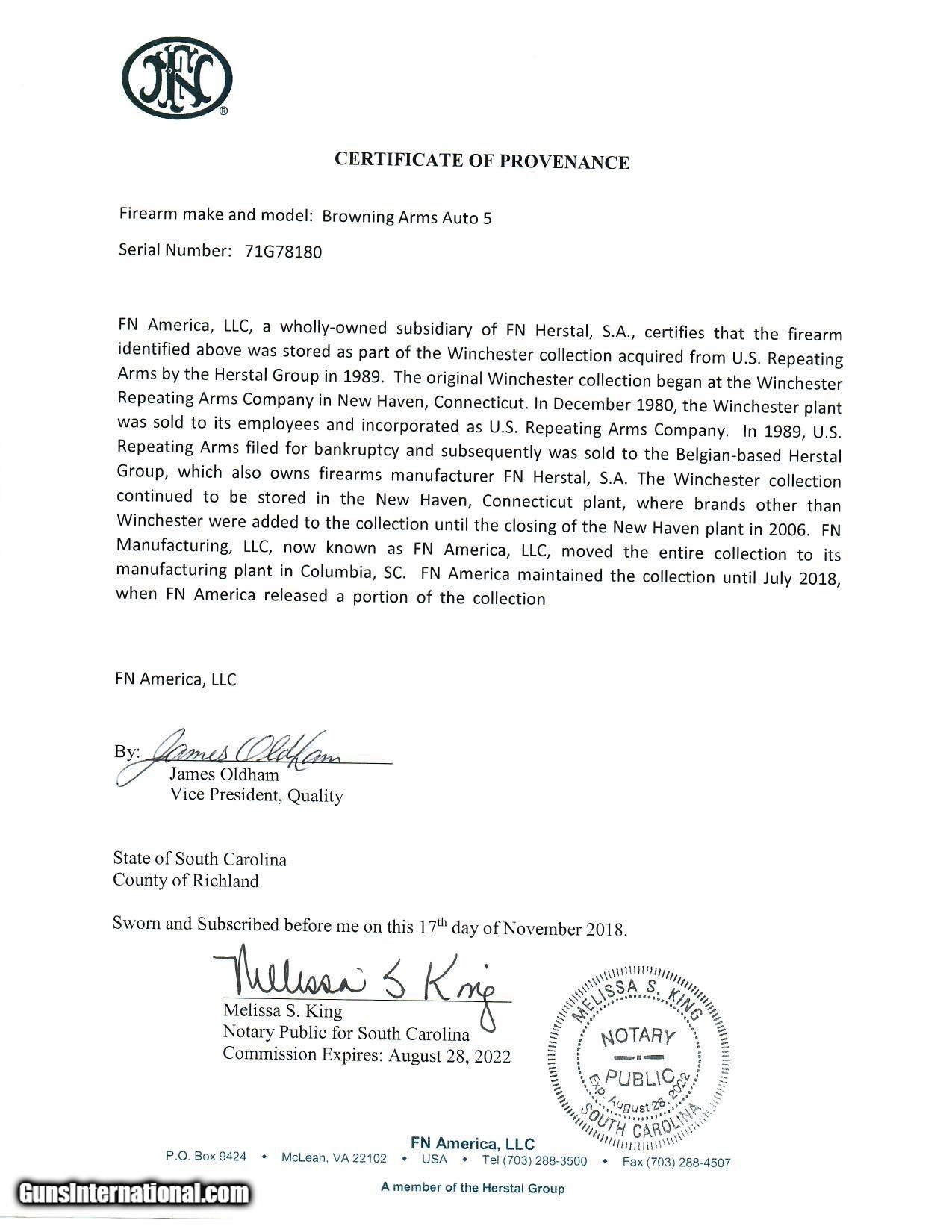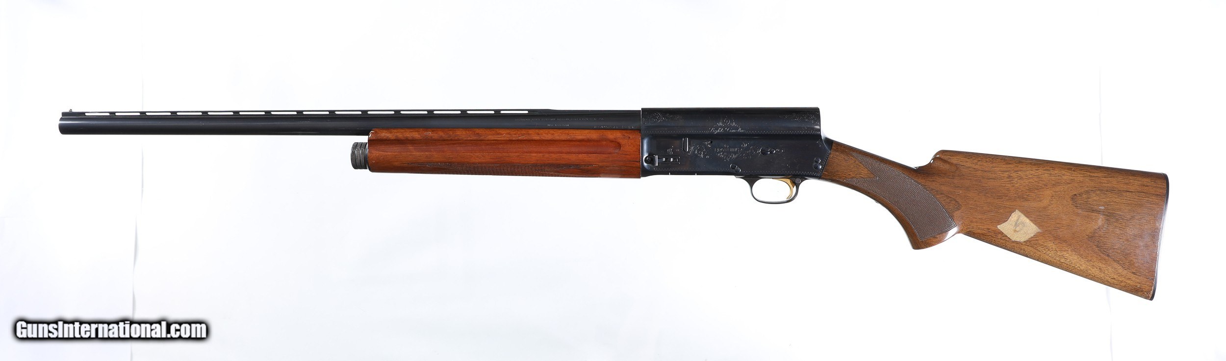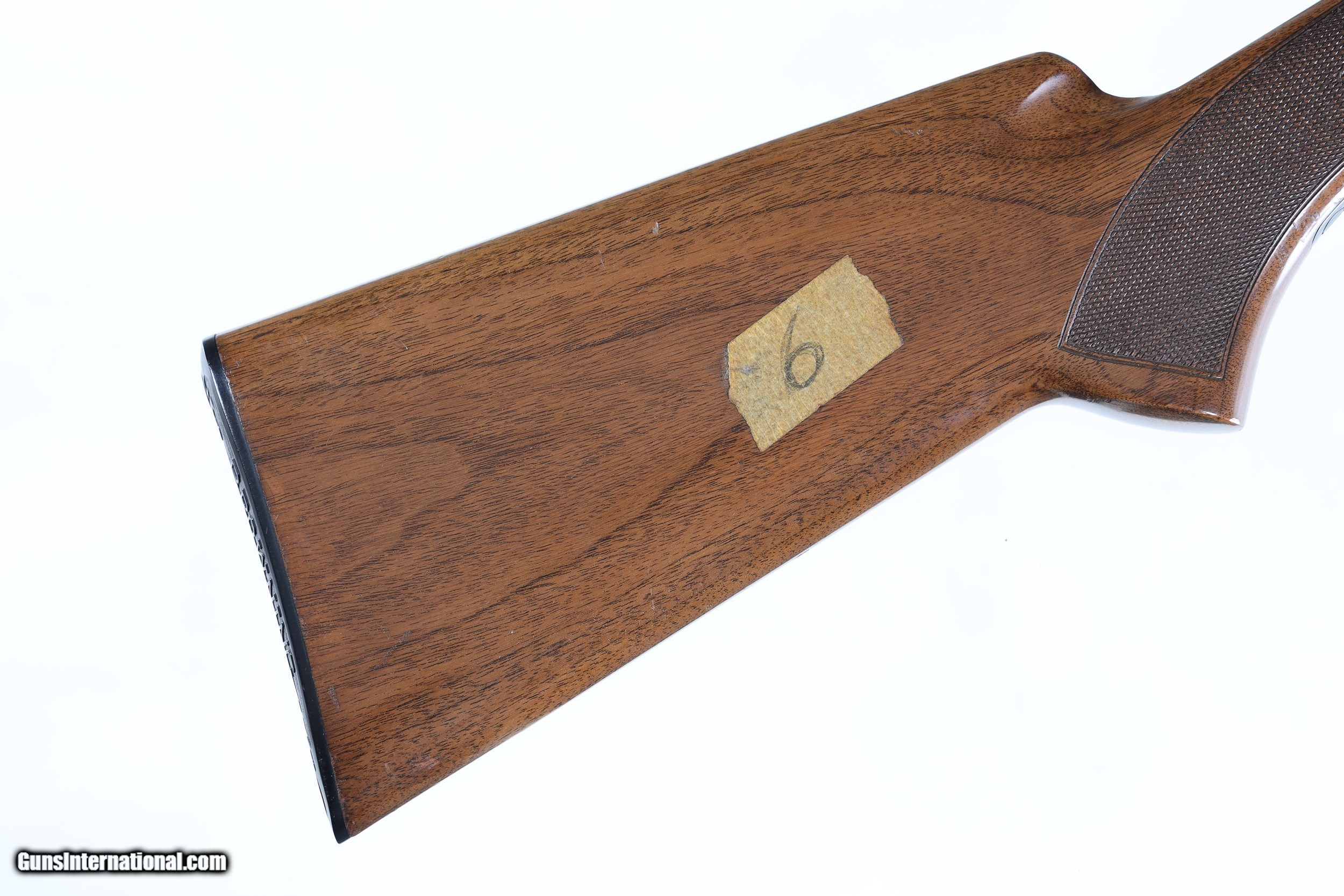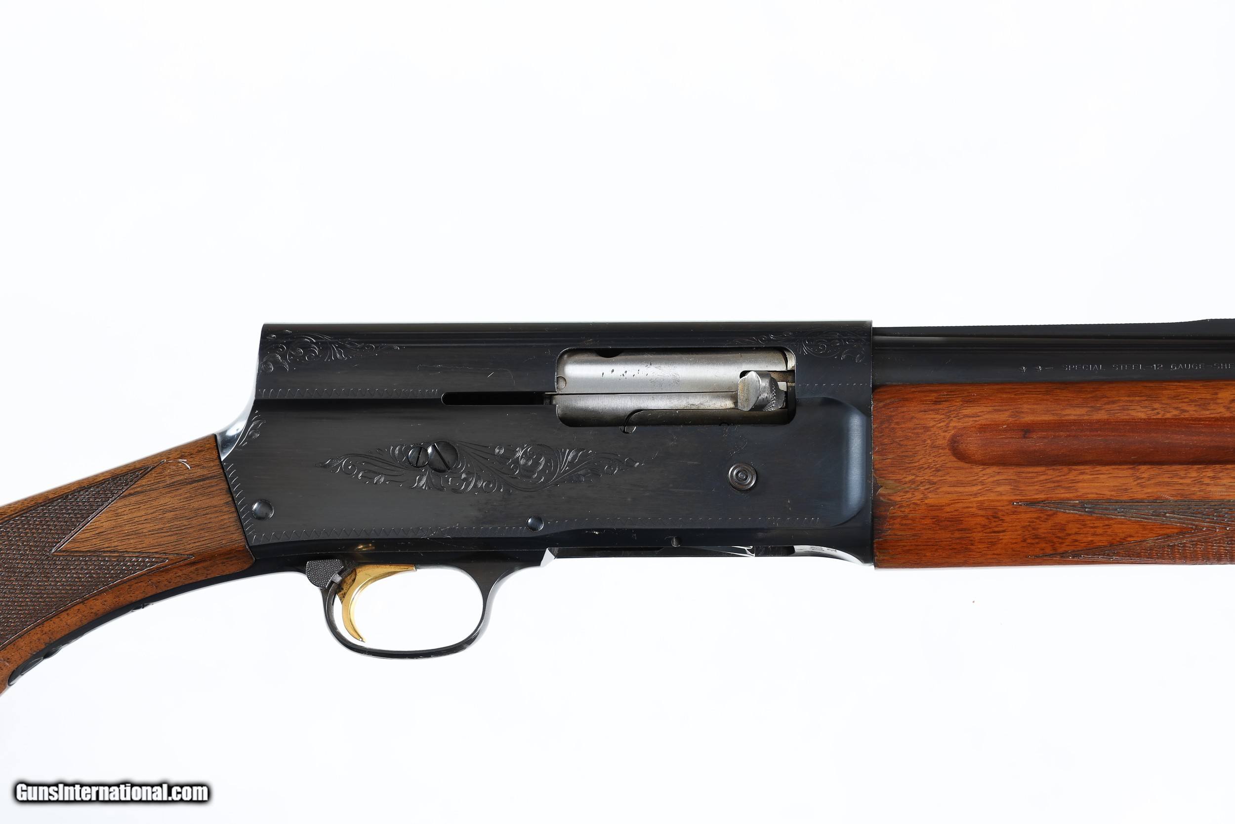 Description: Metal surfaces rate excellent. Hairline crack at underside of forend. Modified choke, 2 3/4" chamber, 14" LOP. Mfd in Belgium. Includes Certificate of Provenance stating it was previously a part of the Winchester Factory Collection where it was maintained by U.S. Repeating Arms. Barrel 25 1/2", C&R. SOLD Curio/Relic: Yes Manufacturer: Browning Model: A5 Light Twelve Serial Number: 71G78180 Metal Condition: Excellent. Action: Semi Shotgun Gauge Info: 12ga LOP: 14 |