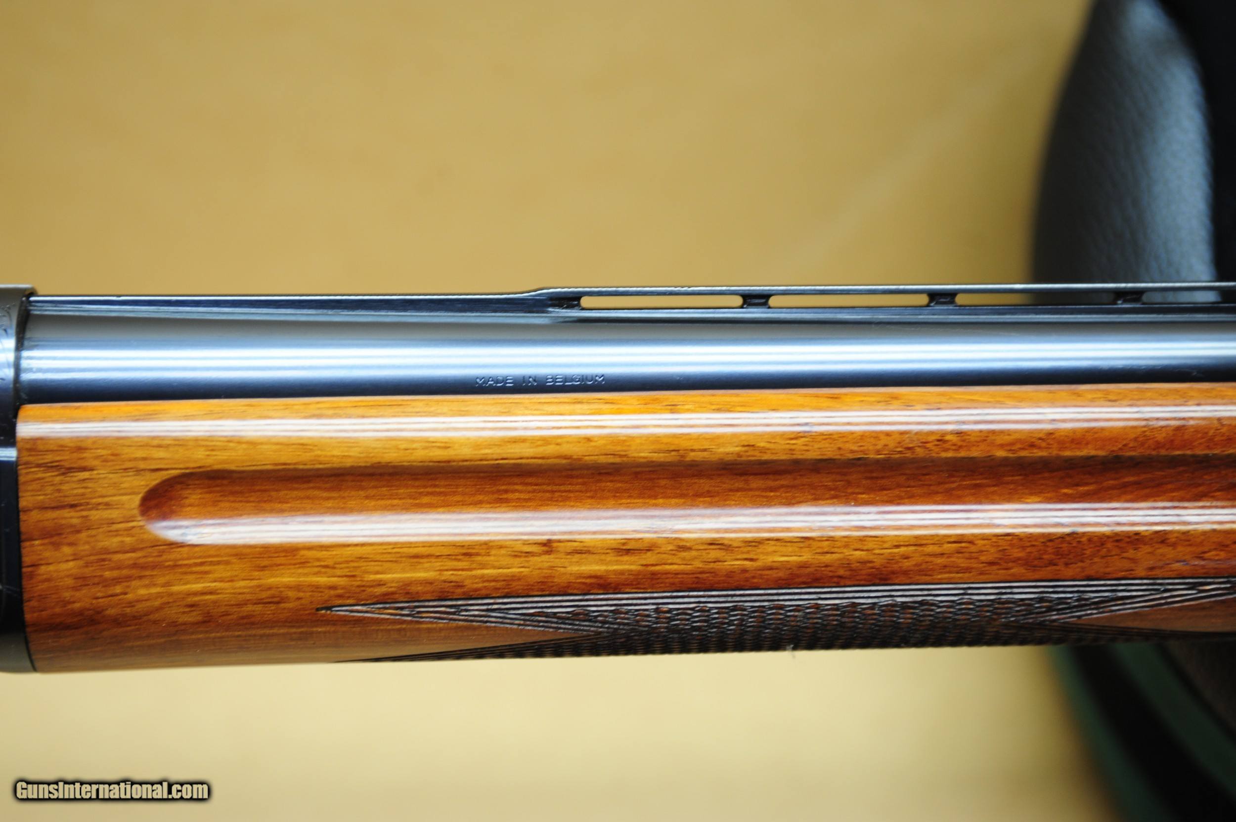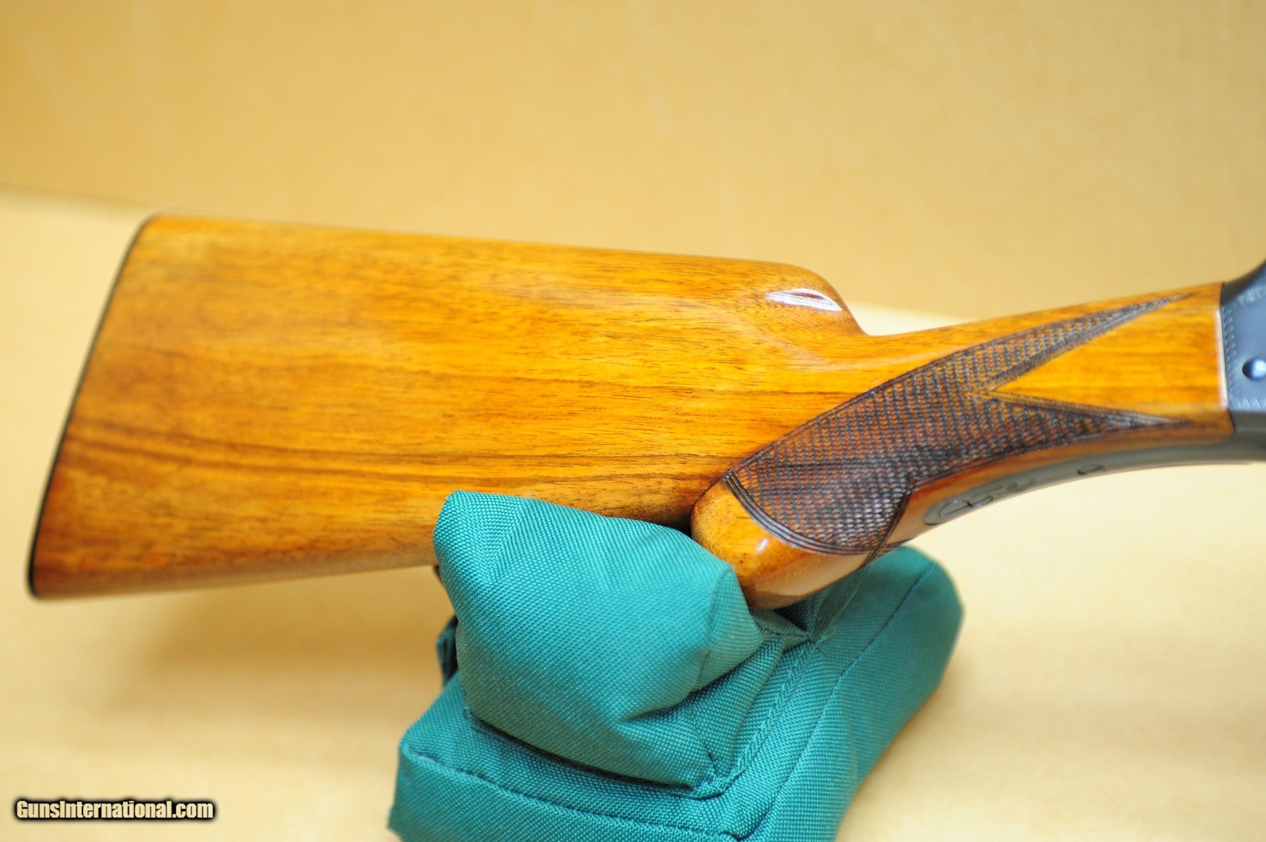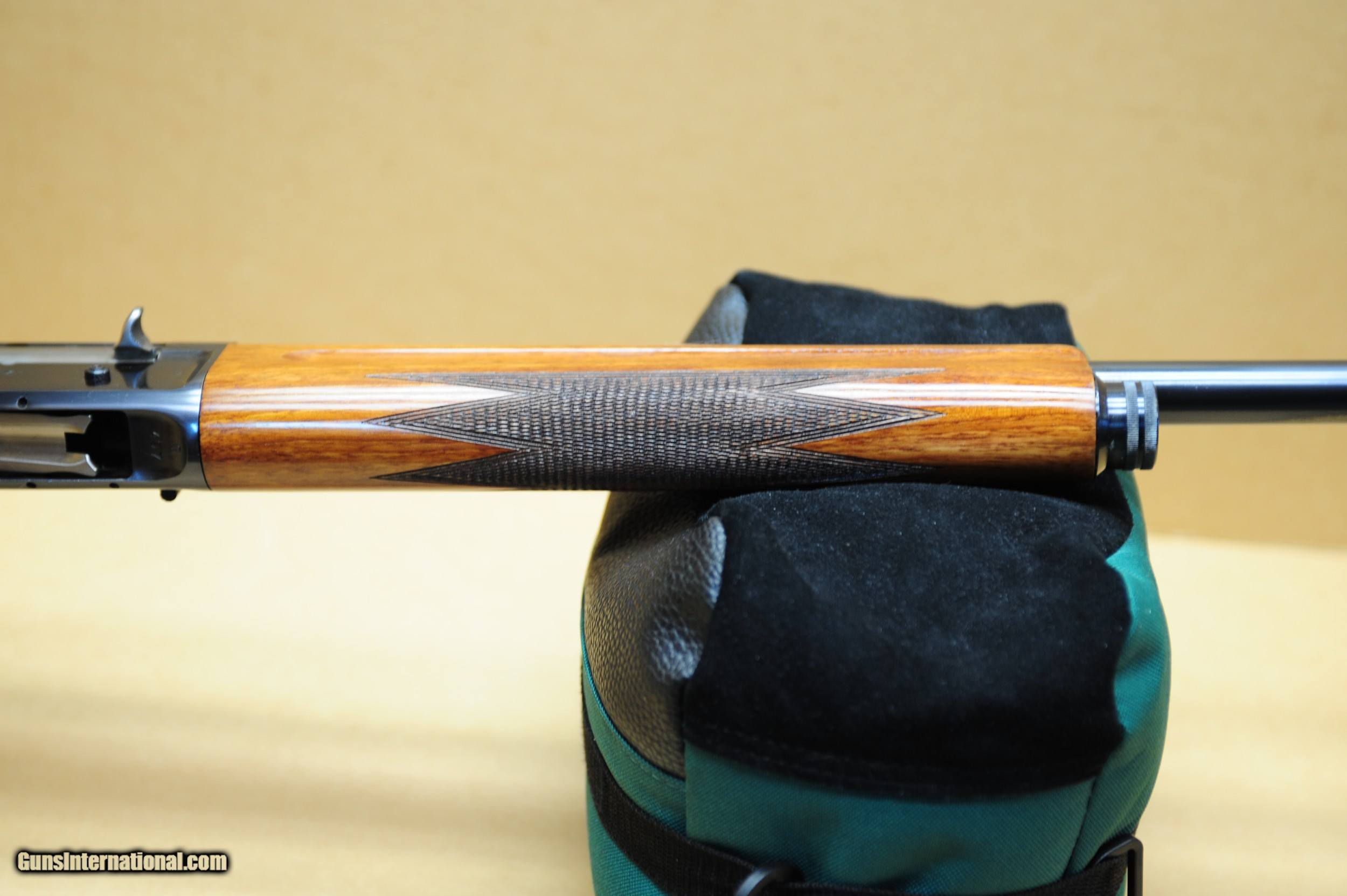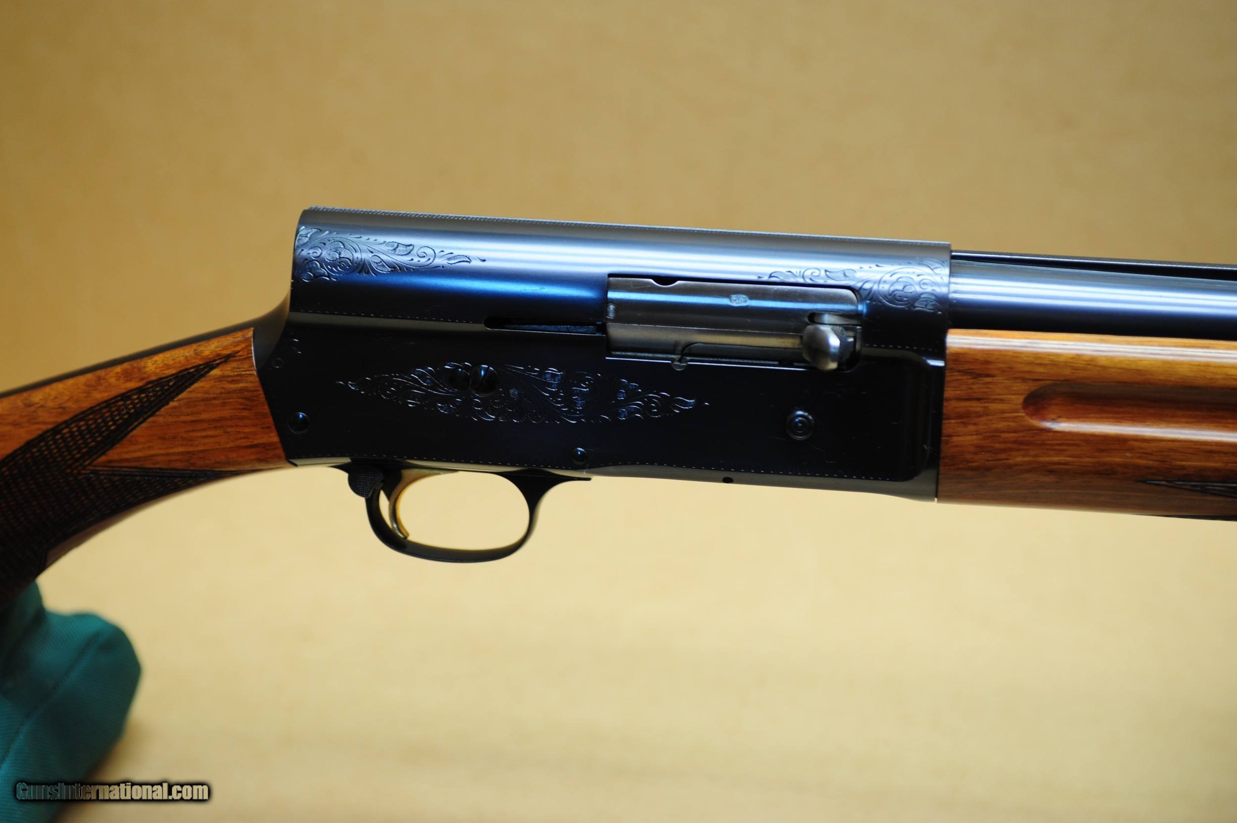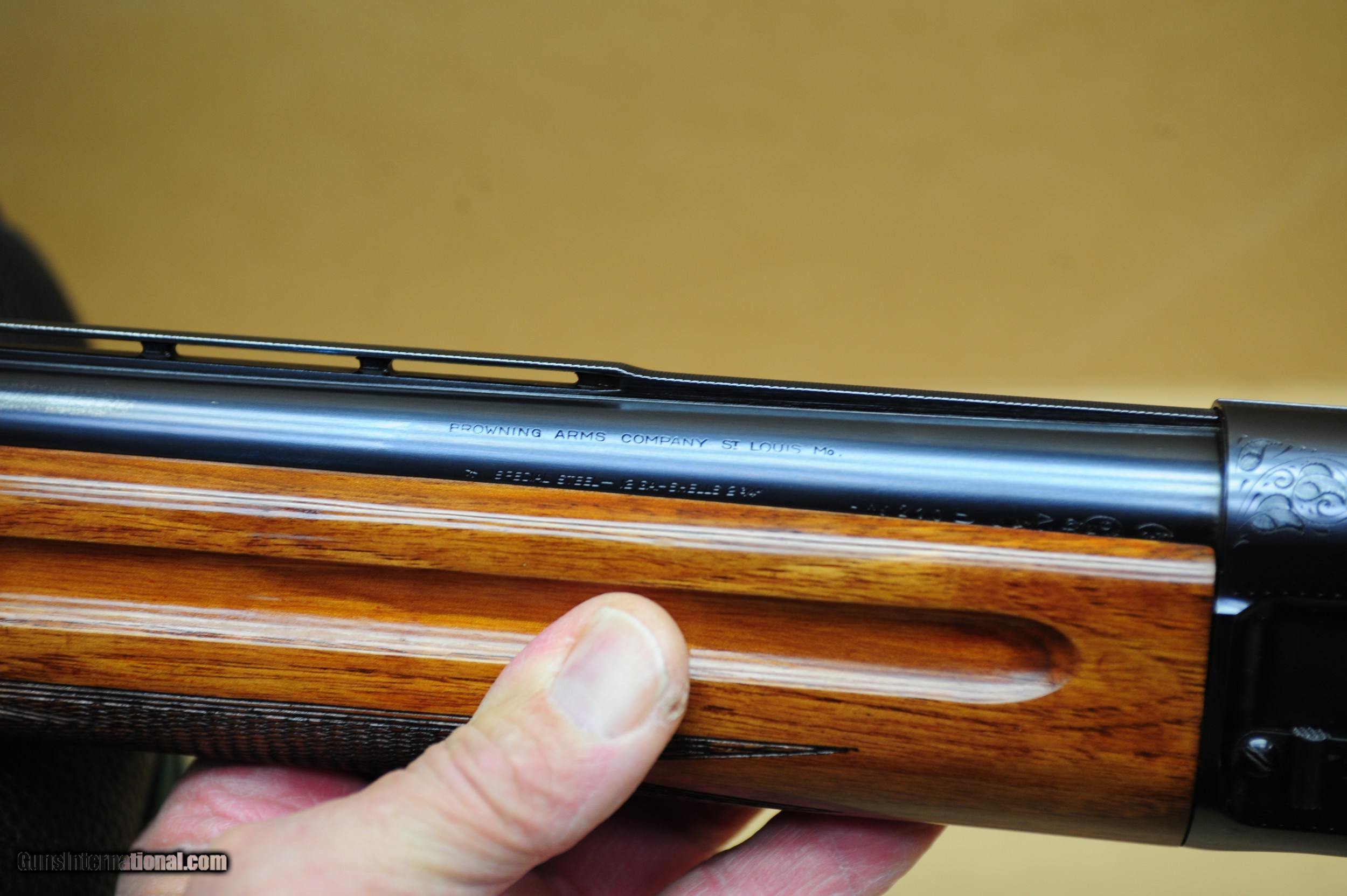Description: Browning A5 semi-automatic shotgun. 30" vent rib barrel with a Full choke. Serial number G 4xx. Made in 1956. The barrel is marked Browning Arms Co. St. Louis Mo.. The shotgun shows very little wear from being fired. The gold trigger shows no wear. The barrel usually shows wear of the blueing from being fired, because of the friction between the forearm wood and the metal from the recoil action of the gun. The barrel shows no wear. The wood shows no marks or wear of the finish. The checkering is sharp and has no dents or dings. The shotgun has the original magazine plug. A 64 year old shotgun that shows little to no wear what so ever. $1995.00 plus shipping SOLD |