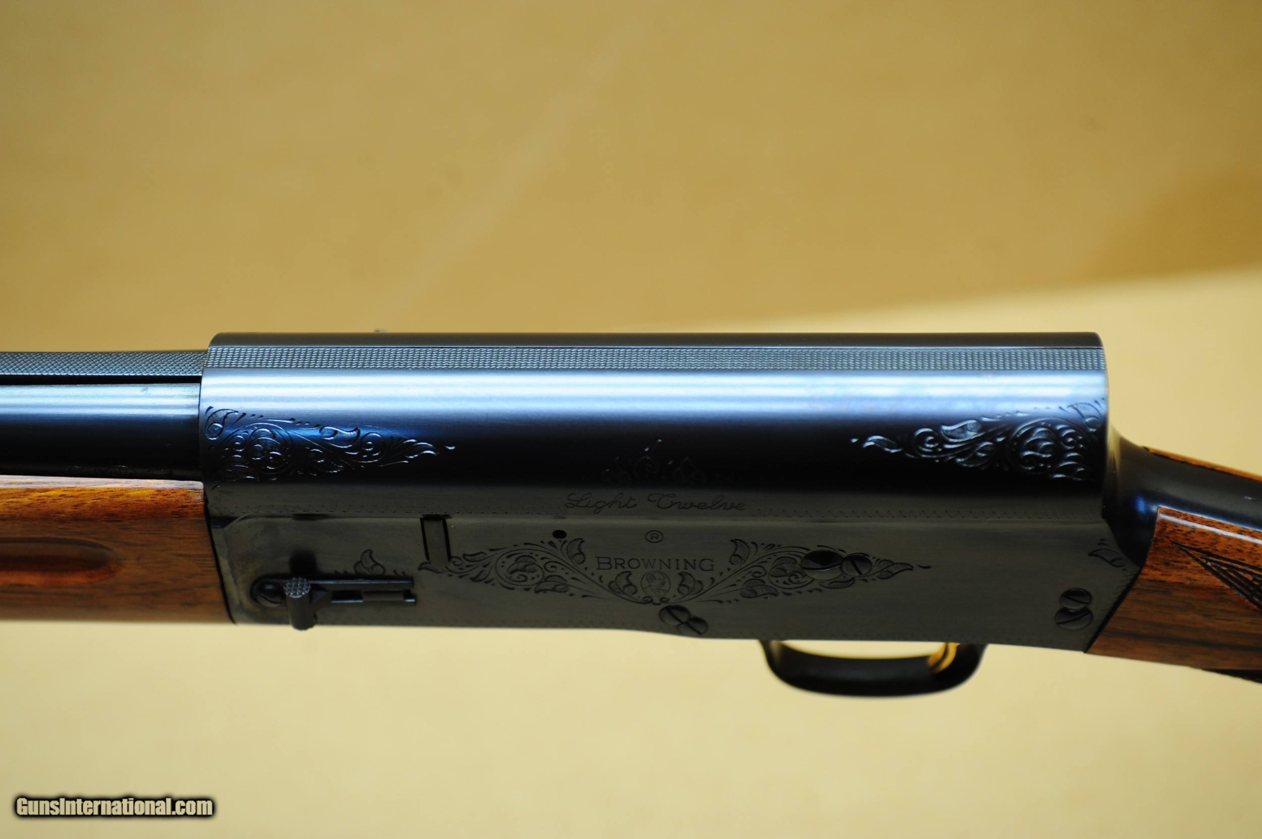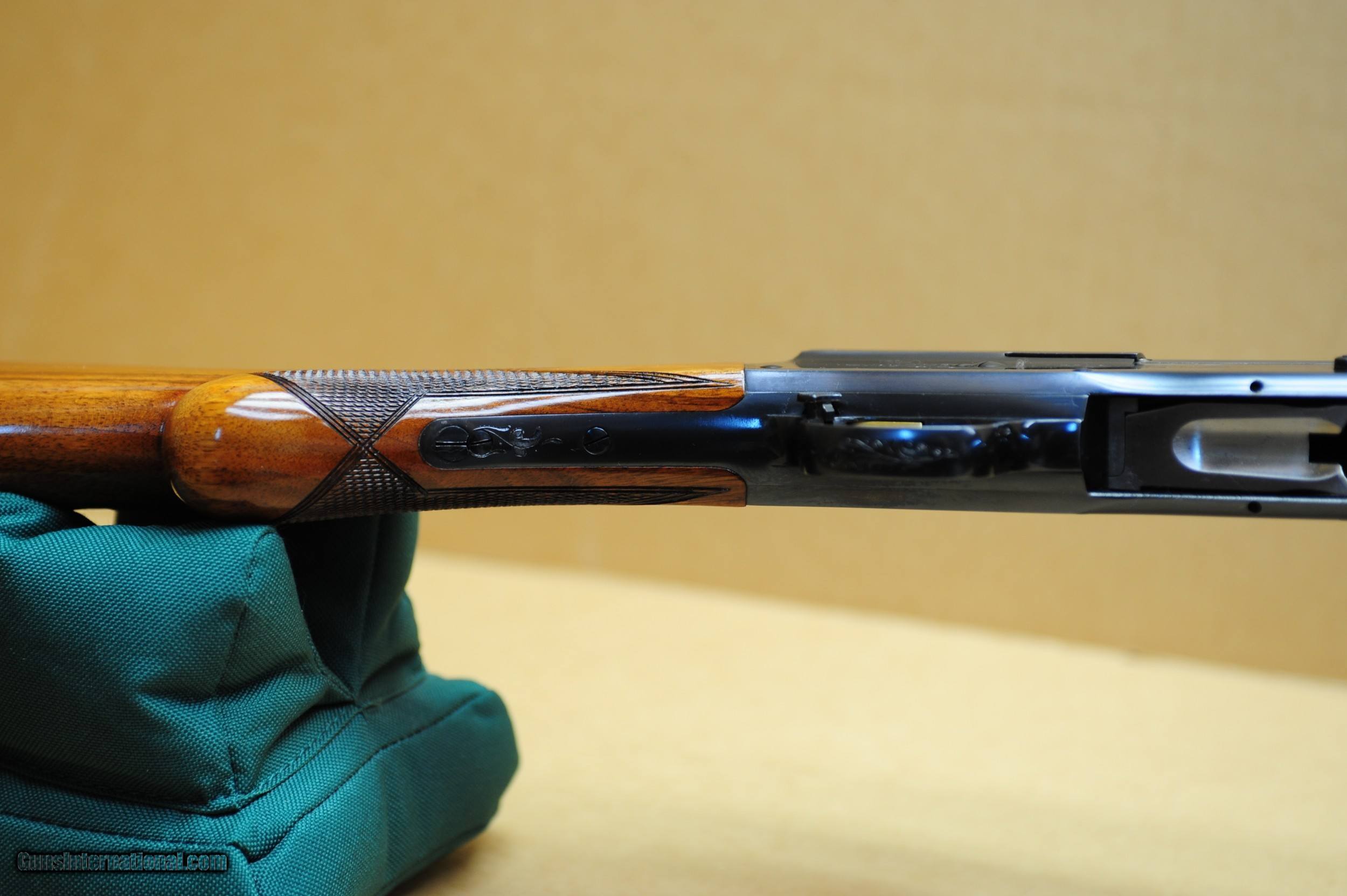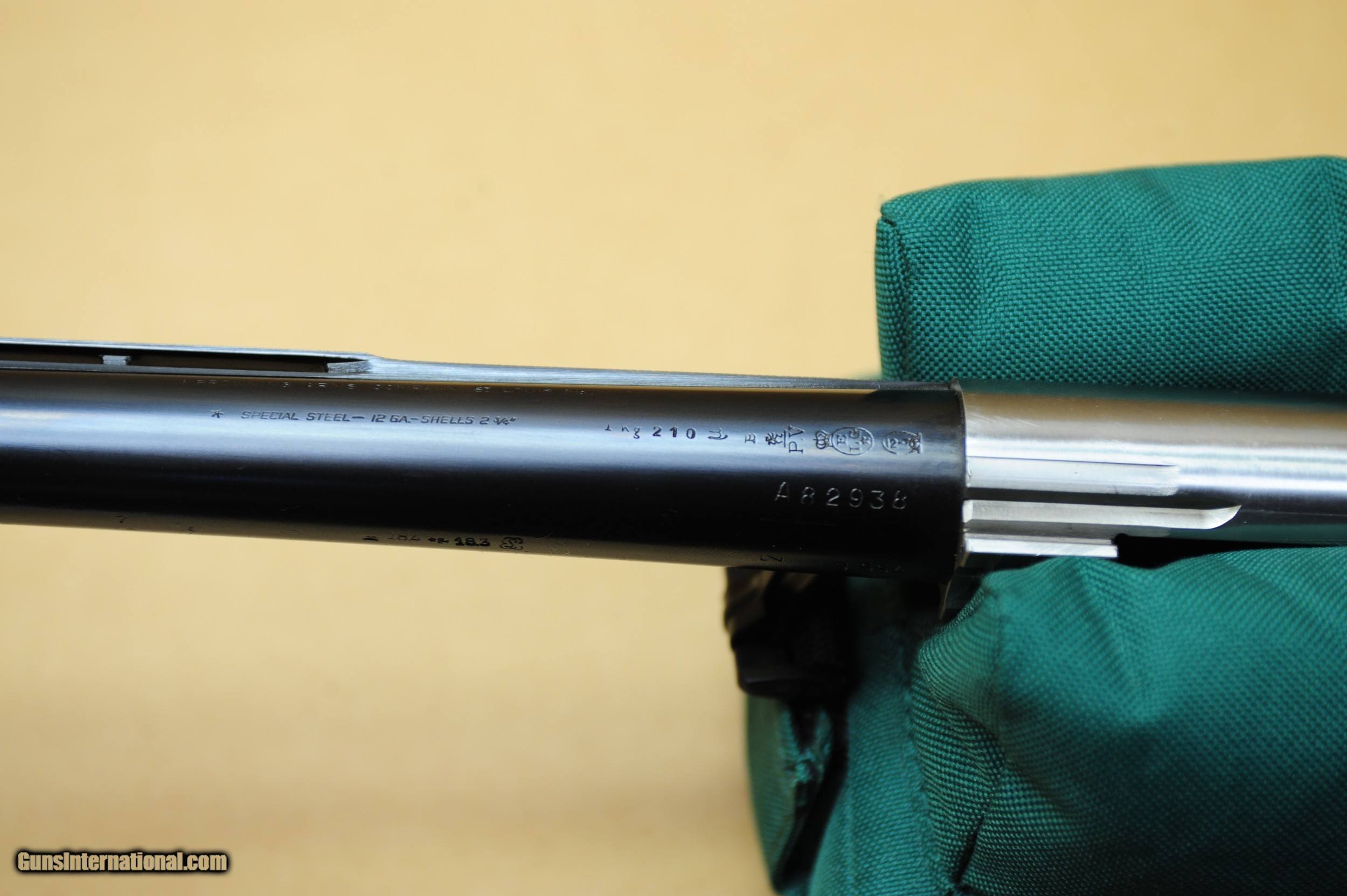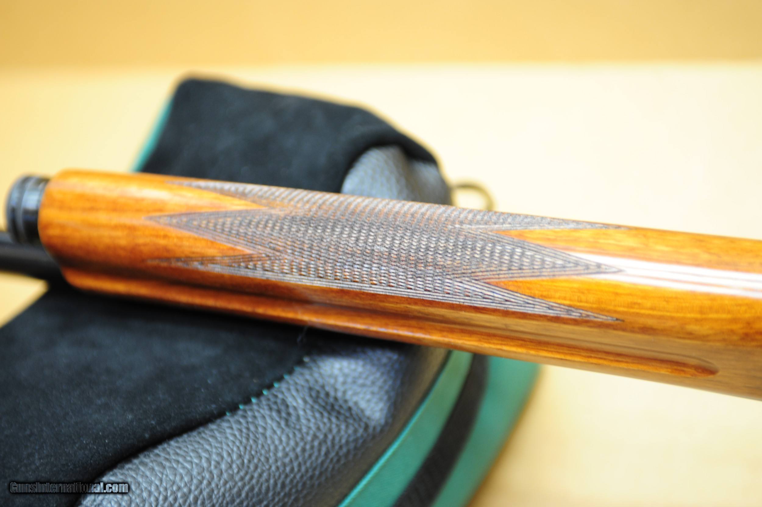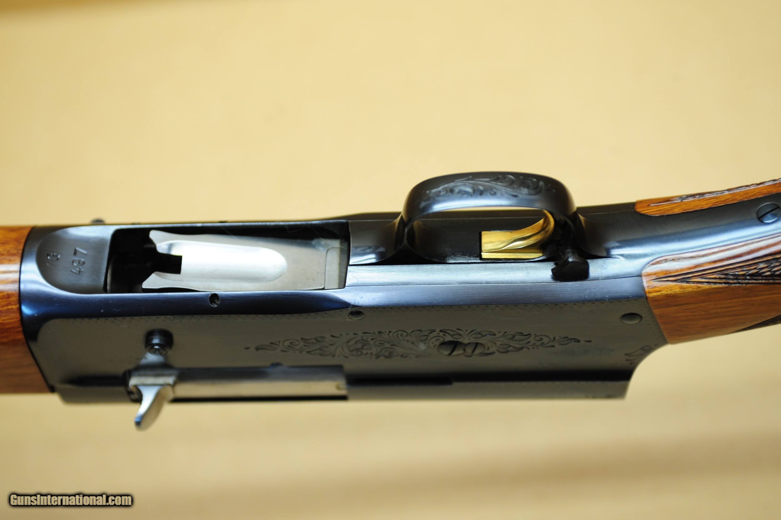 Description: Browning A5 semi-automatic shotgun. 30" vent rib barrel with a Full choke. Serial number G 4xx. Made in 1956. The barrel is marked Browning Arms Co. St. Louis Mo.. The shotgun shows very little wear from being fired. The gold trigger shows no wear. The barrel usually shows wear of the blueing from being fired, because of the friction between the forearm wood and the metal from the recoil action of the gun. The barrel shows no wear. The wood shows no marks or wear of the finish. The checkering is sharp and has no dents or dings. The shotgun has the original magazine plug. A 64 year old shotgun that shows little to no wear what so ever. $1995.00 plus shipping SOLD |