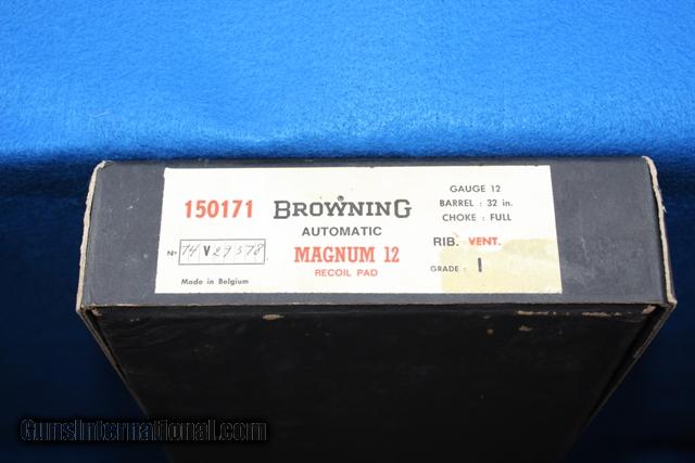 Description: BROWNING A5 MAGNUM, 12 GA, BELGIUM MFG 1974, 14.25" L.O.P., 3" CHAMBER, 32" BARREL, VENTILATED RIB, WITH ORIGINAL BOX. 98% CONDITION ADD 3% FOR CREDIT CARDS SHIPPING $25.00 SOLD |