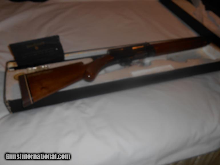Description: Browning a5 belgium 12 gauge magnum in original box.This gun was made in 1966 the last of the round knob guns and it is in the original box. The box is not in the greatest condition but the gun is. It is a 3" magnum 32" full choke but also will shoot 2/3" inch shells as well. The wood is in great condition with some very light handling marks and there are some firing marks on the back of the barrel also one small mark on the left side of the receiver and that was from storage. It has seen some action and I would be surprised if it has had more than 1 box shot through it. Great gun will increase over time or use it for what it was intended for. SOLD |
