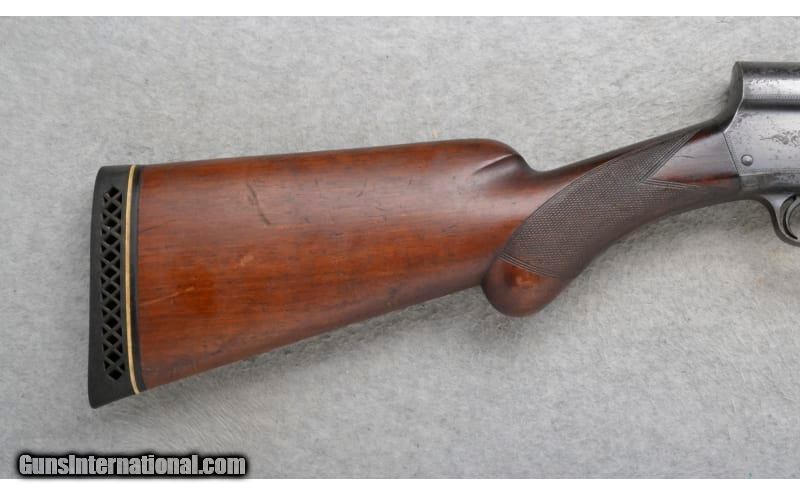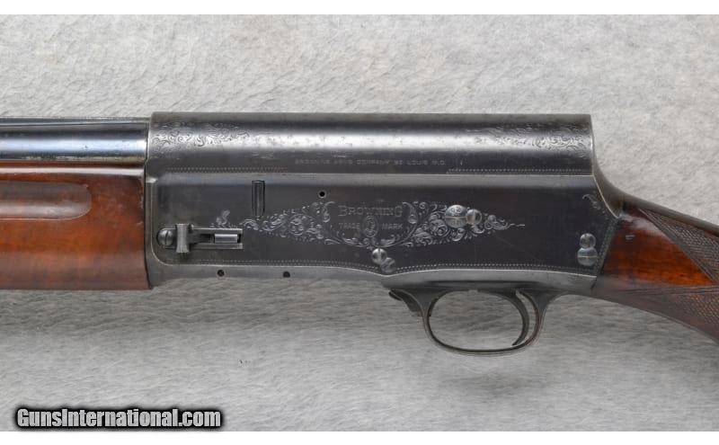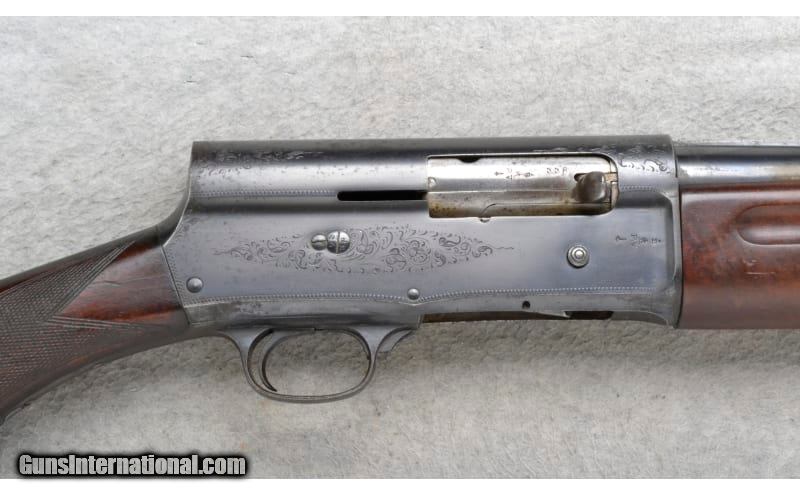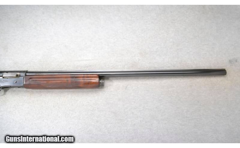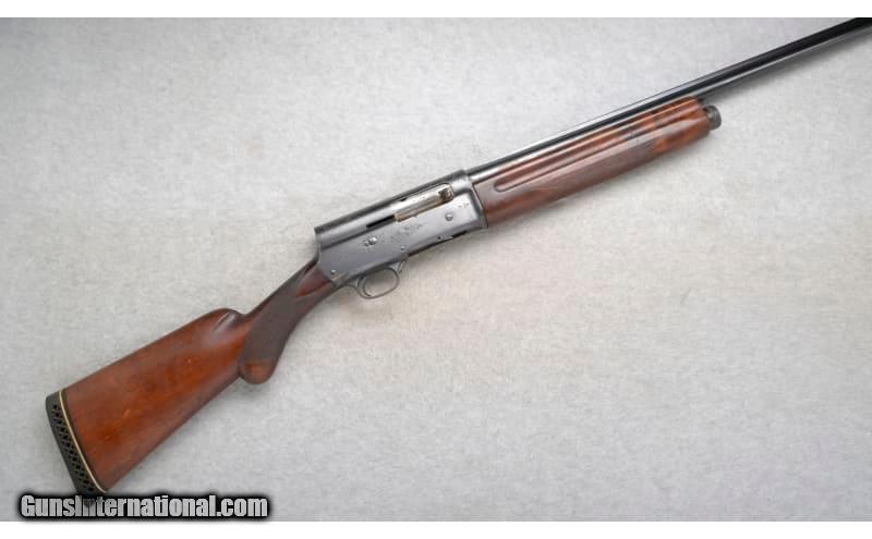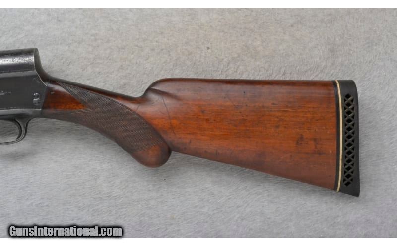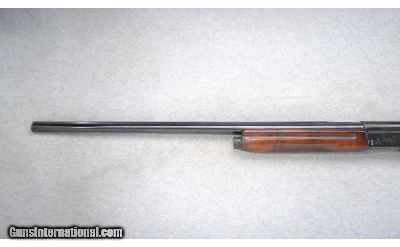 Description: This Browning Model Auto-5 is a right hand semi-auto shotgun in 12 Ga. It has a 31.5 inch barrel with a solid rib. A metal bead front sight. With a 2 3/4 chamber it has a fixed Full choke. The butt stock is a checkered grip walnut round knob pistol grip. The forearm is a checkered grip walnut with finger grooves. The receiver is lightly engraved. Made in Belgium. S/N 229338. 12 Gauge SOLD Chambers: 2 3/4 inch. Metal Condition: Fair. Has a lot of light freckling and 3 very small dents on the bottom of the barrel bore side. Wood Condition: Fair. Many light handling marks. 1.5 inch crack right side forearm at barrel. Bore Condition: Shiny. Barrels: 31.5 inch barrel with a solid rib. Stock Dimensions: LOP 14 inches. Fore End: Checkered grip walnut with finger grooves. Butt Pad: Pachmayr White Line black rubber recoil pad. Weight: 8 lb. 10 oz. Sights: Metal bead front sight. Chokes: Fixed Full Item Location: Richfield, WI |