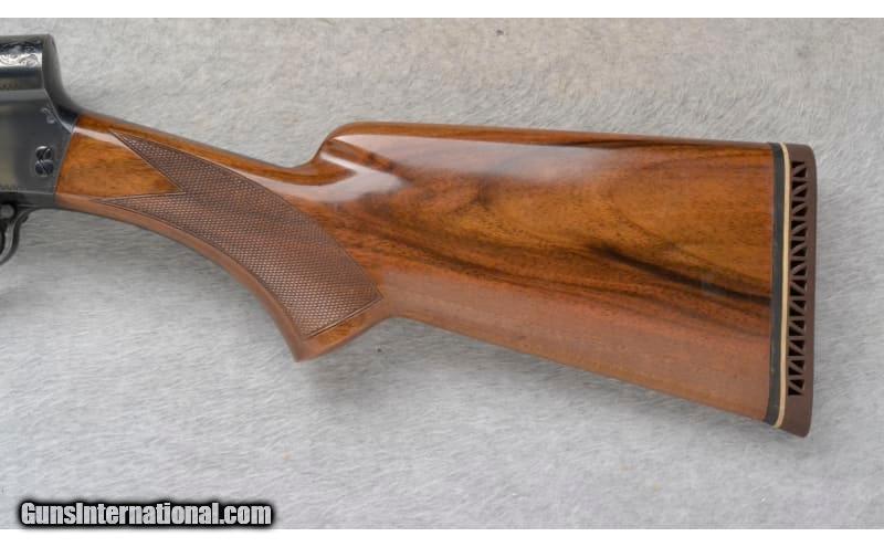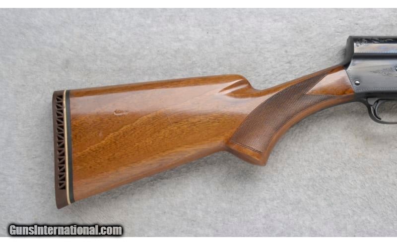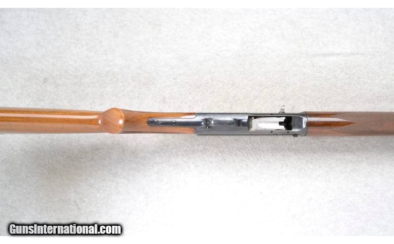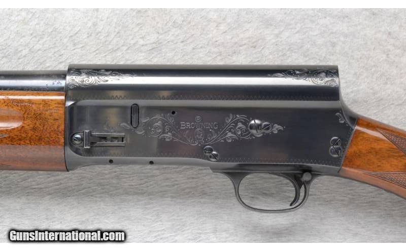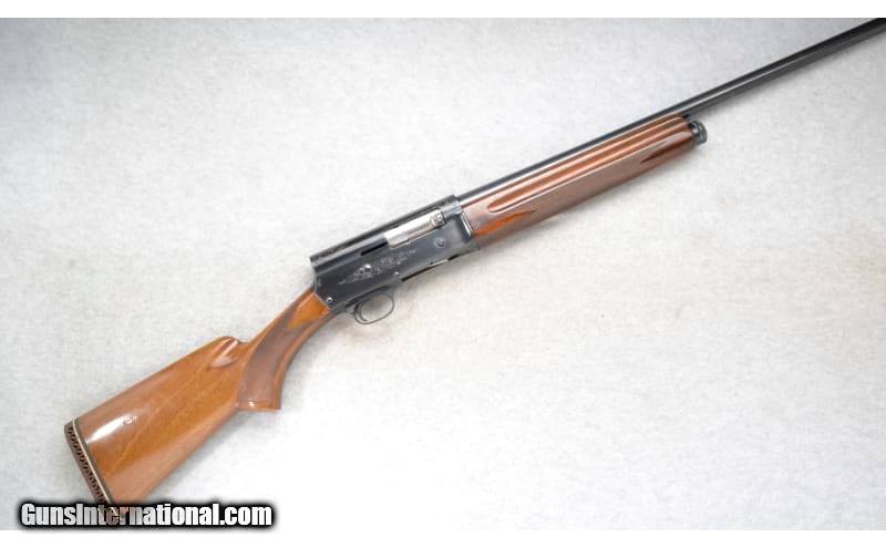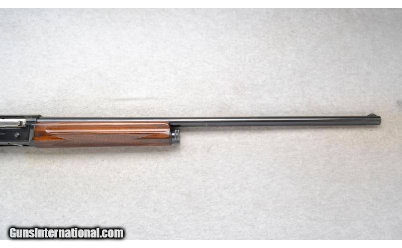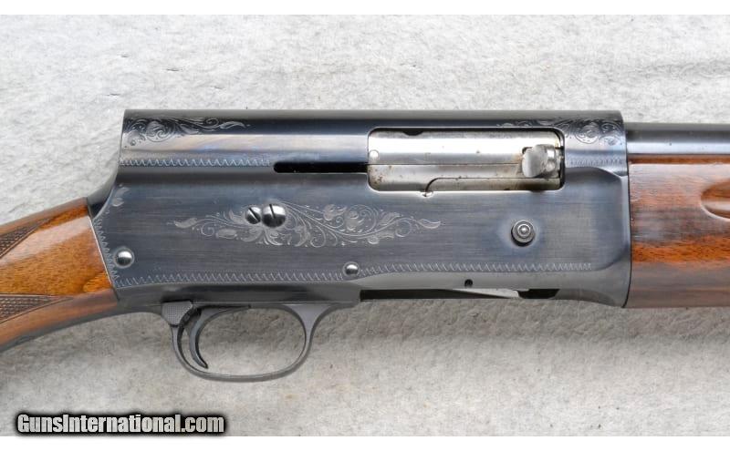 Description: This Browning Model Auto-5 is a right hand semi-auto shotgun in 12 Ga. It has a 29.5 inch barrel. A raised metal bead front sight. With a 2 3/4 inch chamber it has a fixed Full choke. The butt stock is a checkered grip walnut pistol grip. The forearm is a checkered grip walnut with finger grooves. The receiver is lightly engraved. Made in Belgium. 12 Gauge SOLD Chambers: 2 3/4 inch. Metal Condition: Receiver is excellent. Barrel is good with light use marks. Wood Condition: Good. Light use marks and very fine line cracks in the lacquer top finish. Bore Condition: Shiny. Barrels: 29.5 inch. Stock Dimensions: LOP 13 1/2 inches. Fore End: Checkered grip walnut with finger grooves. Butt Pad: Pachmayr brown rubber recoil pad. Weight: 8 lb. 4 oz. Sights: Raised metal bead front. Chokes: Fixed Full. Item Location: Richfield, WI |