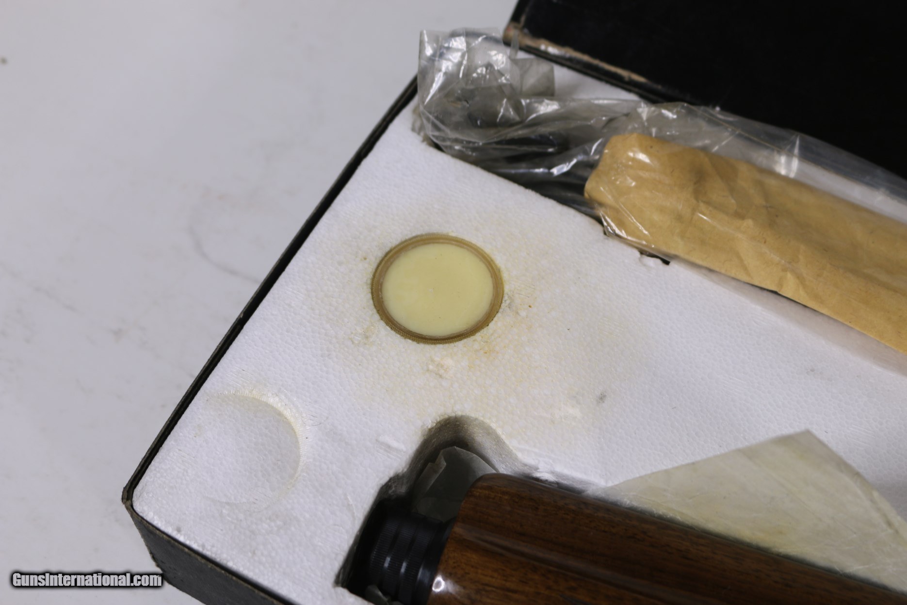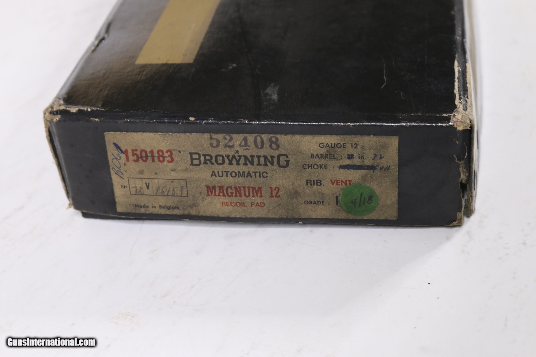 Description: MADE IN BELGIUM IN 1972. BARREL IS 32 INCHES WITH A VENT RIB AND CHOKED FULL. 99% AND ALL FACTORY. PLEASE NOTE GUN WAS IN A HOUSE FIRE AND BOX LABEL HAS BEEN DAMAGED. PLEASE ADD $50 FOR SHIPPING. RETURN POLICY: We offer a 3 day return policy. Items must be returned in the same condition as received. Notification must be made with-in 3 days of receipt at dealer. All fees are non-refundable no exceptions. LAY-A-WAY: We offer a 60 day lay-a-way with a 1/3 up front and 1/3 every 30 days. Once started all sales are final with no exceptions. CONDITIONS OF SALE: Art’s Gun Shop makes no express or implied warranty or representation with respect to items being advertised or sold. In no event shall Art’s Gun Shop be held responsible for correctness of description, representation, or warranty of items sold by them or their representatives. All items sold as collector items. All liability concerning the use of any weapons purchased from Art’s Gun Shop or its representatives is assumed by the purchaser. CONSIGNMENTS: We do not take consignments, but we are strong buyers for collections. We are near the St. Louis area and can travel to the most of the Midwest. Feel free to call 636-944-3630 with any questions. SOLD Manufacturer: BROWNING Model: AUTO 5 Condition: EXCELLENT Metal Condition: EXCELLENT Wood Condition: EXCELLENT Bore Condition: EXCELLENT Action: SEMI Triggers: SINGLE Stock Comb: 1 1/2 '' Stock Heel: 2 1/2 '' LOP: 14 1/8'' Rib: VENT Case: FACTORY BOX |