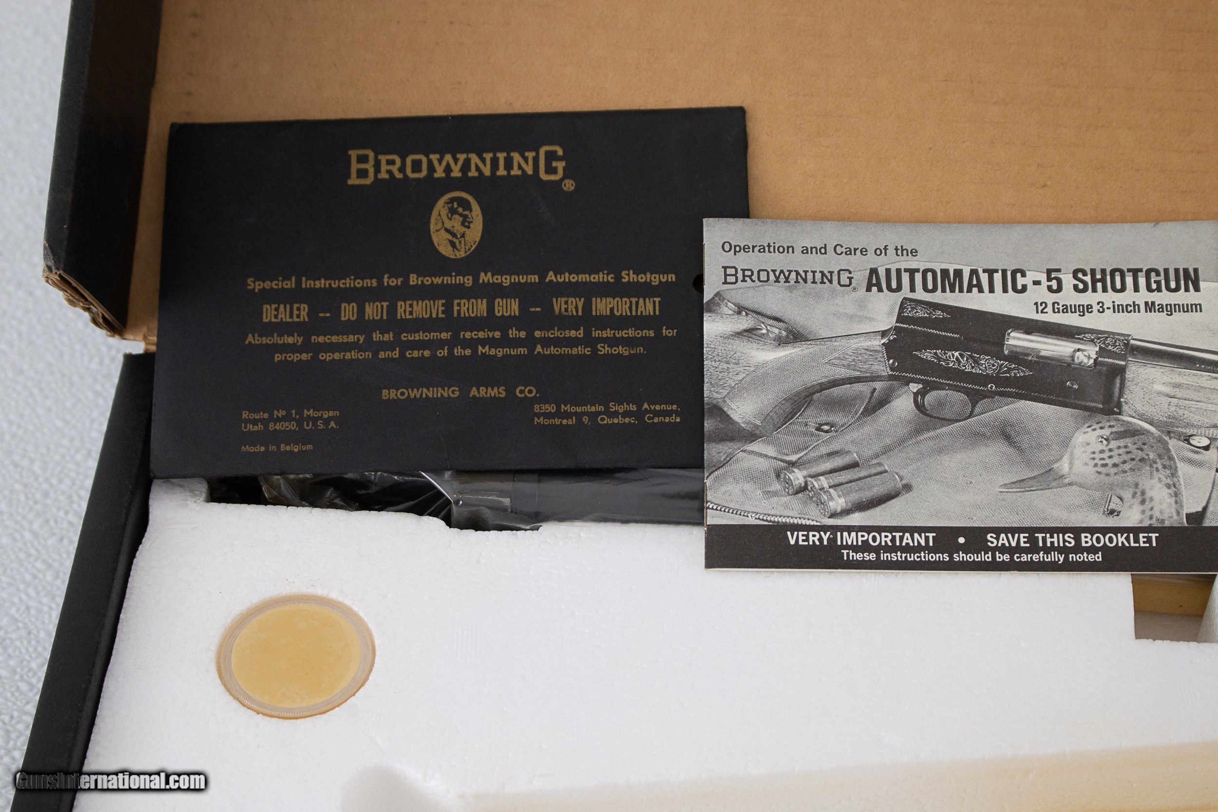 Description: MADE IN BELGIUM IN 1975. BARREL IS 32'' WITH A VENT RIB AND CHOKED FULL. 99.9% AND ALL FACTORY. INCLUDES CORRECT BOX, BOOKLET, AND GREASE. PLEASE ADD $75 FOR SHIPPING. SOLD Shotgun Gauge: 12 Gauge Manufacturer: BROWNING Model: AUTO 5 Condition: EXCELLENT Metal Condition: EXCELLENT Wood Condition: EXCELLENT Bore Condition: EXCELLENT Action: SEMI Stock Comb: 1 1/2'' Stock Heel: 2 1/2'' LOP: 14 1/4'' Extras: BOOKLET AND GREASE Case: FACTORY BOX |