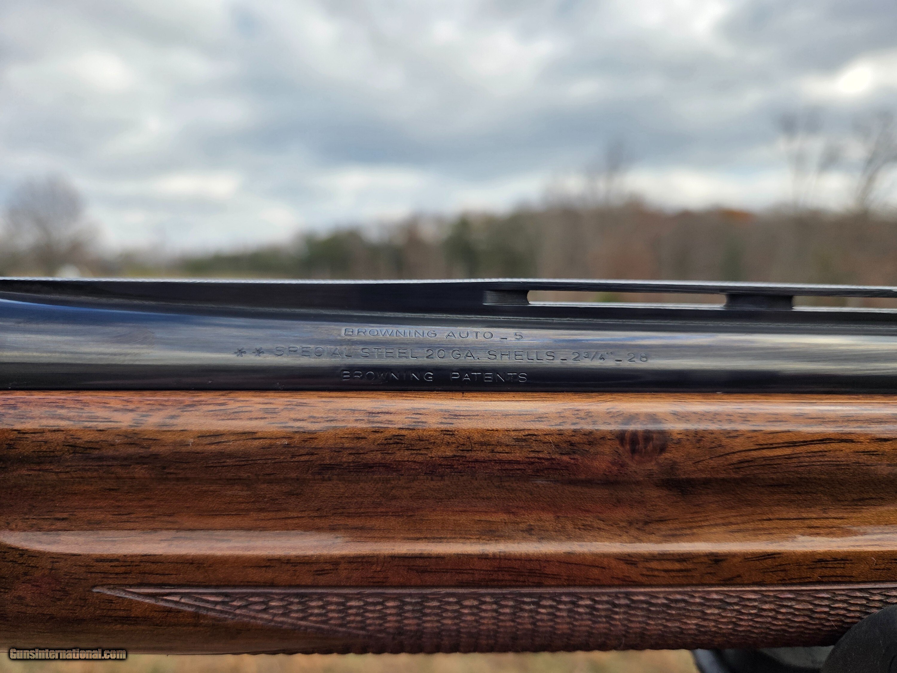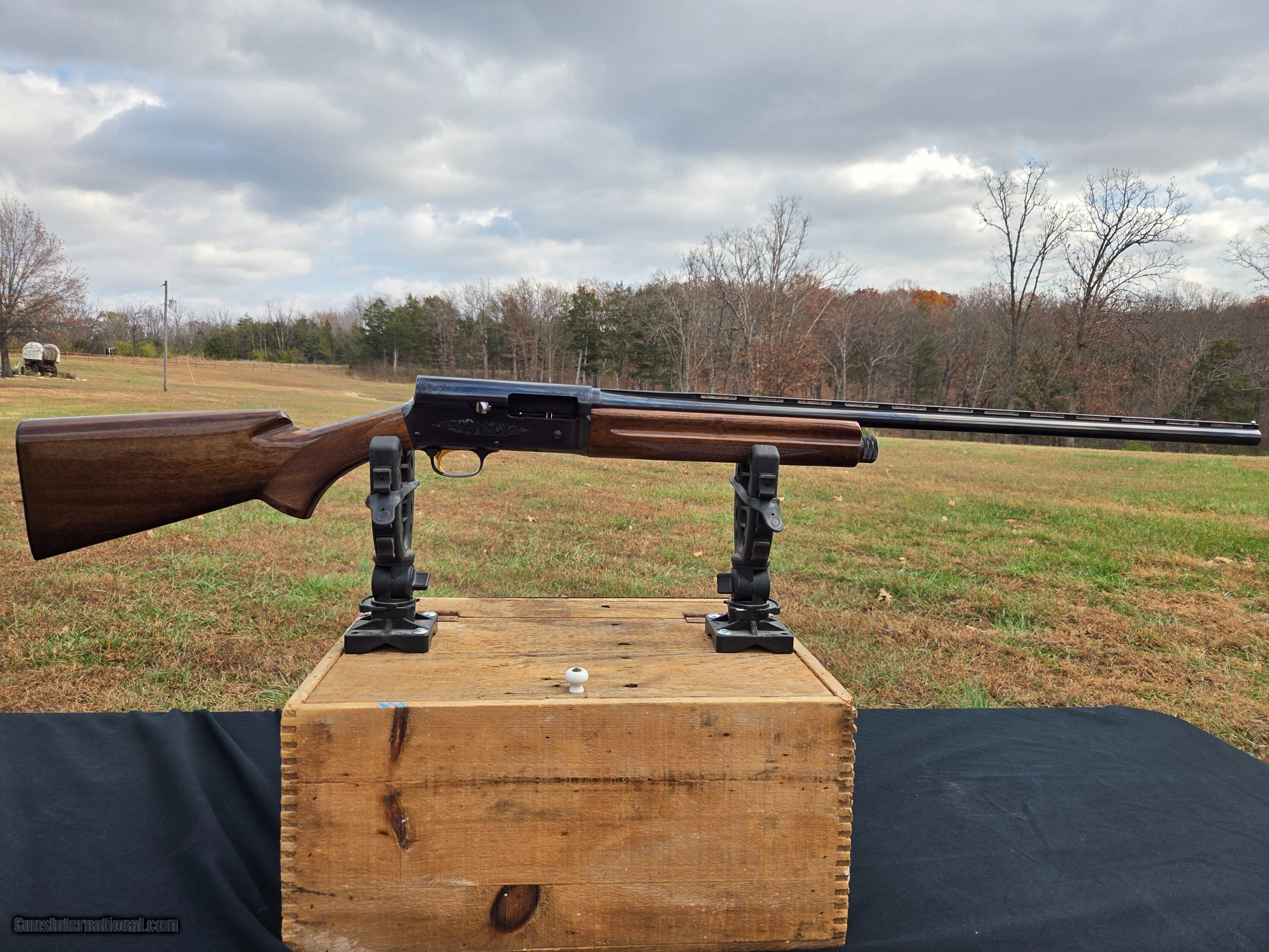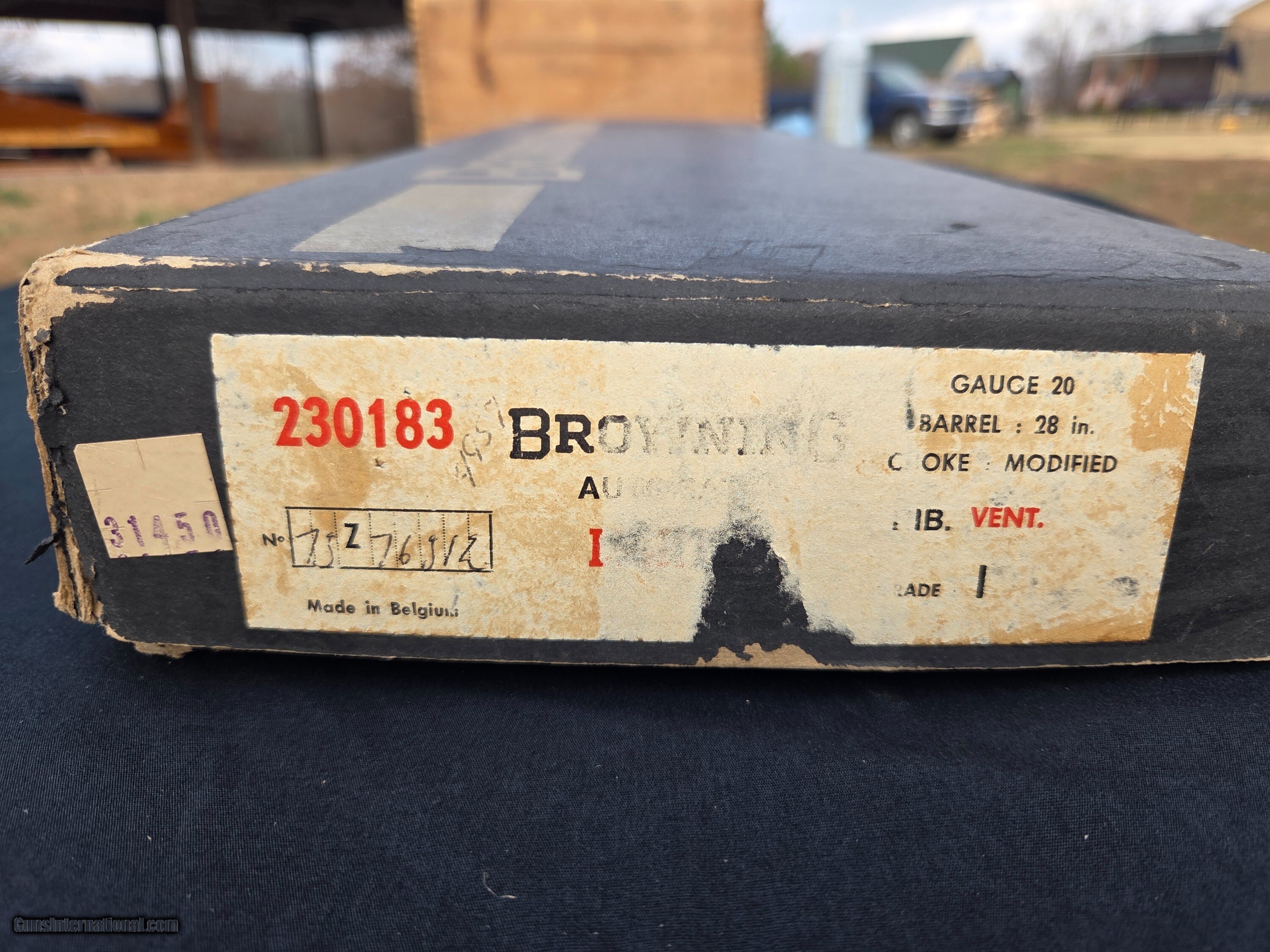 Description: Belgium made Browning Auto 5 20 gauge in the box from 1973. This gun is all factory but does show some handling marks, more so in the wood than the metal. The box is correct and does match the gun. The barrel is 28" with 2 3/4" chambers and a modified choke. Length of pull is 14.25". Great addition to and collection and great investment piece. Please add $100 for shipping and 3% when paying with a card. Shotgun Gauge: 20 Gauge Price: $4,400.00 Shipping: $100.00 Contact Seller |