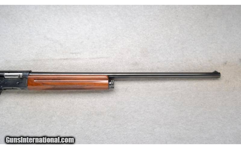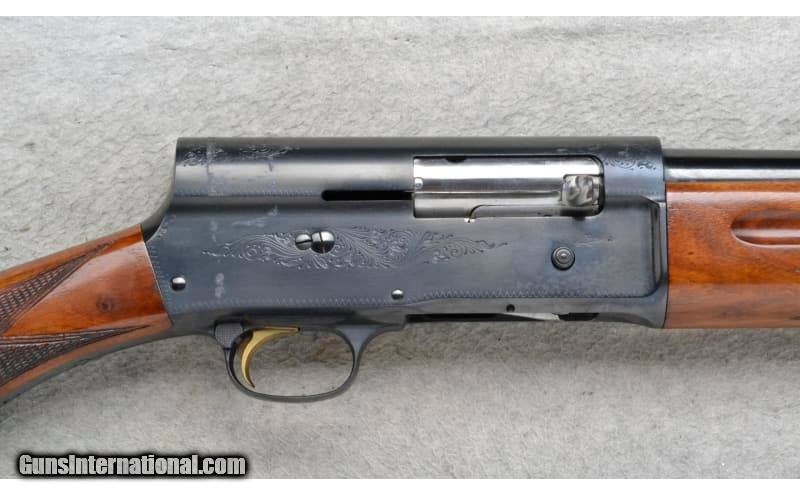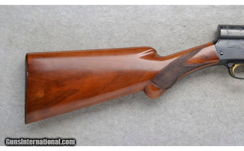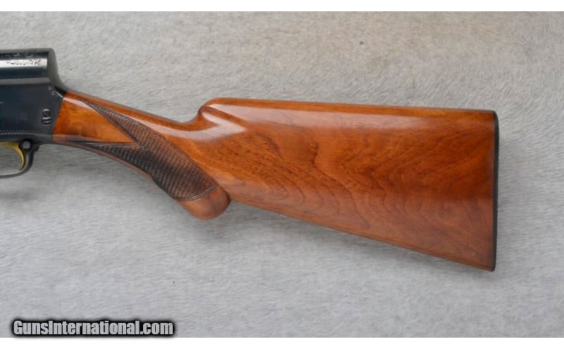 Description: This Browning Model Auto-5 Light Twelve is a right hand semi-auto shotgun in 12 Ga. It has a 27.5 inch barrel with a knurled top. A raised metal bead front sight. With a 2 3/4 inch chamber it comes with a Fixed IM Choke. The butt stock is a checkered grip walnut round knob pistol grip. The forearm is a checkered grip walnut with finger grooves. It has a lightly engraved receiver. Serial Number G48645. Made in Belgium. 12 Gauge SOLD Chambers: 2 3/4 inch. Metal Condition: Good. Looks like old freckling has been reblued on the receiver. Wood Condition: Very Good. Some light handling marks. Bore Condition: Shiny. Barrels: 27.5 inch barrel with a knurled top. Stock Dimensions: 14 1/2 inches. Fore End: Checkered grip walnut with finger grooves. Butt Pad: FN Browning Automatic black plate. Weight: 7 lb. 8 oz. Sights: Raised metal bead front. Chokes: Fixed IM choke. Item Location: Richfield, WI |