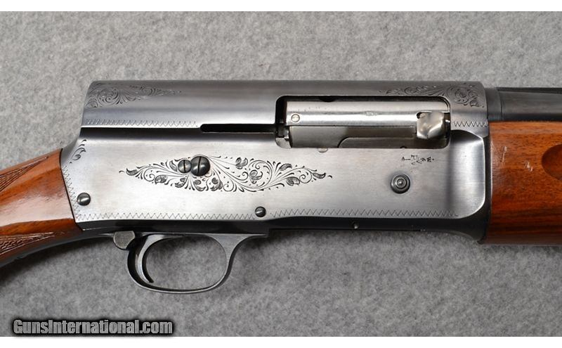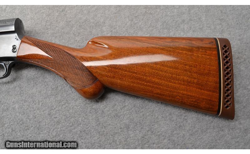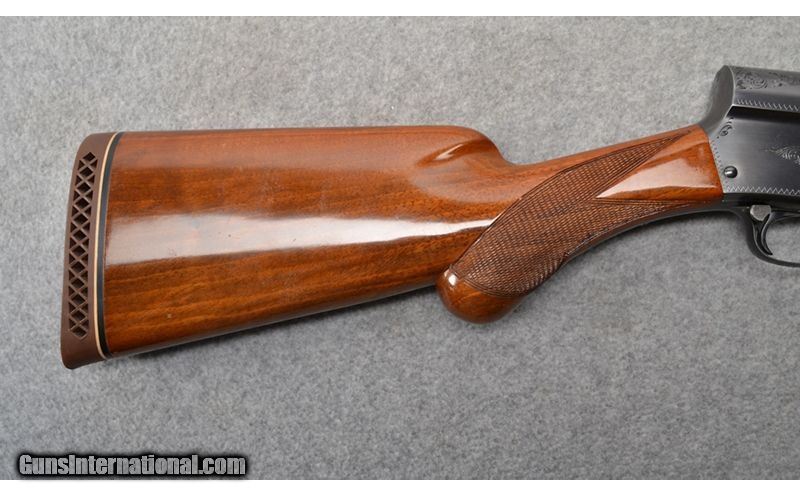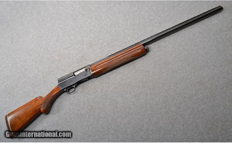 Description: Browning Auto 5 Magnum semiautomatic in 12 gauge with 29 1/2" barrel and 3" chamber. Receiver and barrel bluing is in excellent condition. Bore is bright and shiny with no rings, dings, dents, or bulges noted. Barrel is fixed choked full. Checkered pistol grip stock and checkered fore end are in great shape. A few handling marks and dings are noted, but none that go through the finish. Raised matte vent rib with single bead. Manufactured in Belgium in 1962. 12 Gauge SOLD Chambers: 3" chamber. Metal Condition: "Receiver and barrel are in excellent condition. No scratches, dings, or dents noted. Wood Condition: "Fore end has a few light handling marks and dings, but nothing that goes through the finish. Checkered pistol grip stock also has a few handling marks and dings, but nothing that goes through the finish. Bore Condition: "Bore is bright and shiny with no dings, dents, rings, or bulges noted. Barrels: 29 1/2" barrel. Triggers: Smooth faced trigger. Stock Dimensions: "14"" LOP, 1 5/8"" DAC, 2 1/4"" DAH Fore End: Gloss finish checkered fore end. Butt Pad: Browning factory rubber recoil pad. Weight: 9 lb Sights: Raised vent matte rib with single metal bead. Chokes: Fixed full choke. Item Location: Mitchell, SD |