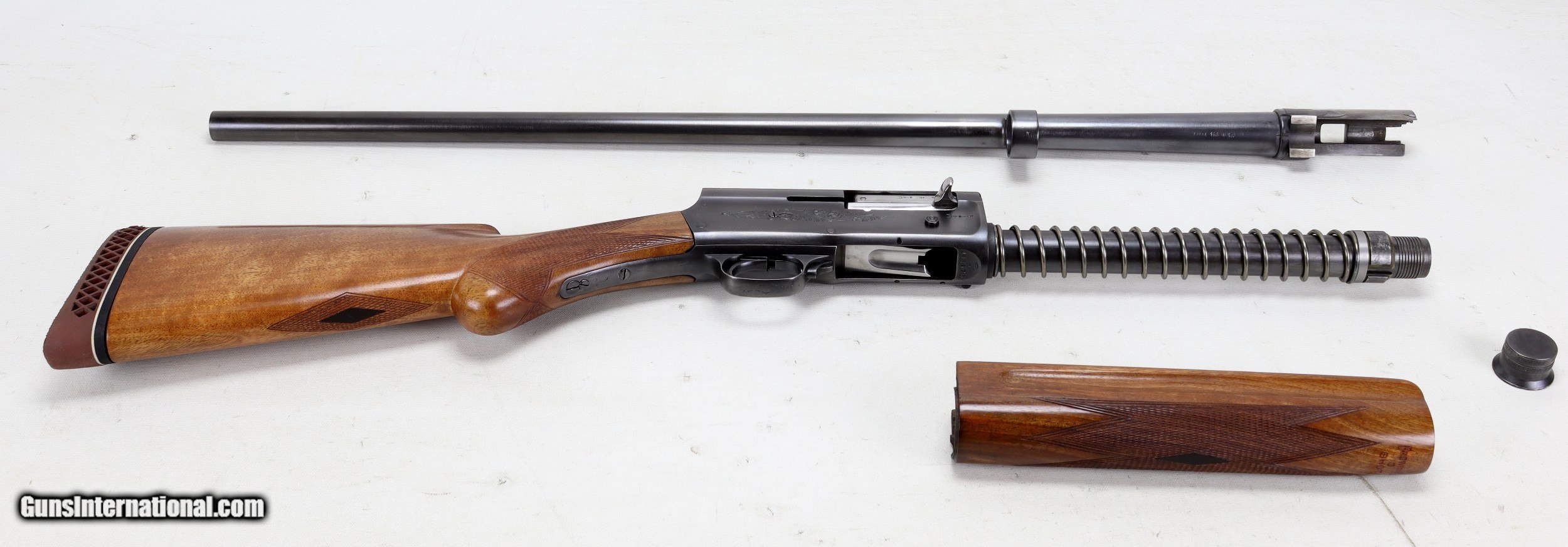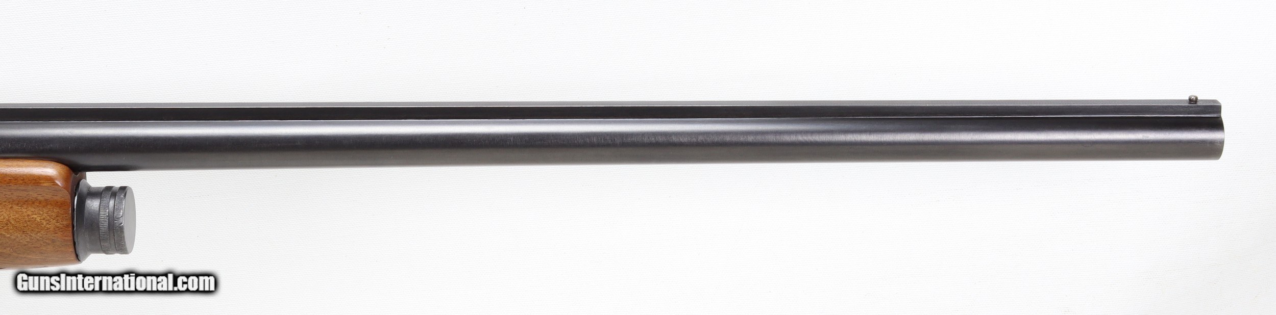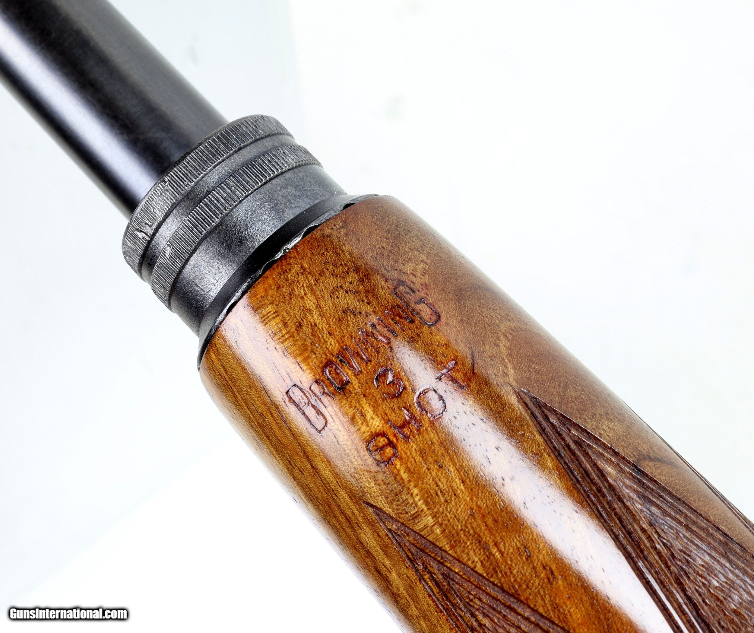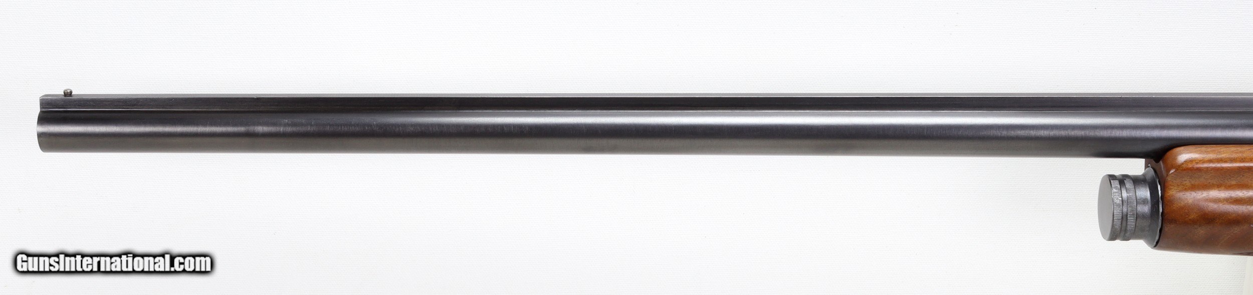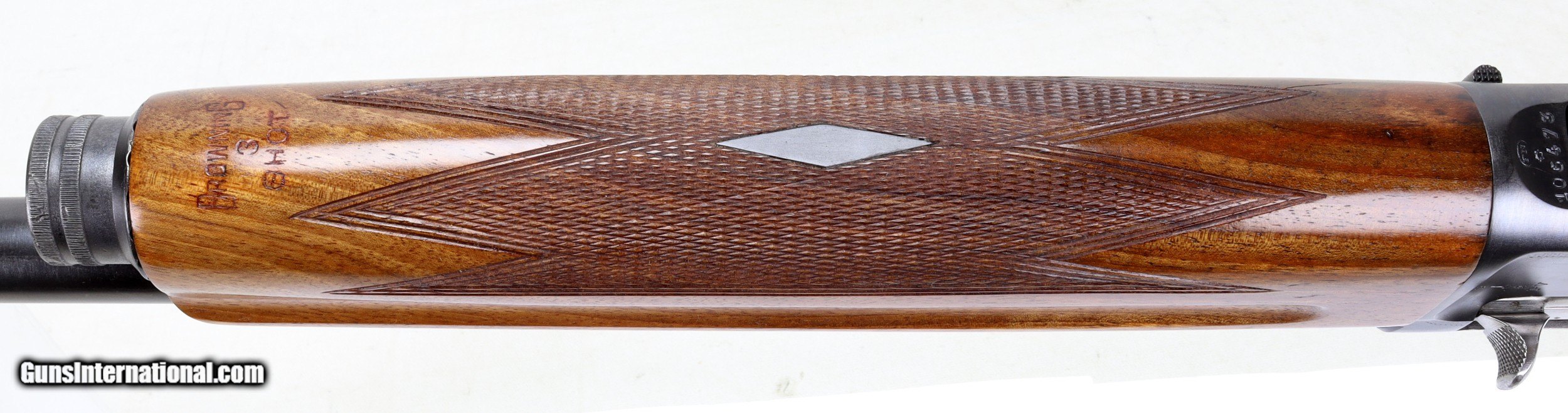 Description: Browning Auto-5 Standard Semi-Auto Shotgun in 16Ga. SN #106473. Made in Belgium 1932-1940. INTRODUCED AS THE THREE SHOT, PRIOR TO INTRODUCTION OF SWEET 16", LOP 13 3/4". Chamber is 2 3/4". Choke is Extra Full (.035). DAH 2 1/2". DAC 1 5/8". 27 1/2" Solid Raised Ribbed Barrel with a VERY GOOD to EXCELLENT Bore for it's age. Both the Blued Metal and Round Knob Checkered Pistol Grip Stock and Forend have been FULLY RESTORED by SHOOTER'S EXCHANGE and LOOK GREAT. This Early A-5 16Ga. has the safety in front of the trigger guard. Browning 3 shot marked on underside of forend. Custom Checkering with Diamond on Stock and Forend. Browning Recoil Pad. Has Magazine Tube Cutoff. Screws on Receiver marked with Serial Number. Weight: 7.7 lbs. Trigger Pull: 3 3/4 lbs. More photos available upon request. Ships to Lower 48 W/ Insurance $55.00. SOLD Curio/Relic: Yes Shotgun Gauge: 16 Gauge Manufacturer: Browning Model: Auto-5 Serial Number: 106473 Barrel Length: 27 1/2 Chambers: 2 3/4 Condition: Excellent Metal Condition: Refinished Wood Condition: Refinished Bore Condition: VG to Excellent For Age Action: Semi Auto LOP: 13 3/4 Rib: Solid Finish: Blue Weight: 7.7 lbs. Manufacture Date: 1932-40 |