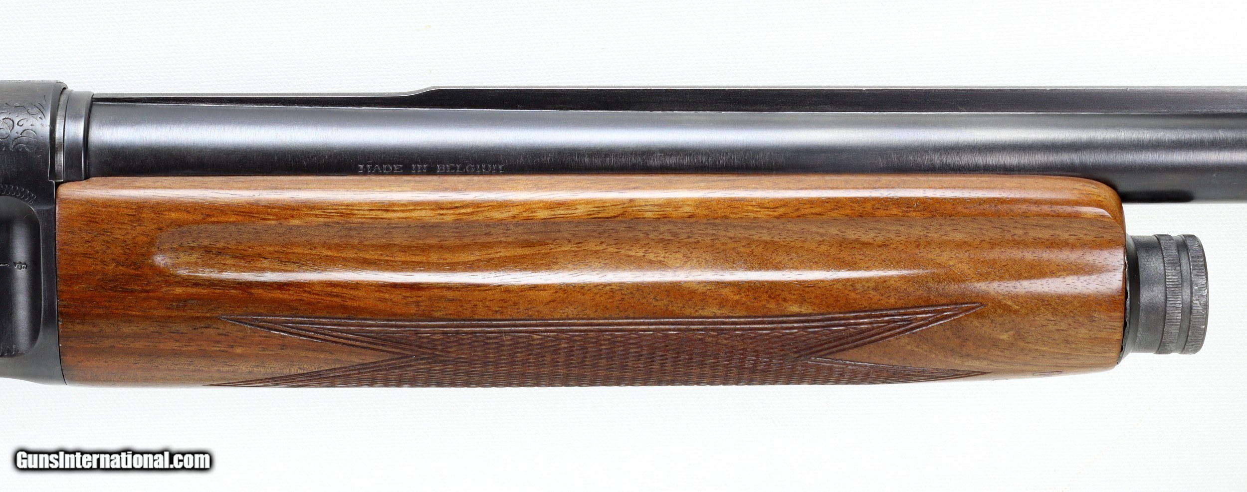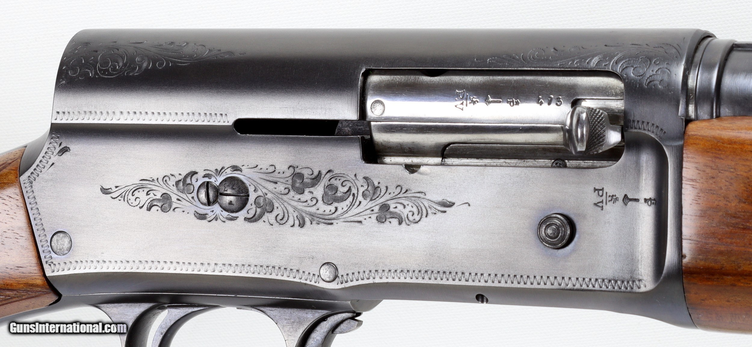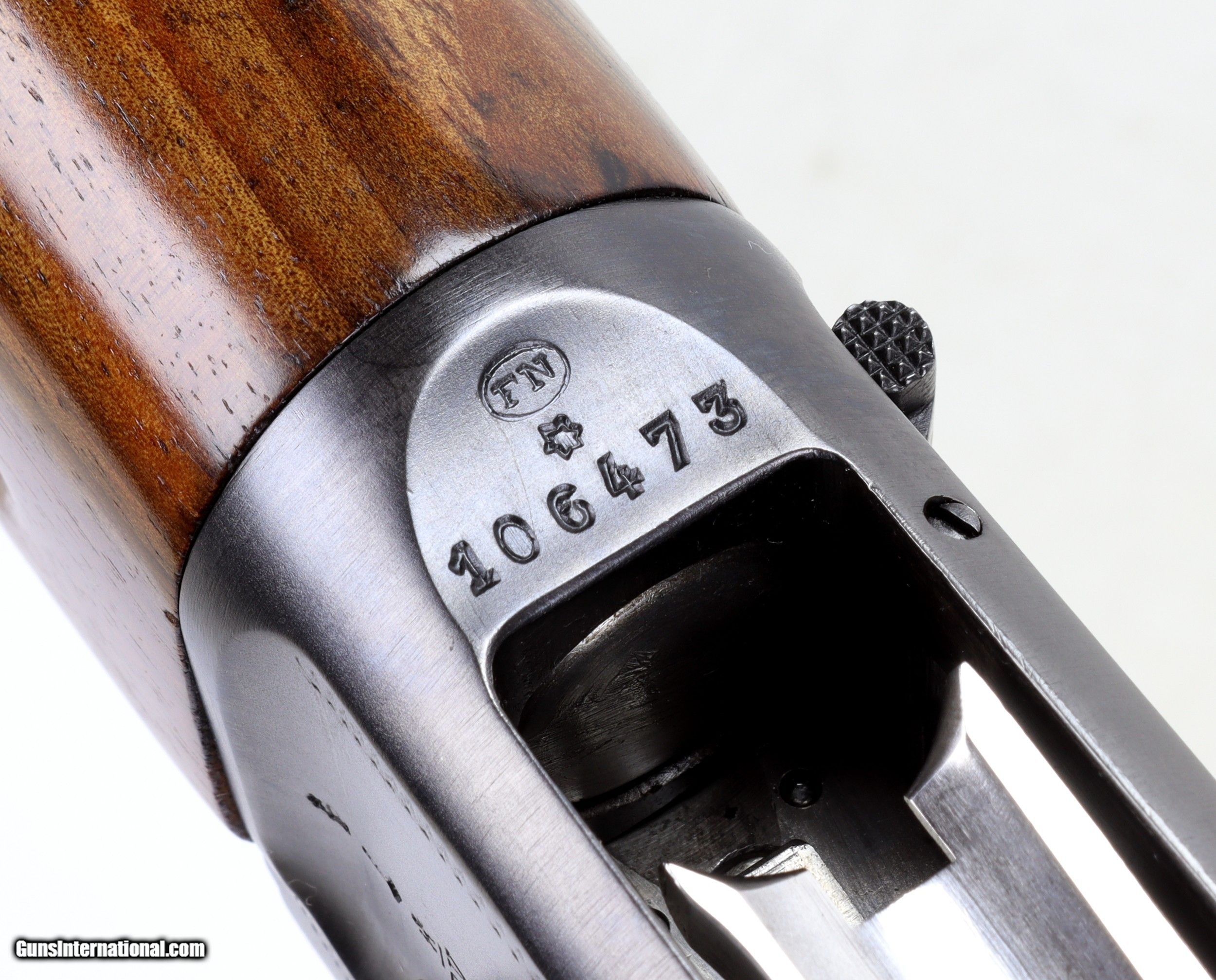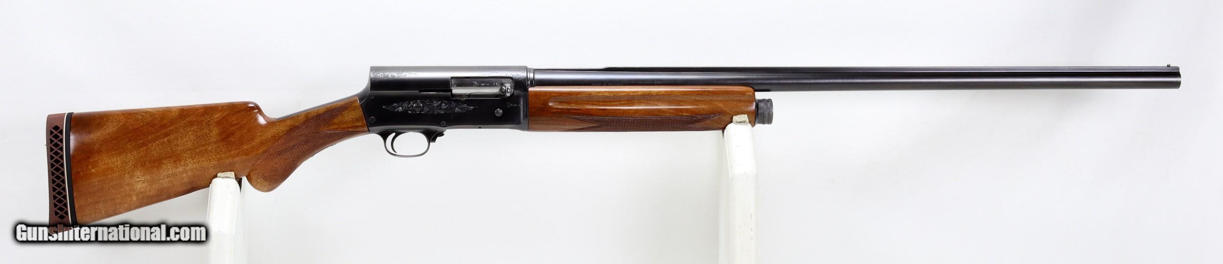 Description: Browning Auto-5 Standard Semi-Auto Shotgun in 16Ga. SN #106473. Made in Belgium 1932-1940. INTRODUCED AS THE THREE SHOT, PRIOR TO INTRODUCTION OF SWEET 16", LOP 13 3/4". Chamber is 2 3/4". Choke is Extra Full (.035). DAH 2 1/2". DAC 1 5/8". 27 1/2" Solid Raised Ribbed Barrel with a VERY GOOD to EXCELLENT Bore for it's age. Both the Blued Metal and Round Knob Checkered Pistol Grip Stock and Forend have been FULLY RESTORED by SHOOTER'S EXCHANGE and LOOK GREAT. This Early A-5 16Ga. has the safety in front of the trigger guard. Browning 3 shot marked on underside of forend. Custom Checkering with Diamond on Stock and Forend. Browning Recoil Pad. Has Magazine Tube Cutoff. Screws on Receiver marked with Serial Number. Weight: 7.7 lbs. Trigger Pull: 3 3/4 lbs. More photos available upon request. Ships to Lower 48 W/ Insurance $55.00. SOLD Curio/Relic: Yes Shotgun Gauge: 16 Gauge Manufacturer: Browning Model: Auto-5 Serial Number: 106473 Barrel Length: 27 1/2 Chambers: 2 3/4 Condition: Excellent Metal Condition: Refinished Wood Condition: Refinished Bore Condition: VG to Excellent For Age Action: Semi Auto LOP: 13 3/4 Rib: Solid Finish: Blue Weight: 7.7 lbs. Manufacture Date: 1932-40 |