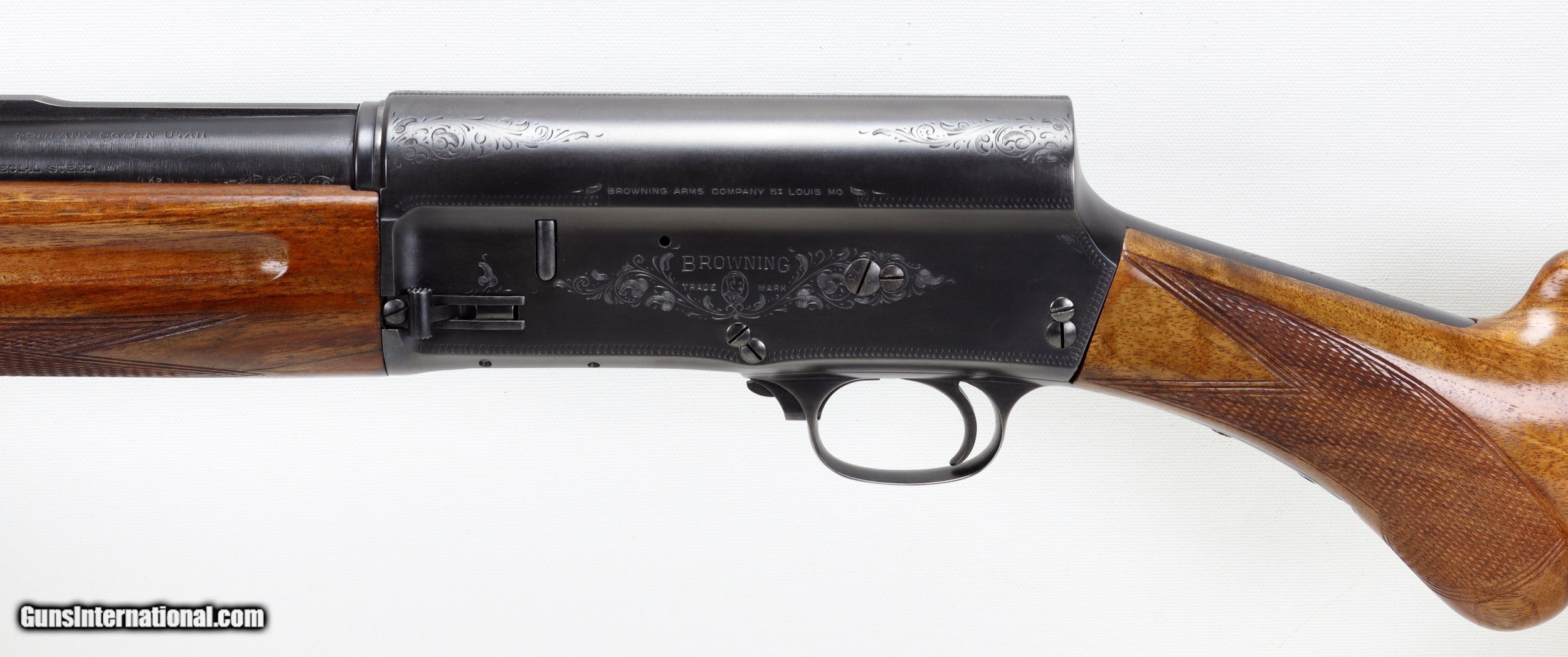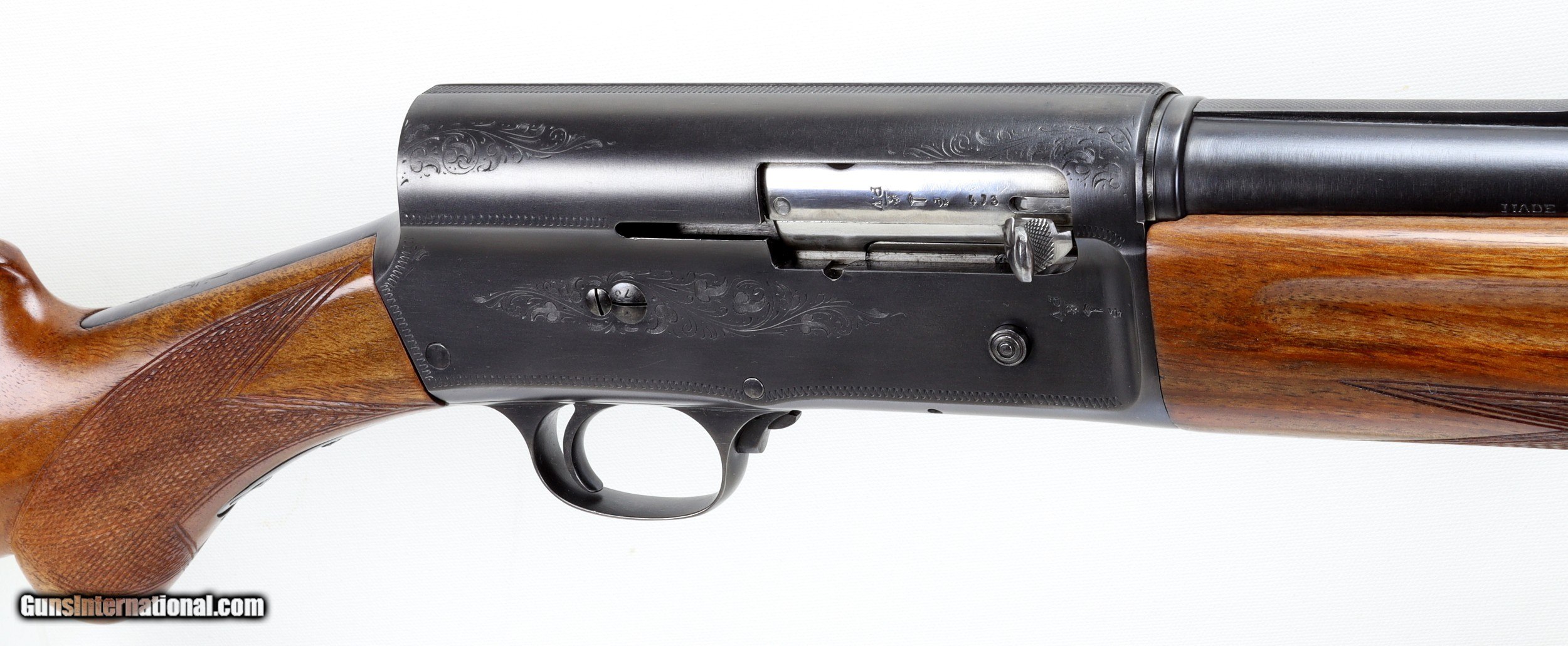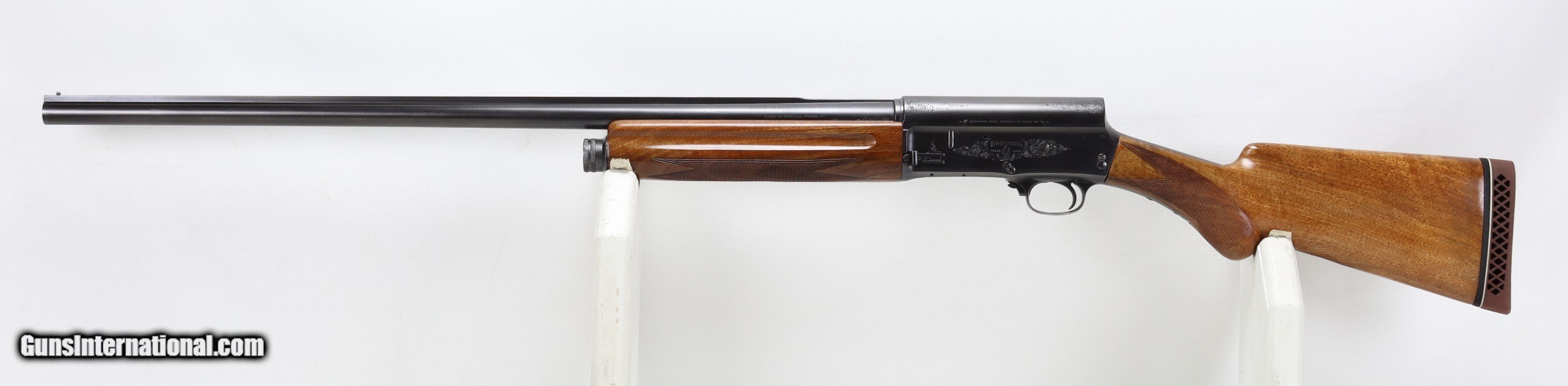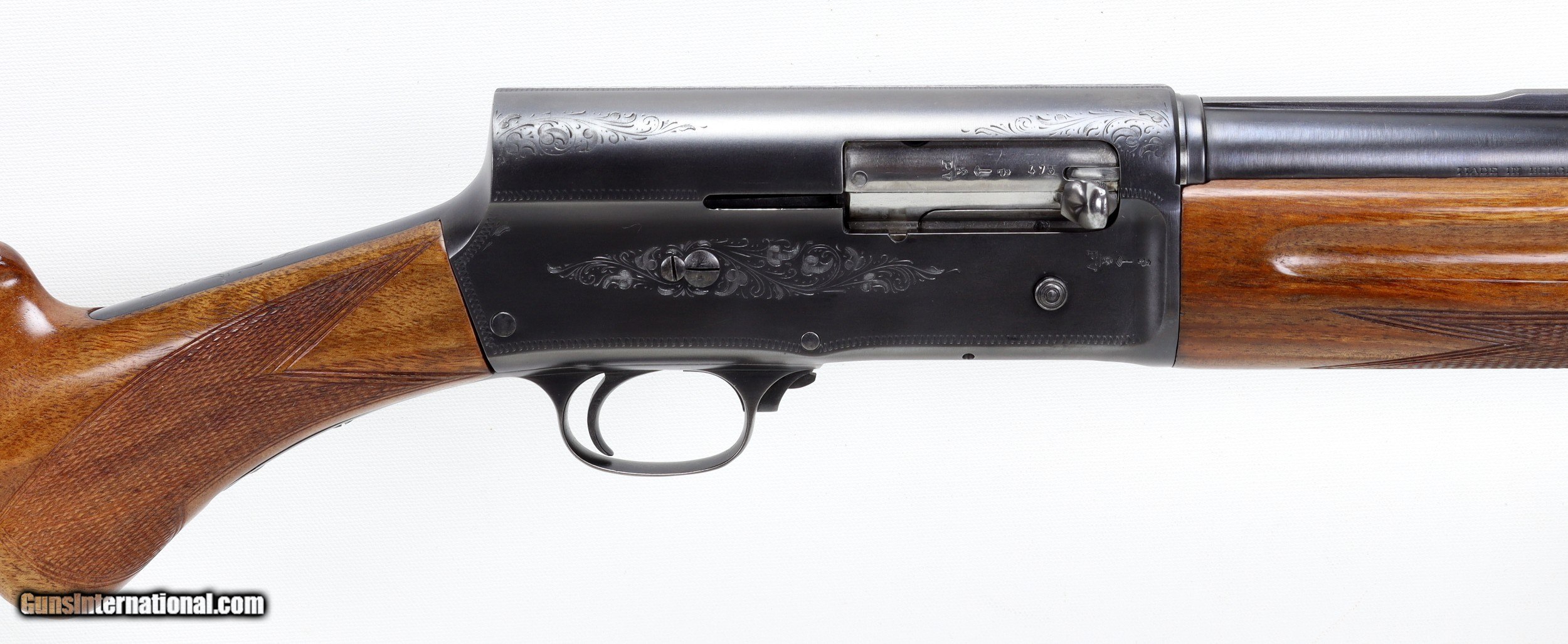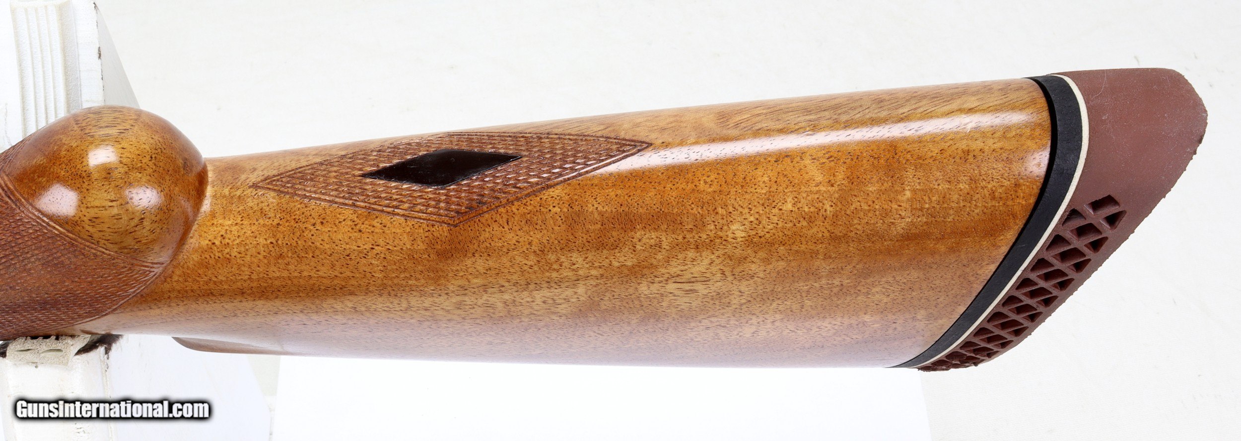 Description: Browning Auto-5 Standard Semi-Auto Shotgun in 16Ga. SN #106473. Made in Belgium 1932-1940. INTRODUCED AS THE THREE SHOT, PRIOR TO INTRODUCTION OF SWEET 16", LOP 13 3/4". Chamber is 2 3/4". Choke is Extra Full (.035). DAH 2 1/2". DAC 1 5/8". 27 1/2" Solid Raised Ribbed Barrel with a VERY GOOD to EXCELLENT Bore for it's age. Both the Blued Metal and Round Knob Checkered Pistol Grip Stock and Forend have been FULLY RESTORED by SHOOTER'S EXCHANGE and LOOK GREAT. This Early A-5 16Ga. has the safety in front of the trigger guard. Browning 3 shot marked on underside of forend. Custom Checkering with Diamond on Stock and Forend. Browning Recoil Pad. Has Magazine Tube Cutoff. Screws on Receiver marked with Serial Number. Weight: 7.7 lbs. Trigger Pull: 3 3/4 lbs. More photos available upon request. Ships to Lower 48 W/ Insurance $55.00. SOLD Curio/Relic: Yes Shotgun Gauge: 16 Gauge Manufacturer: Browning Model: Auto-5 Serial Number: 106473 Barrel Length: 27 1/2 Chambers: 2 3/4 Condition: Excellent Metal Condition: Refinished Wood Condition: Refinished Bore Condition: VG to Excellent For Age Action: Semi Auto LOP: 13 3/4 Rib: Solid Finish: Blue Weight: 7.7 lbs. Manufacture Date: 1932-40 |