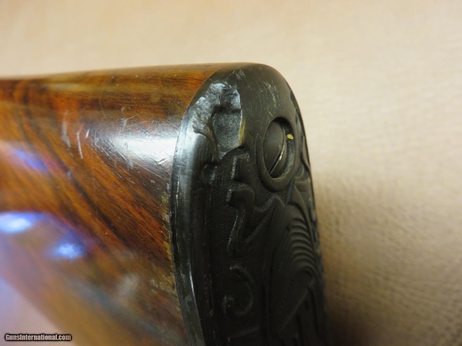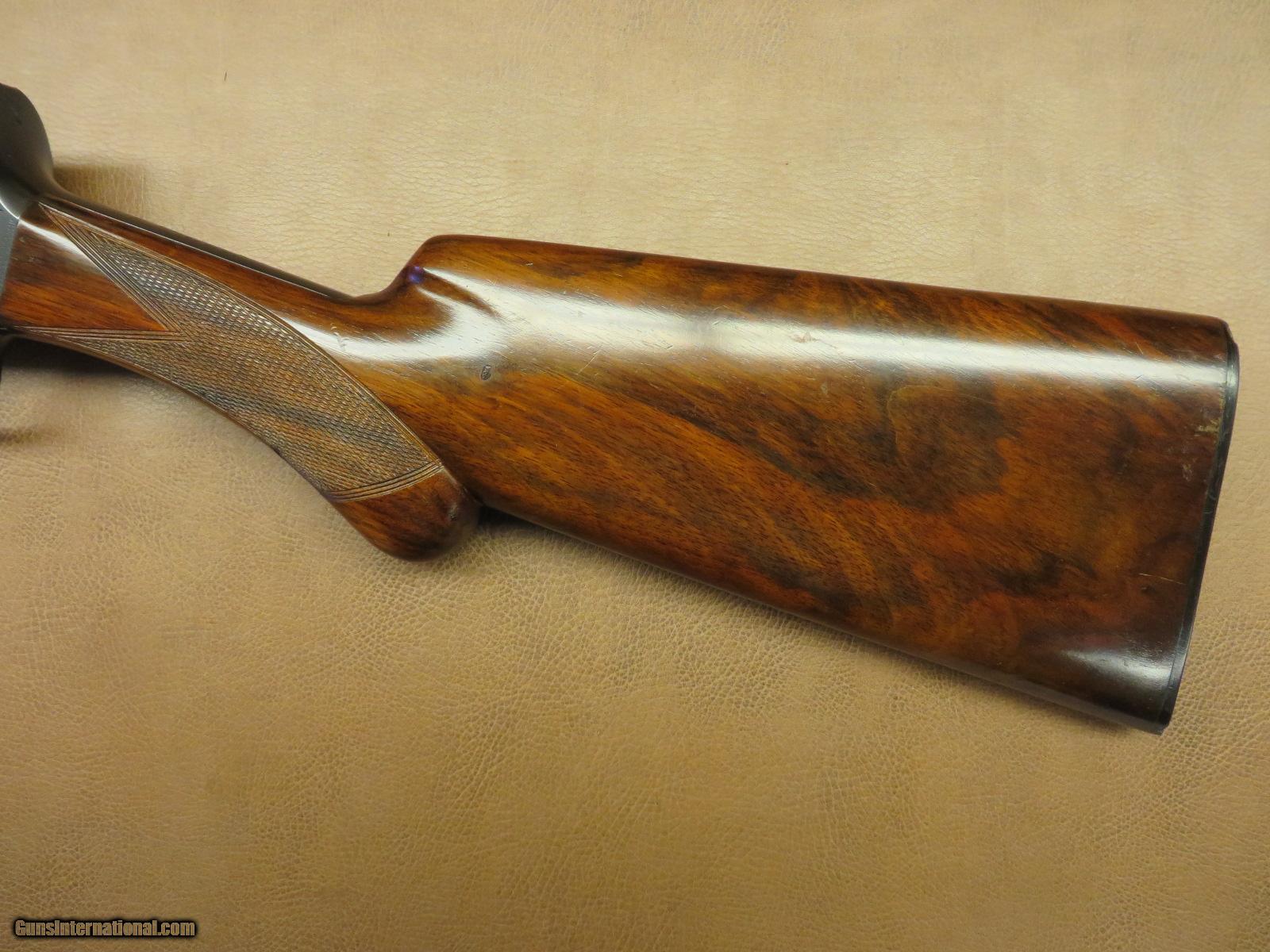 Description: Belgian made standard weight 16 ga. has 27 1/2 inch modified choke solid rib barrel. Engraved receiver. Matching serial numbers X26xxx. Round knob checkered walnut stock with original FN butt plate. Blue and wood are both 95%+. Butt plate has several small chips with no damage to the wood. SOLD |