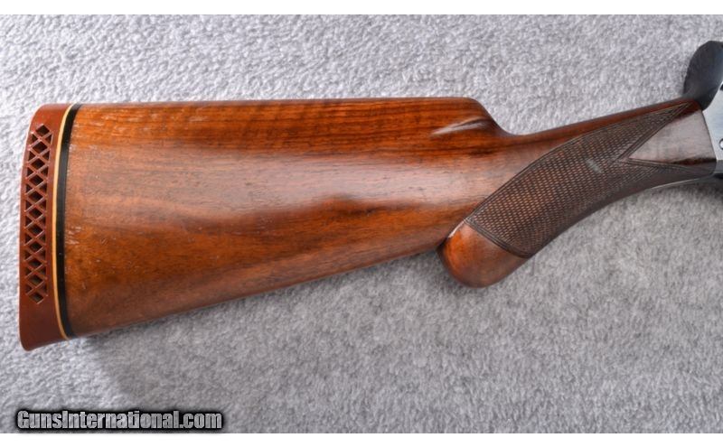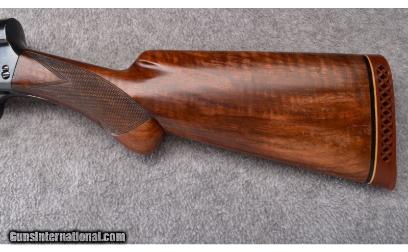 Description: Wood stock remains solid but shows loss of finish from carry wear and light handling marks. Forend appears to have been replaced. Metal has been re-blued and also shows carry wear and some light scratches. Forend Cap shows some use as well Bore is excellent and functionality is good. No box. SOLD Manufacturer: S/N 104XXX Caliber Info: 12 Ga. Metal Condition: Very Good Wood Condition: Very Good Bore Condition: Excellent Barrels: 26 Triggers: Factory Stock: Checkered Walnut Round Knob Stock Dimensions: 14 5/8" LOP Fore End: Checkered Walnut Butt Pad: Pachmayr Vented Red Rubber Butt Pad Weight: 8 1/2 LB Sights: Brass Front Bead Chokes: Full - Fixed Item Location: Wheeling, WV |