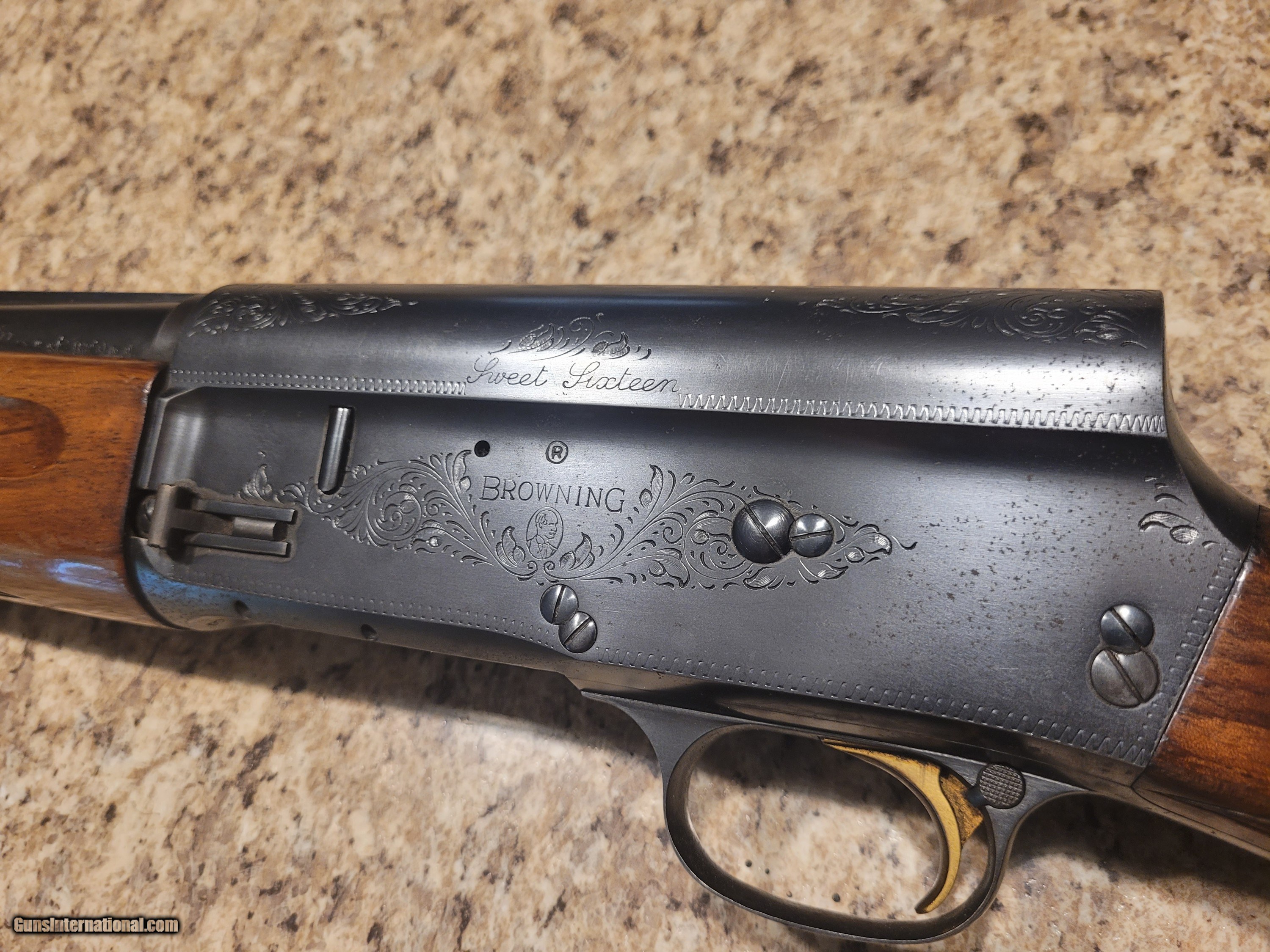 Description: Nice original 1954 Belgium Browning a5 sweet sixteen 16ga vent rib barrel, Mod chock. Overall good condition Usual handling marks very small stress crack on forend SSN # S 22112 SOLD Shotgun Gauge: 16 Gauge Manufacturer: Browning Model: A5 Serial Number: 22112 Bore: Good Chambers: Good Ejectors: Good Condition: Good Metal Condition: Good Wood Condition: Good Bore Condition: Good Stock: Wood Manufacture Date: 1954 Chokes: Modified |