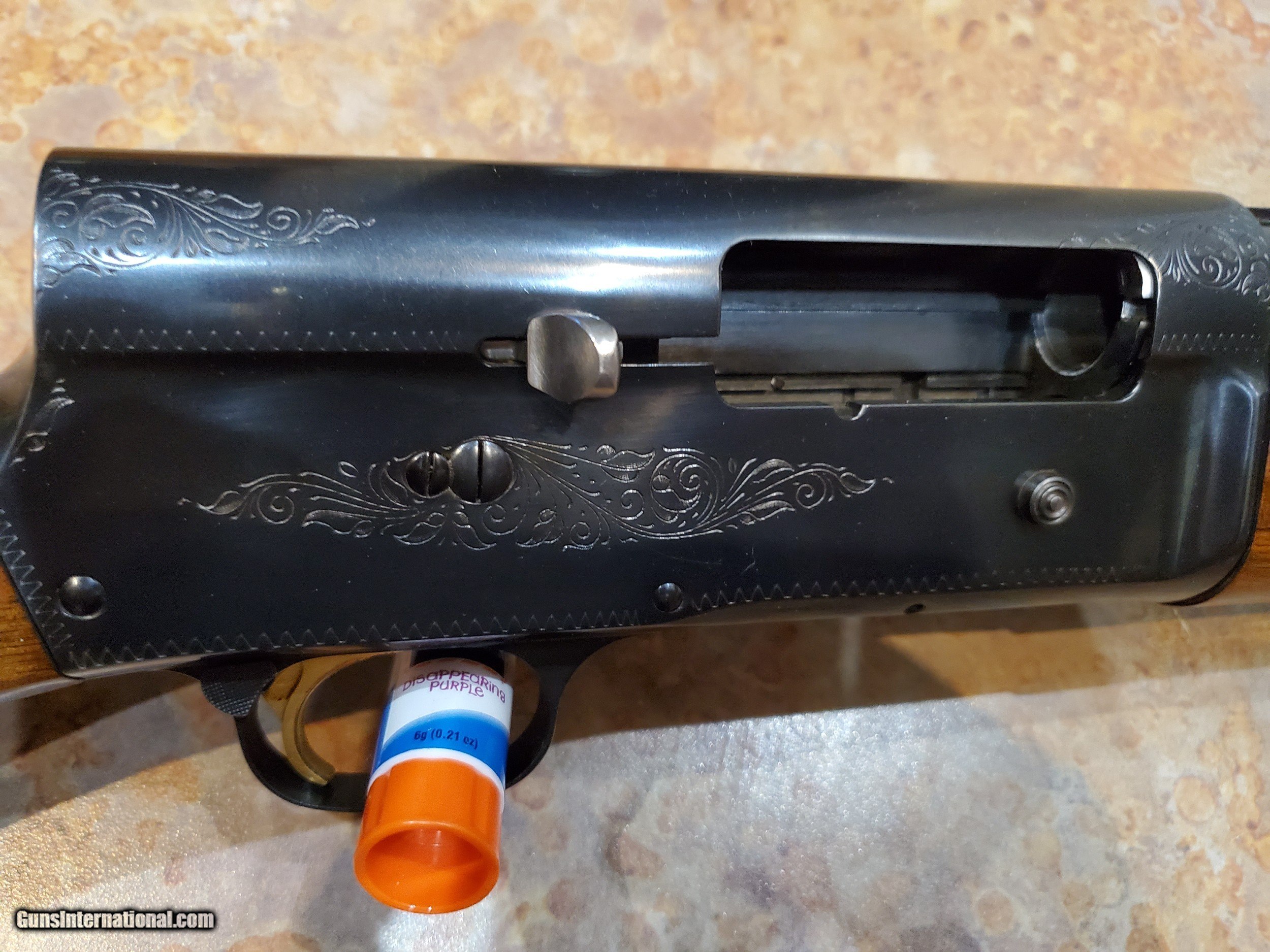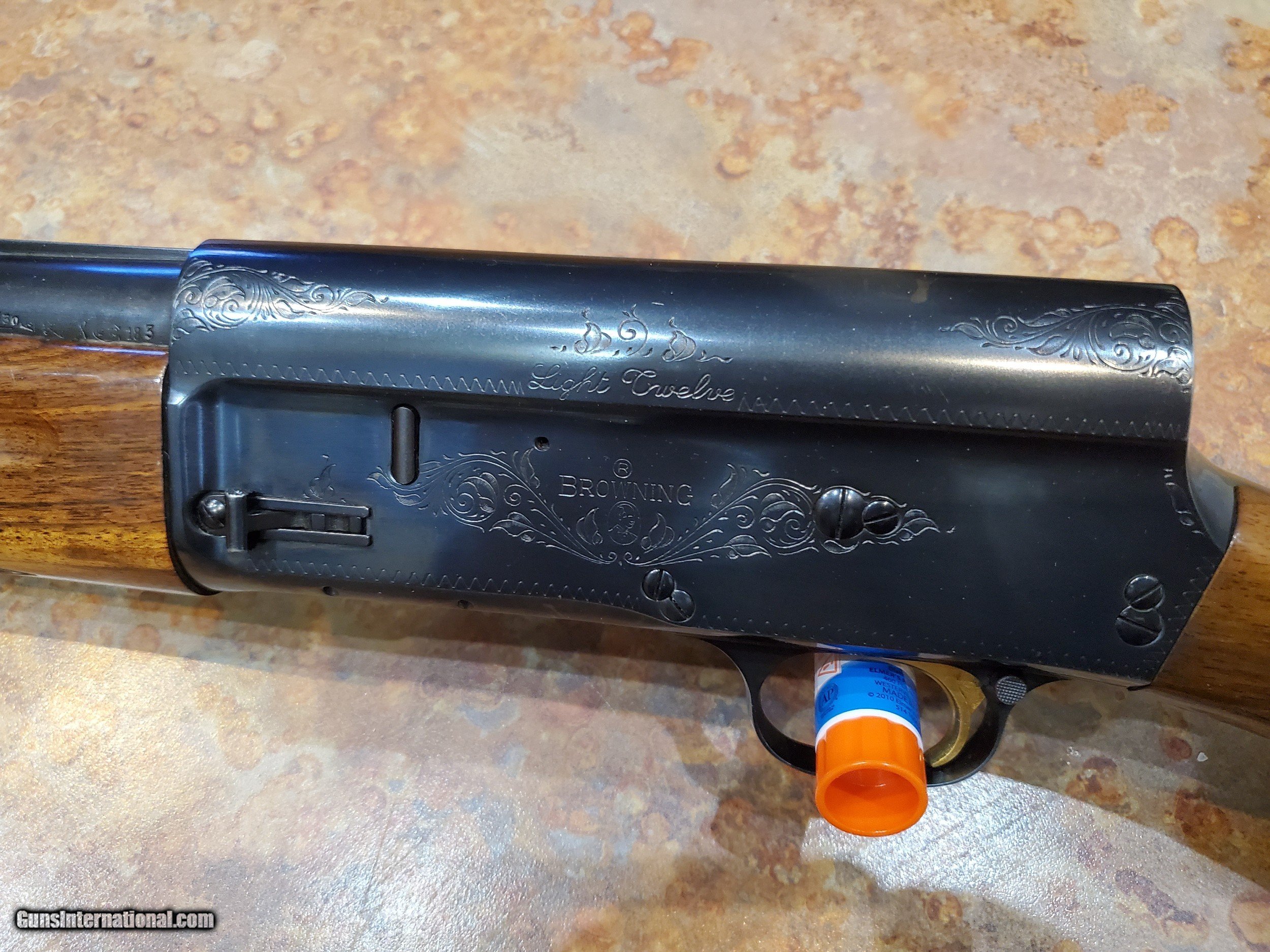 Description: Browning A5 Light 12 manufactured in Belgium. Beautiful gun with the darker stocks. The forearm stock is excellent with various nicks and handling marks on the butt stock. The butt stock is a flat knob. The metal is excellent with rub mark on the barrel where it cycles. The barrel is choked modified and is a vent rib. 90-95% condition. add $75 for shipping SOLD Shotgun Gauge: 12 Gauge Manufacturer: Browning Model: A5 Light Serial Number: 966## Chambers: Modified Condition: Very good Metal Condition: Excellent Wood Condition: Very good Bore Condition: Shiny Barrels: 1 Barrel Type: Vent rib Action: Auto Triggers: Single gold Rib: Vent rib Manufacture Date: 1969 Engraving: Standard a5 Item Location: TX |