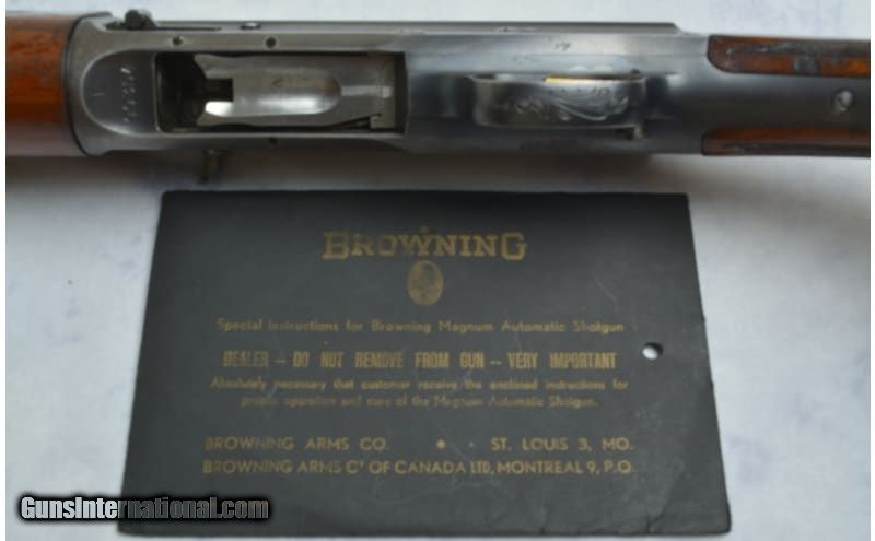 Description: This Browning 12 gauge shotgun shows wear to the bluing along the barrel and receiver. The engraving on the receiver still stands out. The wood is worn along the stock and forend with scratches, dents and dings. This Shotgun is in overall good condition. Includes Manual. Built 1956 12 Gauge SOLD Curio/Relic: Yes Chambers: 2 3/4" 12 gauge Metal Condition: Very Good Wood Condition: Good Bore Condition: Very Good Barrels: 27.5" Vent Rib Chokes: Modified Item Location: Green Bay |