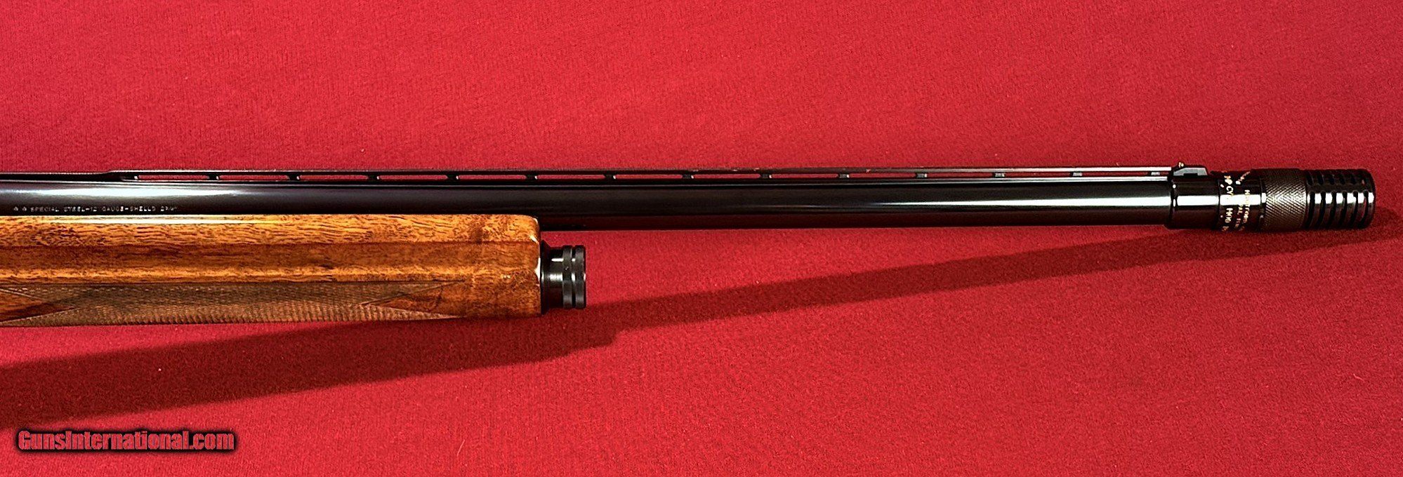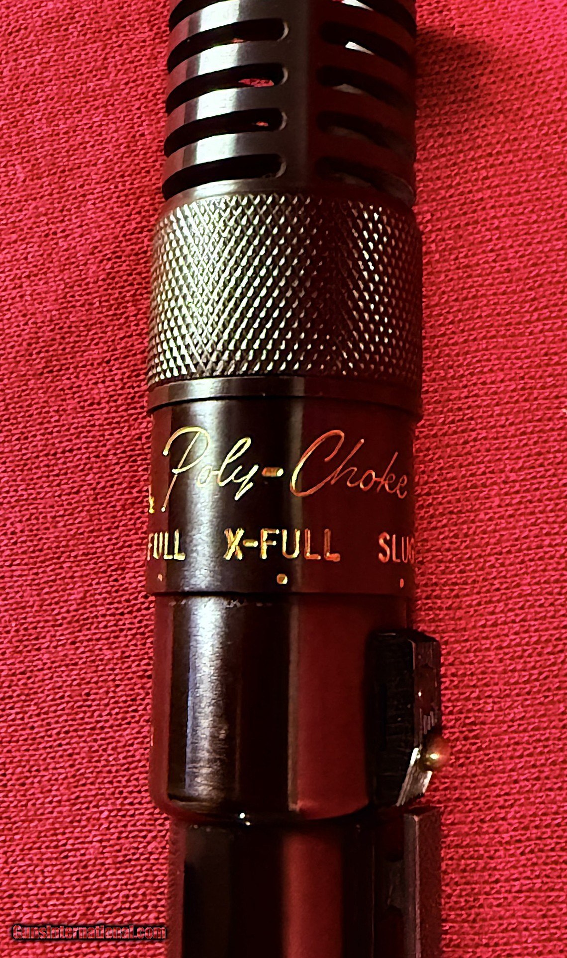 Very Nice Browning Auto-5, Light Twelve, Semi-Auto Shotgun, Made in Belgium in 1966. I really like to shoot this Auto-5, 12 Gauge 2 3/4". The action is smooth but tight, and to me it seems to have very light recoil. The aftermarket PolyChoke works as its designed, and it hits where you point it. The PolyChoke is instantly adjustable from Cylinder to Extra Full and everything in between. The walnut stock has had a ventilated recoil pad installed that maintained the length of pull at 14 1/2 inches. There are a few small marks in the stock but most are not noticeable without close inspection. The metal is excellent, high polish blue, that shows very little, if any, wear.
