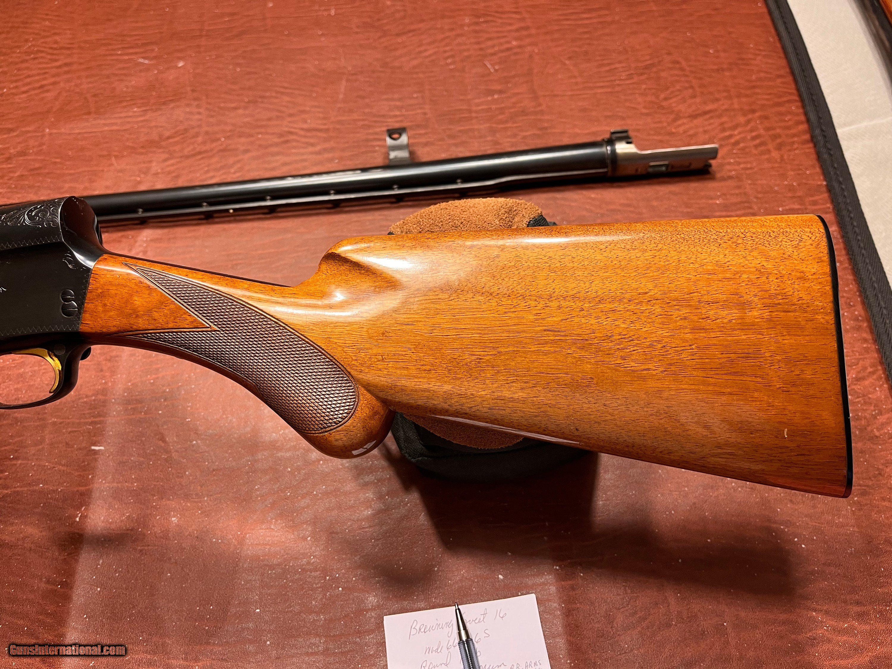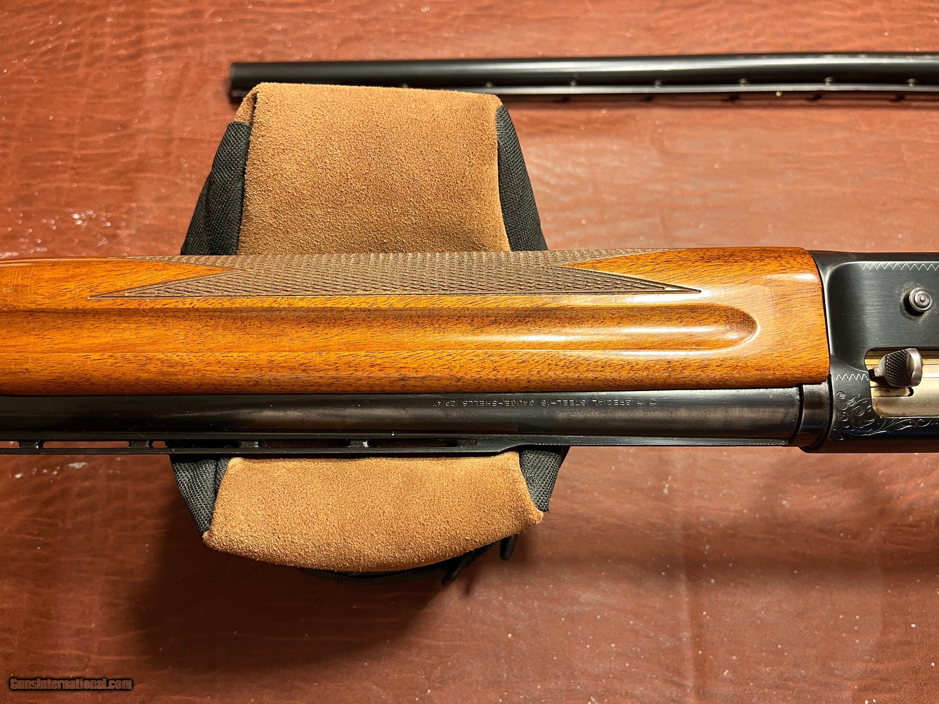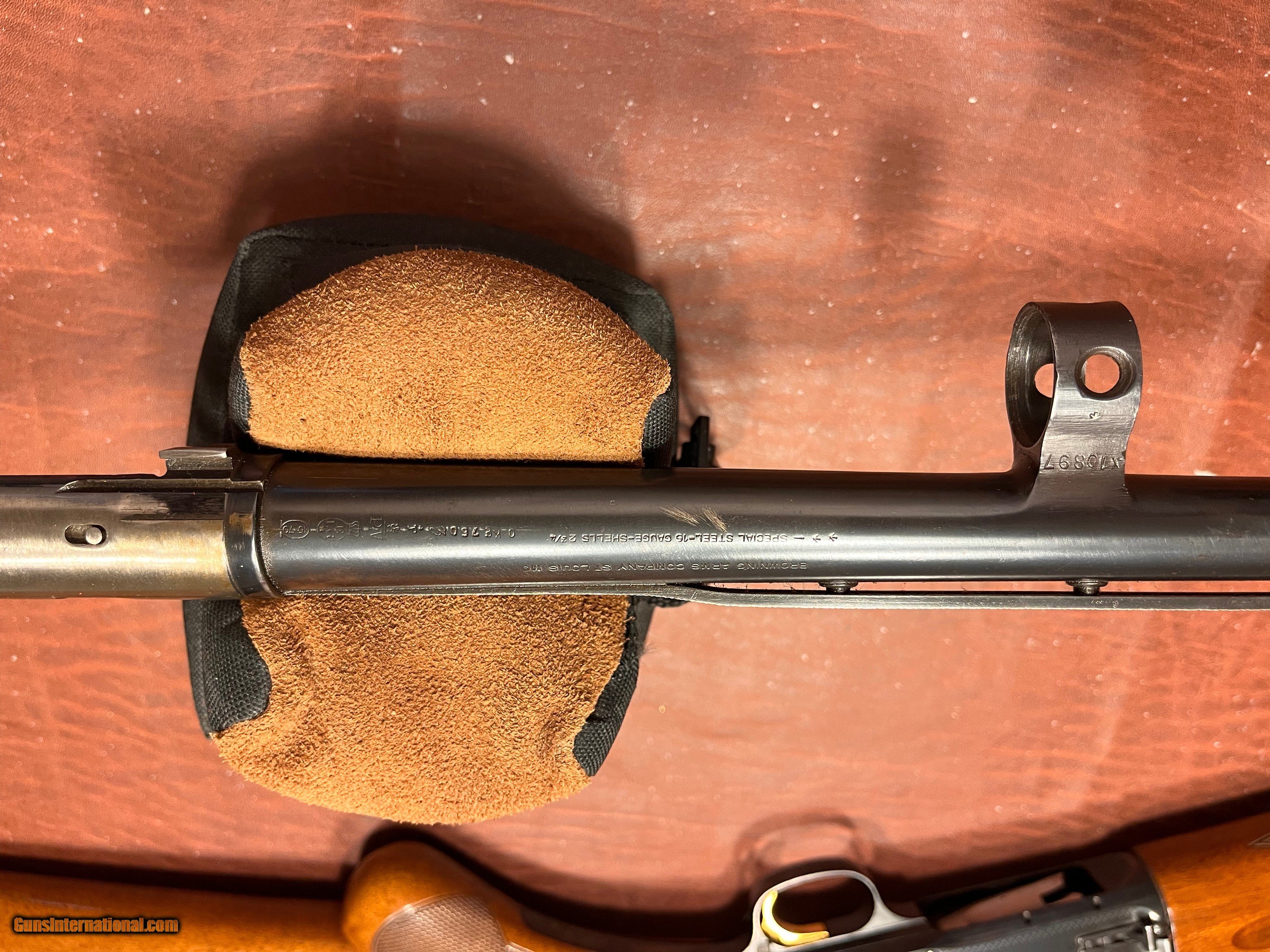Description: Excellent condition!! With extra barrel. Belgium made Browning Sweet 16 A-5 made in 1966 Round knob. Blueing on gun and modified barrel is 98% plus, NOT a reblue, just very, very good! Modified barrel, vent rib, 2 3/4 inch chamber,27 1/2 lenght, made in Belgium marked St Louis Mo and Montreal PQ. Also have one EXTRA barrel that goes with gun. Made in Belgium, 2 3/4 inch chamber, hard to find improved cyclinder bore choke, vent rib, 25 1/2 lenght, marked Browning Arms Co St Louis Mo. Barrel has been used and shows wear I would rate it about 85%, still in good condition and a hard to find choke. The wood on the gun is also in very good condition, rate it at 95% plus. Overall a great Belgium made Sweet 16 with two barrels. I ship USPS Priority mail with insurance FFL to FFL. I don't think you can find a nicer used sweet sixteen with good barrels, I should probably keep this one but I have other interest. $3000. or best offer. SOLD Shotgun Gauge: 16 Gauge |
