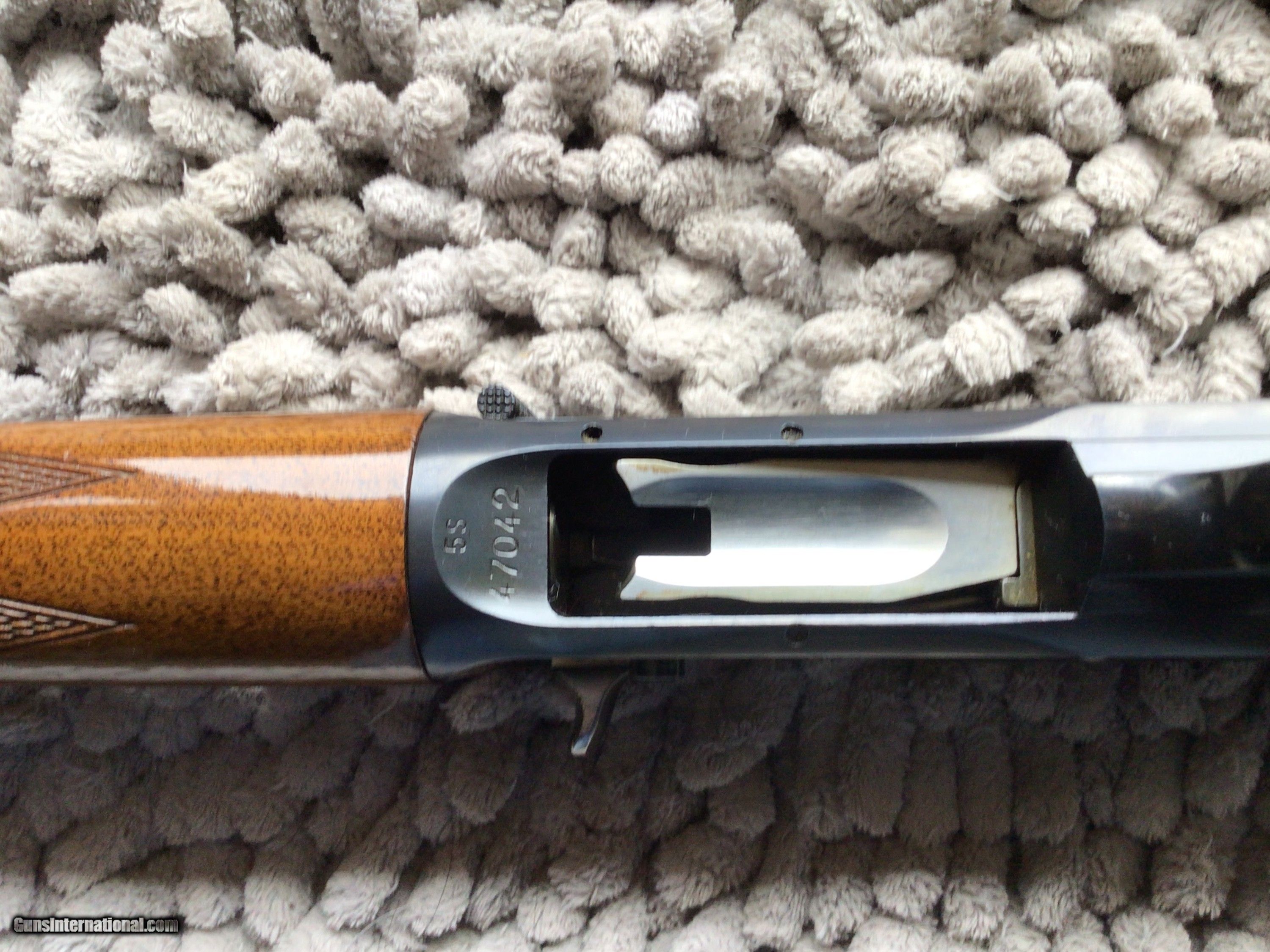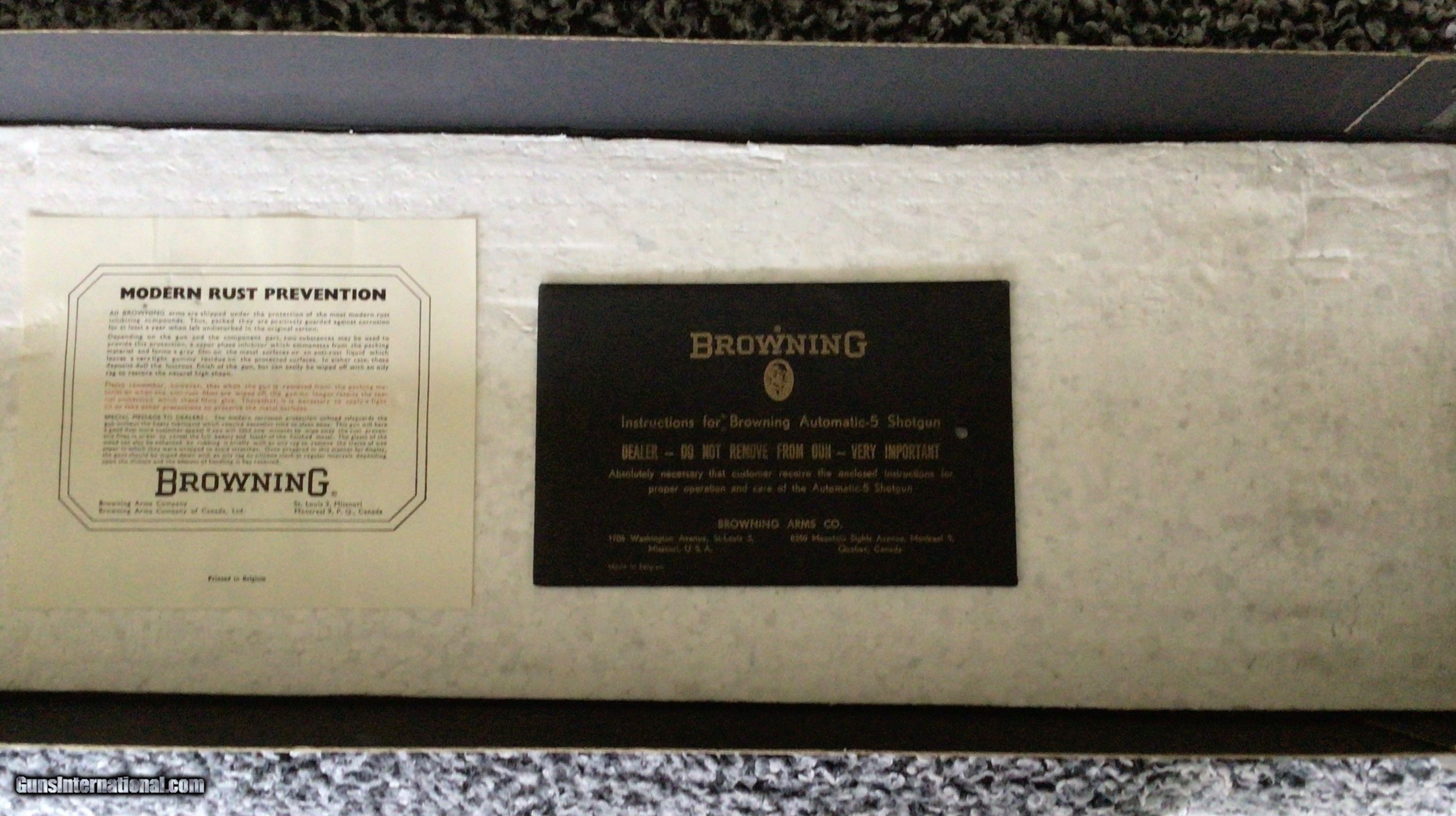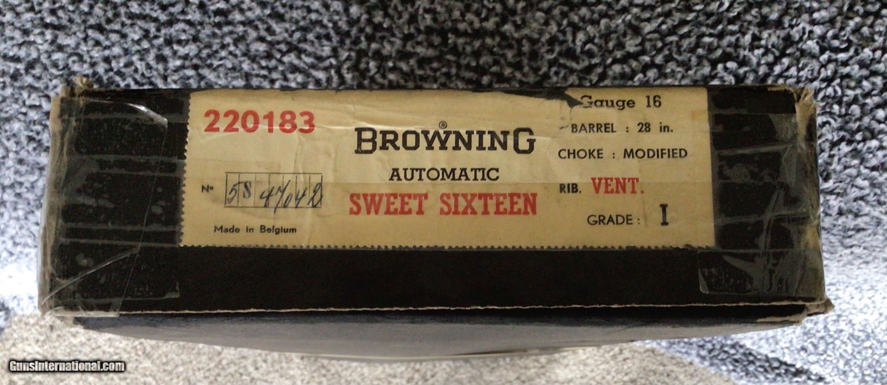 Description: We have a very nice, 1965 production Browning Automatic Sweet Sixteen shotgun, with a 28 inch, modified, vent rib barrel, in Grade I. This gun may have never been shot, it appears to be in like new condition. The only blemishes on this fine shotgun, are a couple of small 'safe' nicks on the left hand side of the buttstock, and a fine scratch on the right hand side of the buttstock, ( this does not show in the photos). The buttplate and blueing are as new! The box has some tape on the corners, the original paperwork is also included, (shown in the photos). I am listing this beauty as a like new gun, in the original box, because I don't know if it has ever been fired, and there are the couple of nicks and marks that you can see in the photos. Feel free to ask any questions, this is a great find for the serious Browning enthusiast. Shipping and insurance to the lower 48 is $75.00. Prefer postal money order for payment. SOLD Shotgun Gauge: 16 Gauge Manufacturer: Browning Model: A5 Sweet Sixteen Serial Number: 5S470xx Barrel Length: 28 Bore: Like new Condition: Like new Metal Condition: Like new Wood Condition: Very nice Bore Condition: Like new |