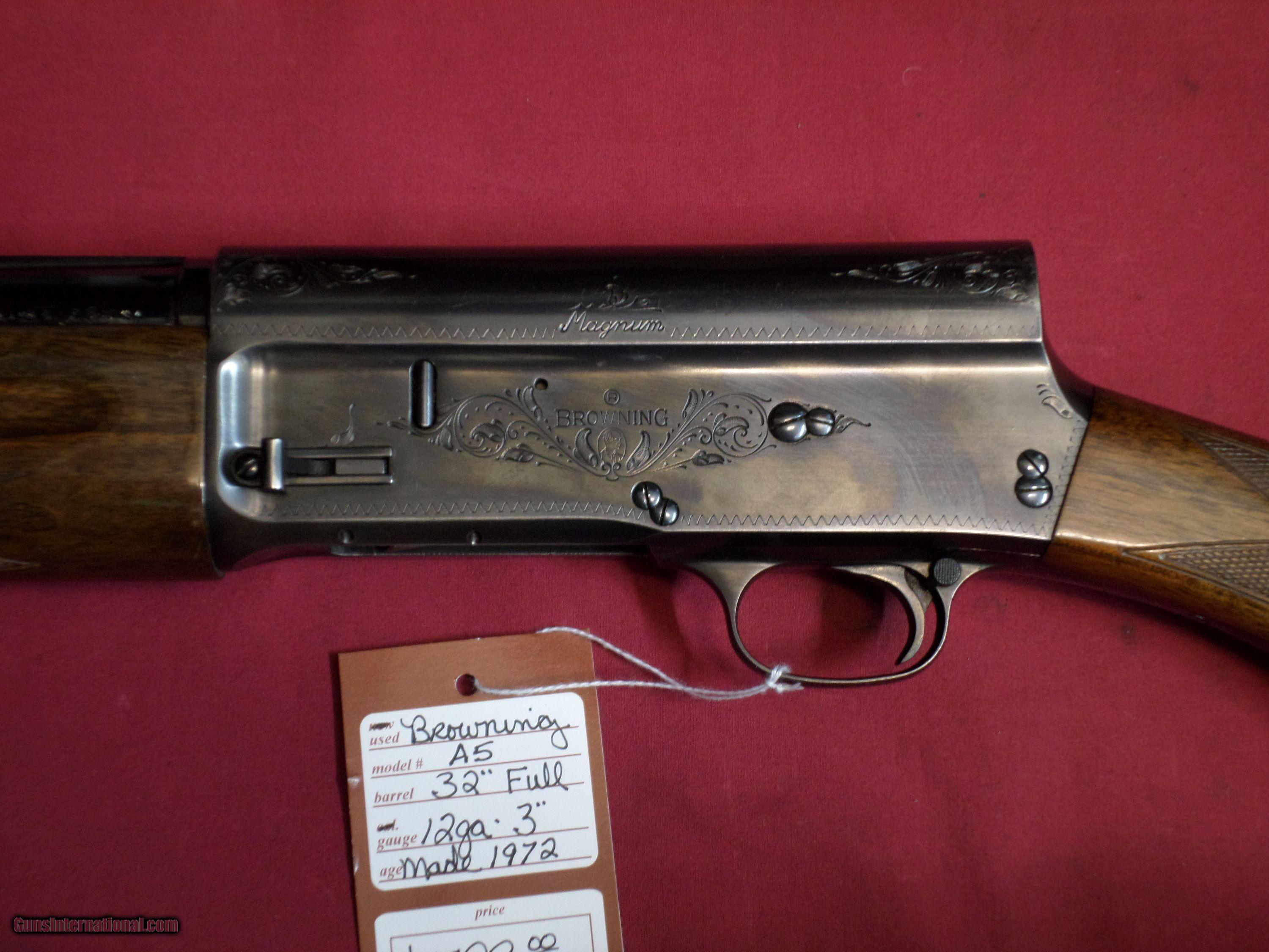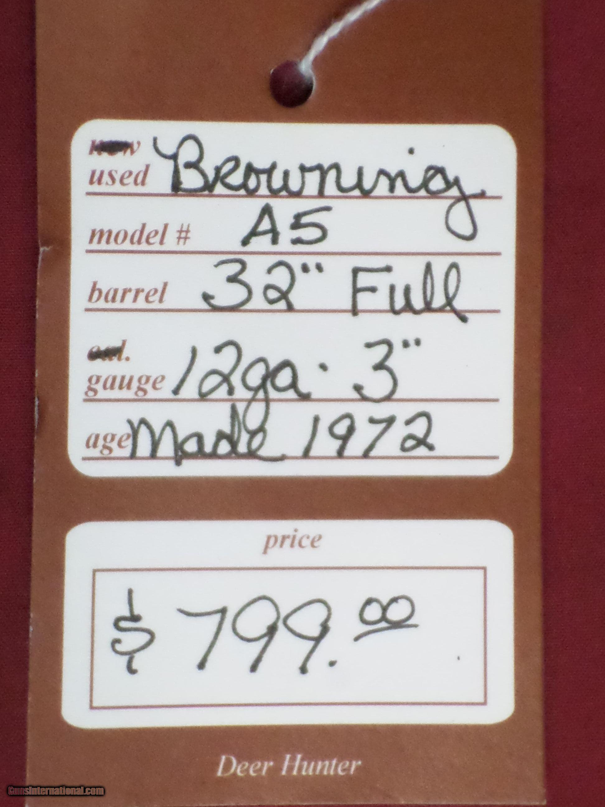 Description: For sale, Belgian Browning A5 Magnum, 12 ga, 32" full choke. Long tang, flat knob. Excellent condition. Circa 1972. To see more of our inventory, visit deerhunterguns,com We collect 7% sales tax for Florida sales. We accept MC, Visa and Discover, no AmEx. No Sales to California. Like us on Facebook: Deer Hunter Guns SOLD |