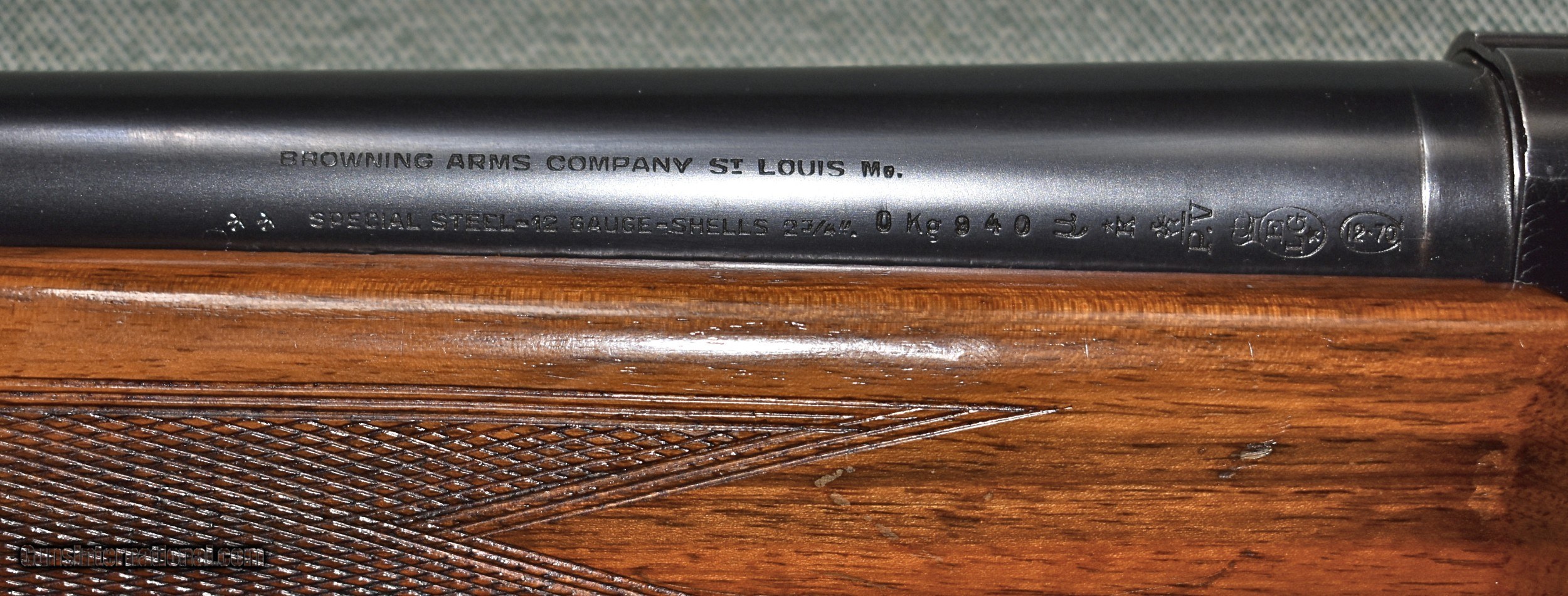 Description: Belgian Browning Double Auto with the hard to find steel receiver. Built in 1954,this gun has a 28" barrel choked modified. The gun is in excellent all original conditon retaining 98% of the original blue and wood finish. It retains the original double auto buttplate. This would make a great pheasant or dove gun and a fine sporting clays gun. Very hard to find in the condition. C&R eligible. SOLD Curio/Relic: Yes Shotgun Gauge: 12 Gauge Manufacturer: Browning (FN) Model: Double Auto Serial Number: C10368 Barrel Length: 28 Chambers: 23/4 Condition: excellent Metal Condition: excellent Wood Condition: excellent Bore Condition: mint Barrel Type: Browning Special Steel Action: semi auto Butt Pad: factory buttplate Manufacture Date: 1954 Chokes: modified |