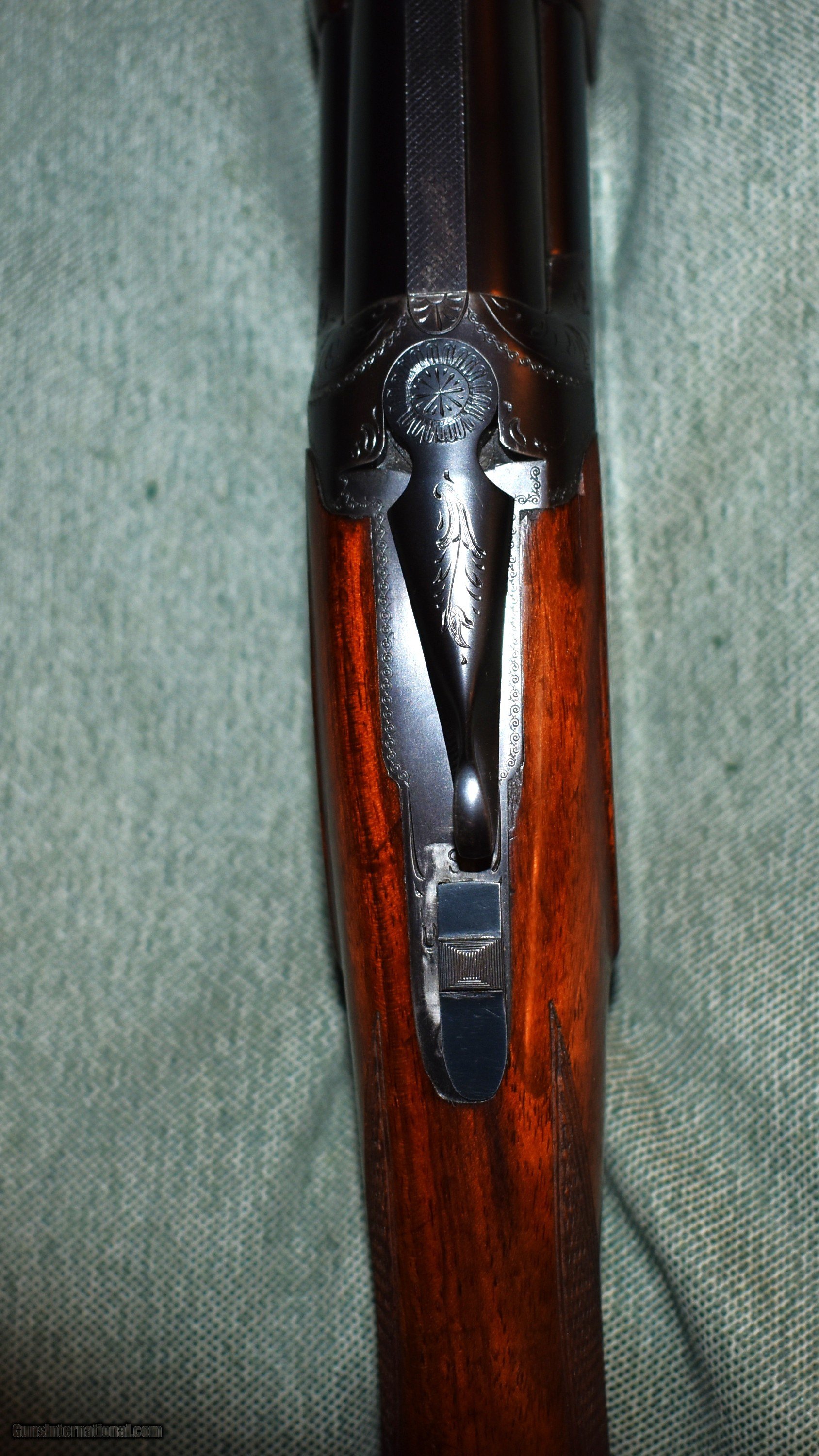 Belgian Browning 12 gauge grade one superposed. Built in 1958,this gun has the round knob long tang stock. The gun is in excellent condition retaining 98% of the original blue. The stock has a 141/2" LOP over an aftermarket recoil pad. The 30" vent rib barrels are choked IM (.025") and full (.035"). The barrels have mint bores and are on face with no play. This would make a great trap, pigeon, or sporting clays gun. C&R eligible. Price includes shipping to your FFL.
