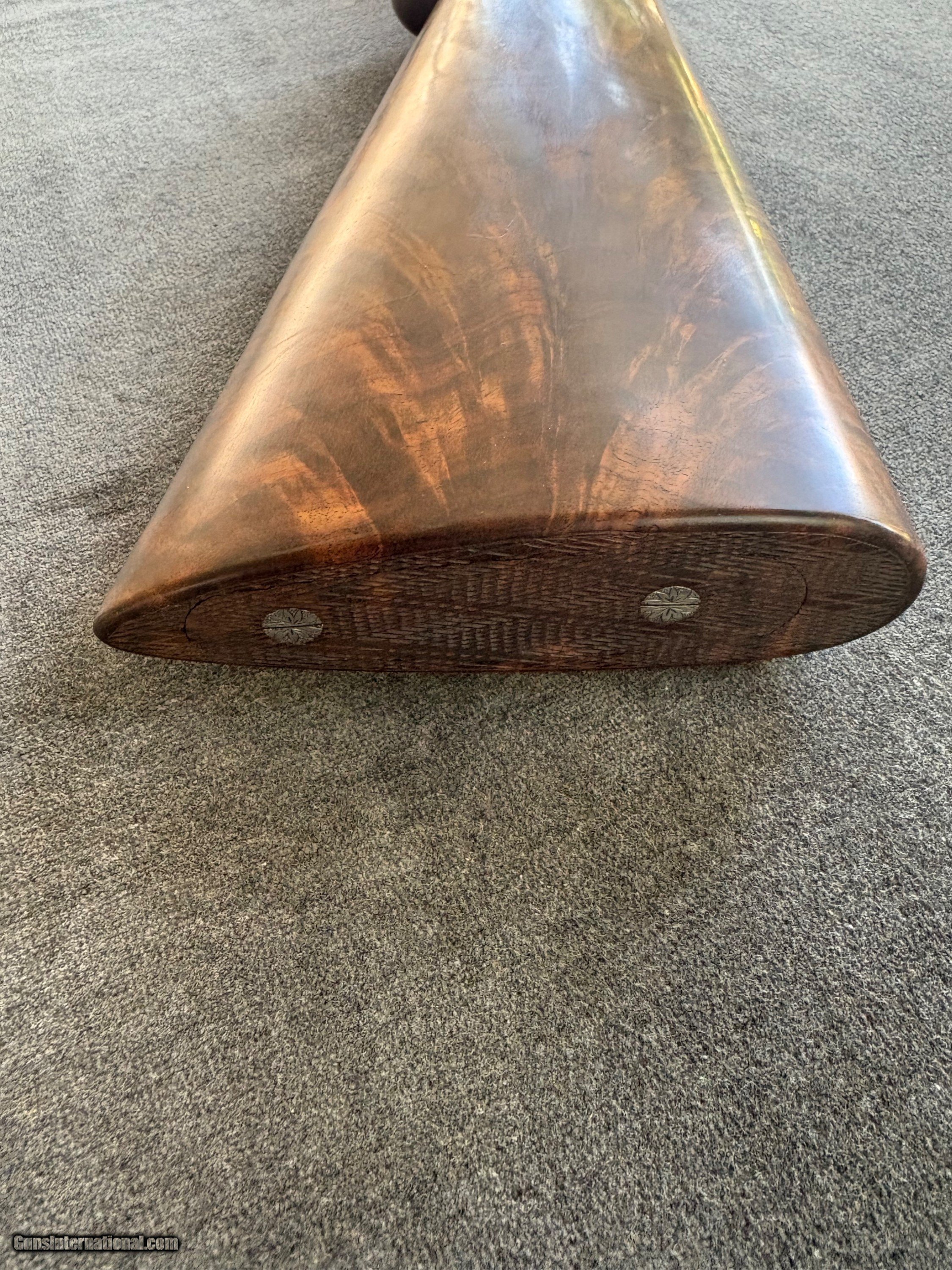 Stock is theather crotch claro walnut with field fore end in the RKLT configuration. Stock has checkered butt and LOP at 14-1/2 inch.