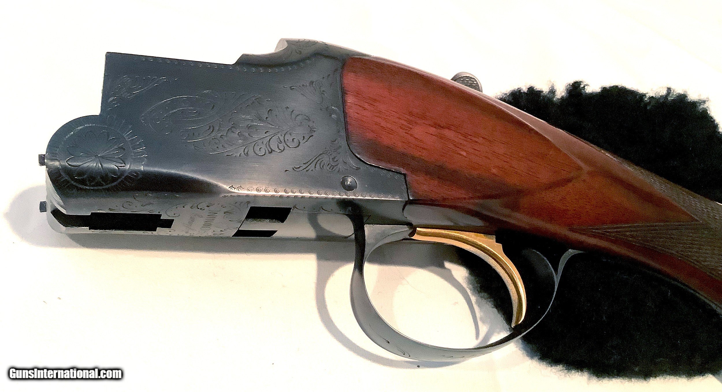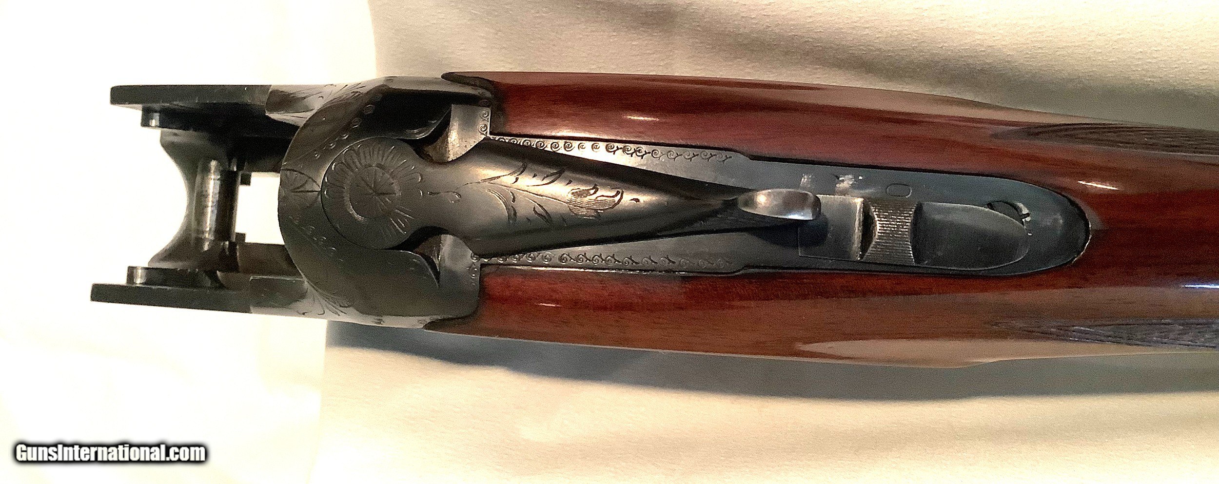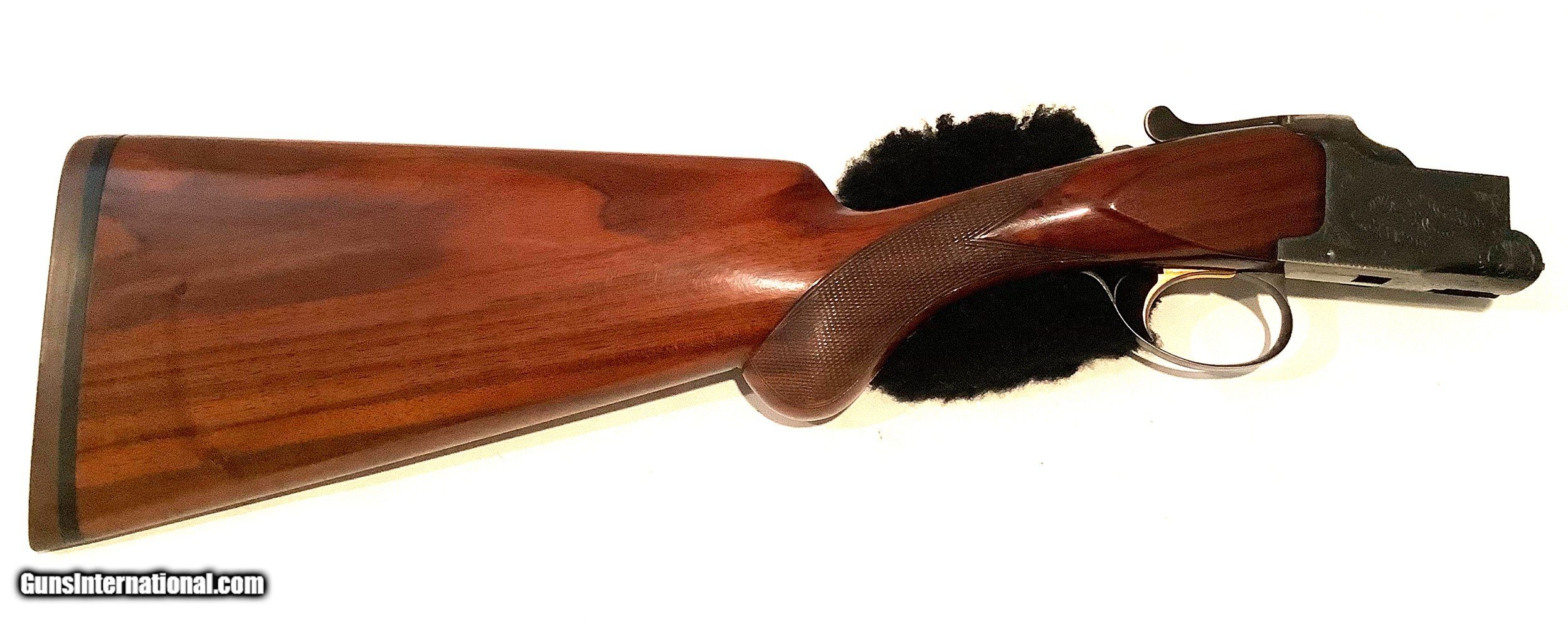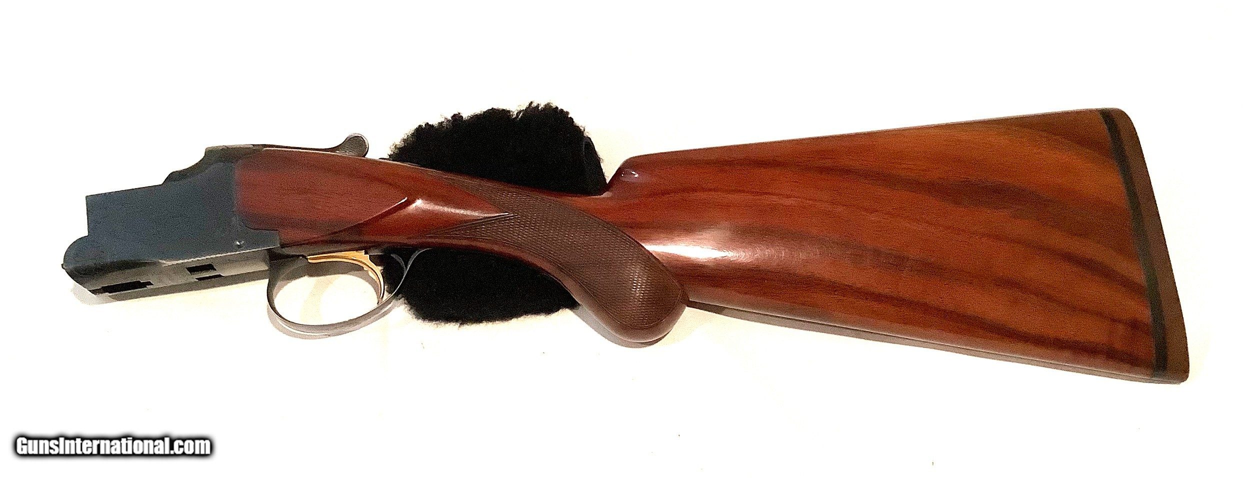 Description: 1966 FN Browning Superposed Lightning 20 Ga. Shotgun in excellent condition, fully functional and shoots a nice pattern. 26 1/2 inch barrels w/VR, 3" chambers, fixed chokes that measure .612" (Sk) and .612" (Sk). Exceptional stripped walnut stock, measurements are 14 5/16" LOP over an Old English pad, comb drop 2 5/16" and no cast. This shotgun has mechanical trigger to function the lighter recoil of the 28 Ga and .410" inserts. The two sets of Claude Purbaugh inserts have fixed IC chokes in each and come with proper sized ejectors. The 28 Ga inserts have 2 3/4" chambers, the .410" inserts have 3" chambers. The luggage case is in fine condition and holds inserts, parts and shotgun. I rate this shotgun at 95%, the action is tight and sound for its age. There are no blemishes in the wood, the bluing has no flaws. Inside the action there are a few tool marks and wear marks form use. The shipping is not included in the price. SOLD Shotgun Gauge: 20 Gauge |