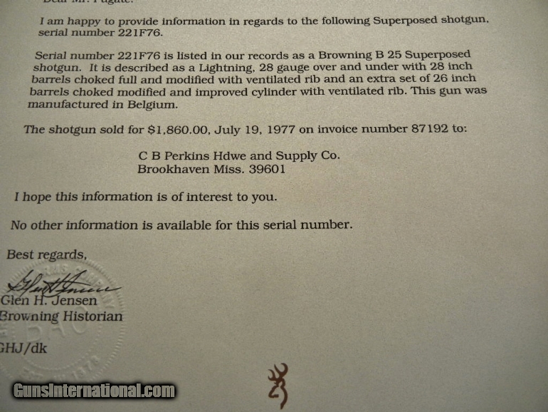Description: This is a Browning superposed 28 gauge with a 28 inch modified and full choke barrel and 26 inch improved cylinder and modified choke barrel. This gun is 99%+ in the box. Very tight with little to no use and 100% original. Very rare factory 2 barrel set with factory letter. Serial # is 221F76. Buyer pays 100.00 shipping. Thank you. 31-3-3 SOLD |