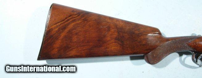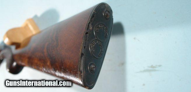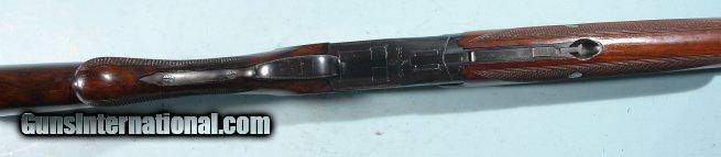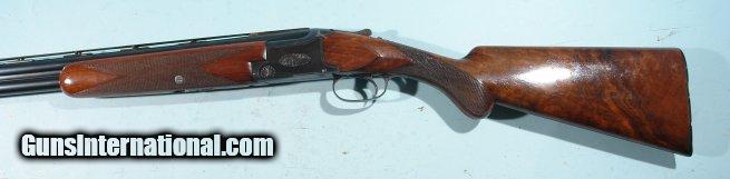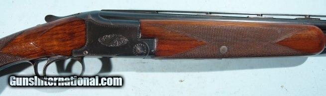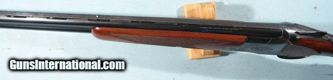 Description: 1ST YEAR 1949 BROWNING SUPERPOSED LIGHTNING 20GA. 28" SHOTGUN. Serial number "750" as marked under lever and forend hardware. This was first year the 20ga. Superposed was produced for commercial sale in the US and are in their own serial range atleast during this time period. 28" barrels choked improved mod and full and marked "*" and "**" accordingly. Custom vent rib added later with orange front and mid bead. This shotgun probably came with no rib or "matted rib" and owner decided to have one put on. At the time a vent rib was a $2 extra expense so not all came standard with the gun. Barrels with original blue and little wear or loss(only color missing is around rib where attached). Mint bores and chambers. Single trigger. Top lever right of center and no undue wear on hinge or ejectors. Excellent screws. Round knob with long tang with two screws. Buttstock all original with 14 1/4" length of pull over original horn Browning figure-8 horn buttplate(some wormholes in plate but sound). Original dimensions to stock with no alterations and NO drop. Original Browning stock finish to wood both buttstock and forend with original crisp checkering. Some handling and rack marks to wood but only light(on comb). Sound wrist and perfect inletting a testiment to craftmanship of the time. Only color loss is on thumb safety typical and lower tang from handling. Perfect working order and will make a nice addition to early Browning Superposed collection or vintage gun bird hunter. Hard to find these early 20ga. Superposed especially a first year gun for this gauge. SOLD Curio/Relic: Yes |