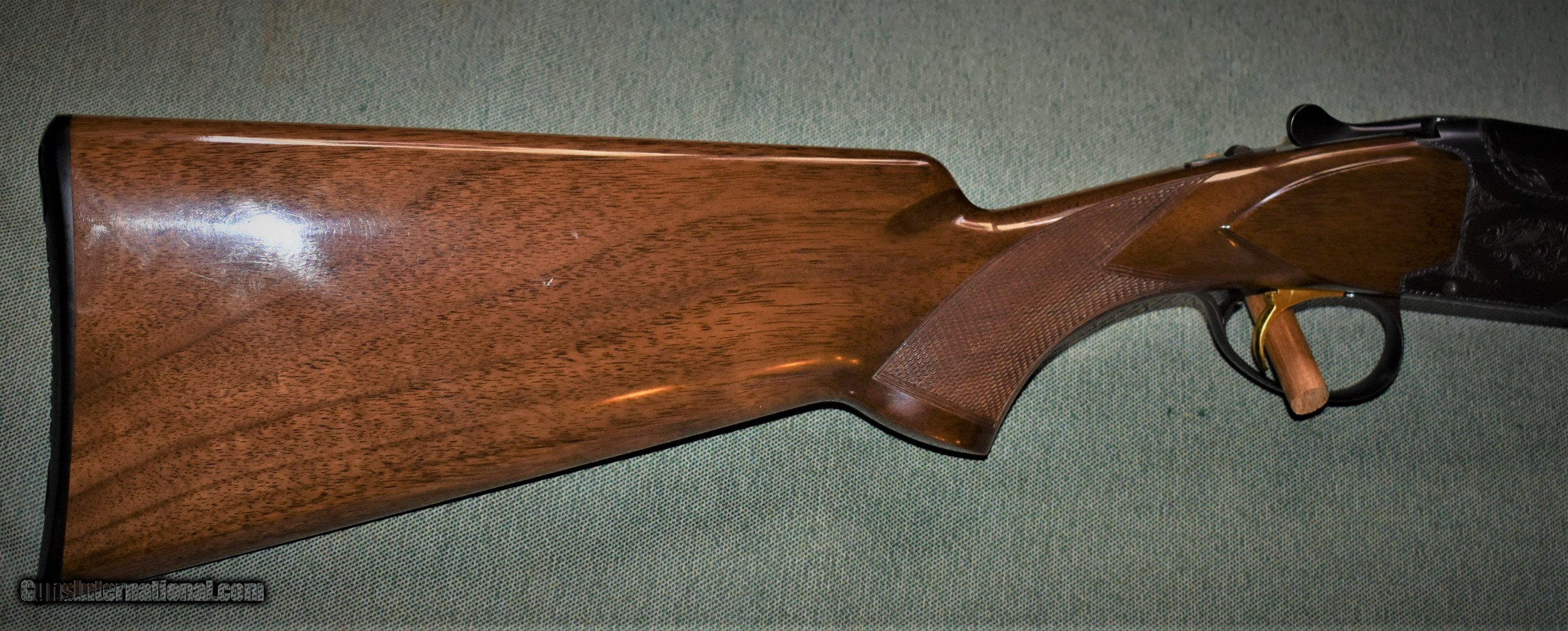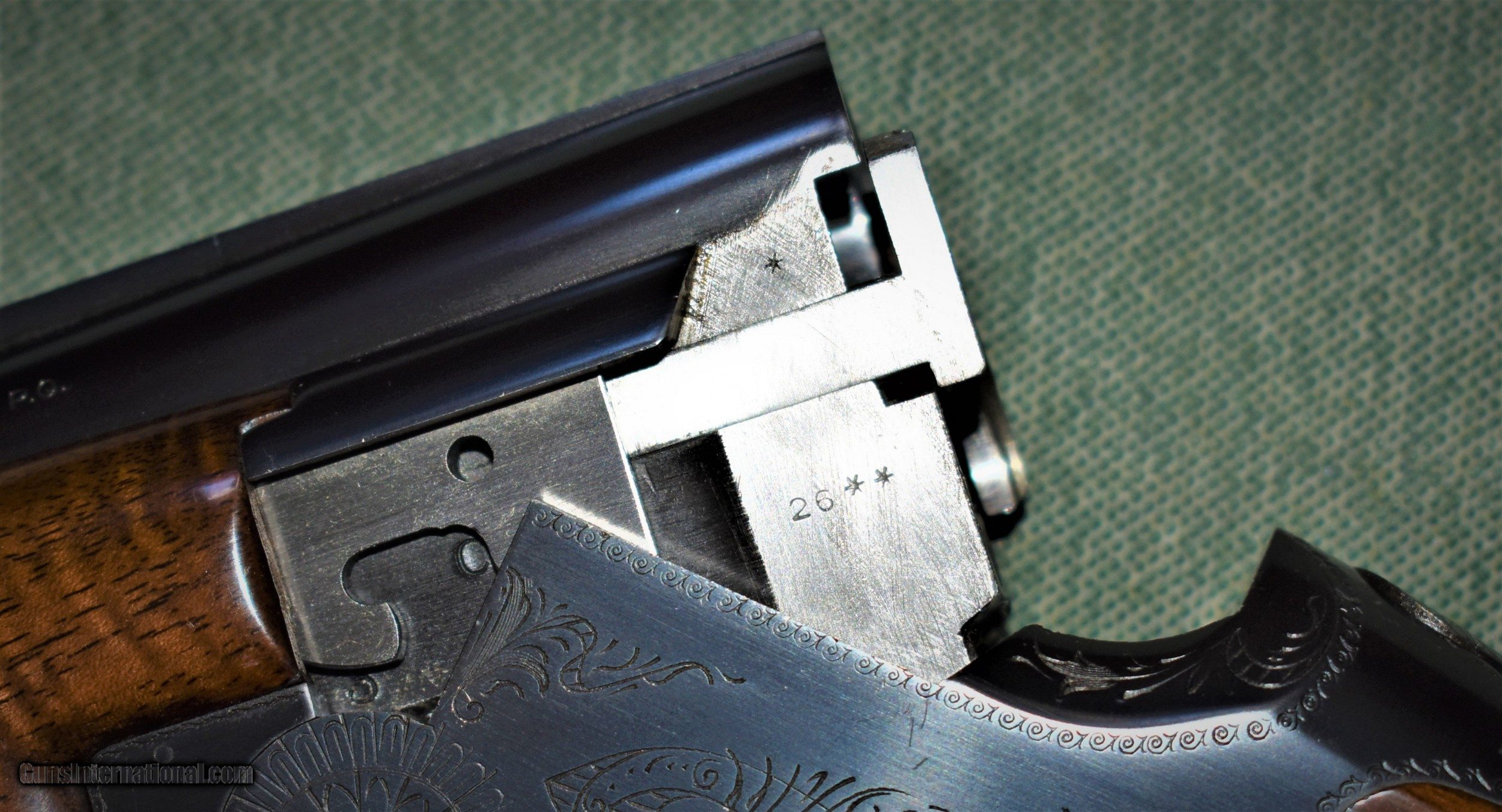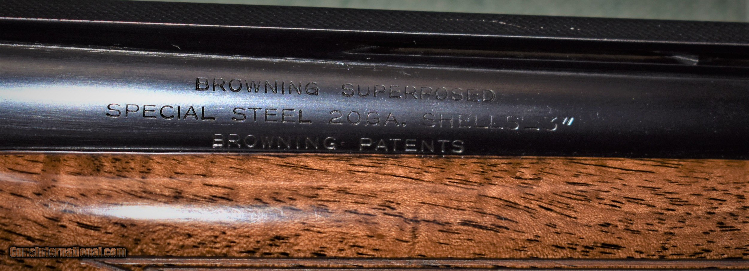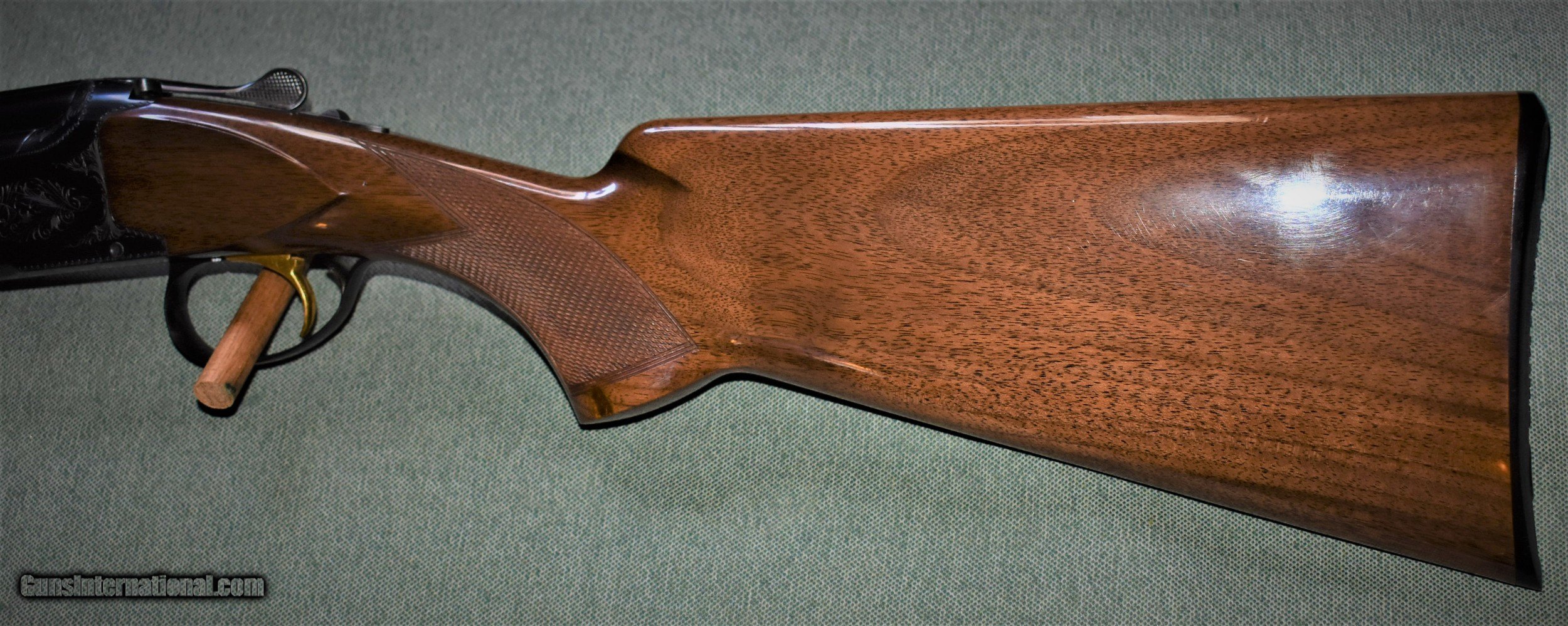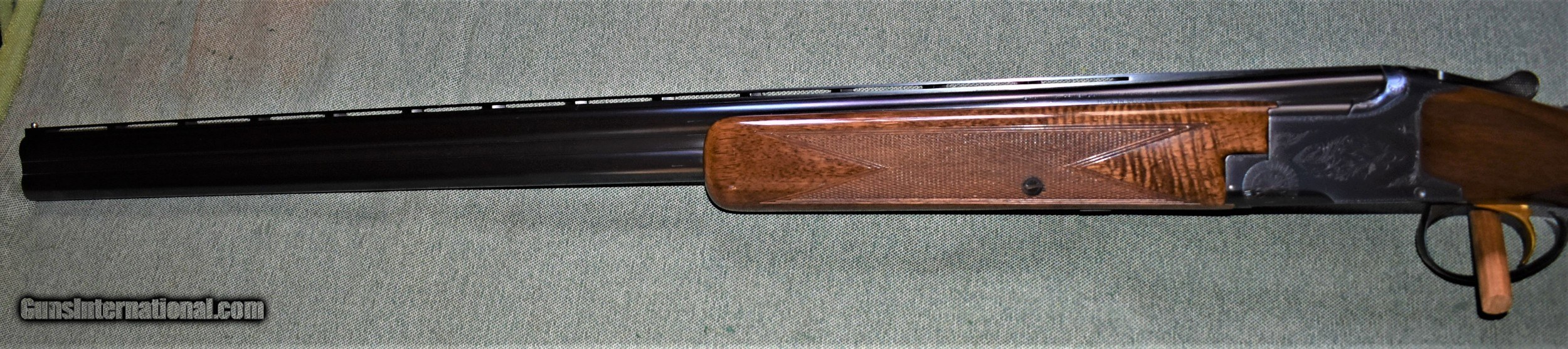 Description: Belgian Browning 20 gauge grade one superposed built in 1972. This gun is in like new condition retaining 100% of the original blue and wood finishes. The 261/2" vent rib barrels are choked modified and full. The stock has the square knob,long tang stoc and retains the original Browning buttplate. The gun is so new that the barrels are still stiff on opening. The gun is chambered to handle 3" shells and weighs in at 6-2. This would make a great walking pheasant gun or dove gun. Tested and is salt free. Very hard to find in this condition. SOLD Shotgun Gauge: 20 Gauge Manufacturer: Browning (FN) Model: Superposed Grade One Serial Number: 2104V72 Barrel Length: 261/2 Chambers: 3 Ejectors: yes Condition: mint Metal Condition: mint Wood Condition: mint Bore Condition: mint Barrel Type: Browning Special Steel Action: Over Under Triggers: single selectibe Butt Pad: Factory Buttplate Rib: Ventilated Manufacture Date: 1972 Choke Left: Full Choke Right: m |