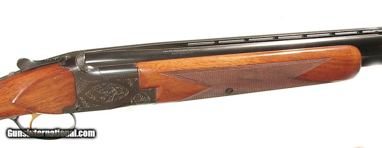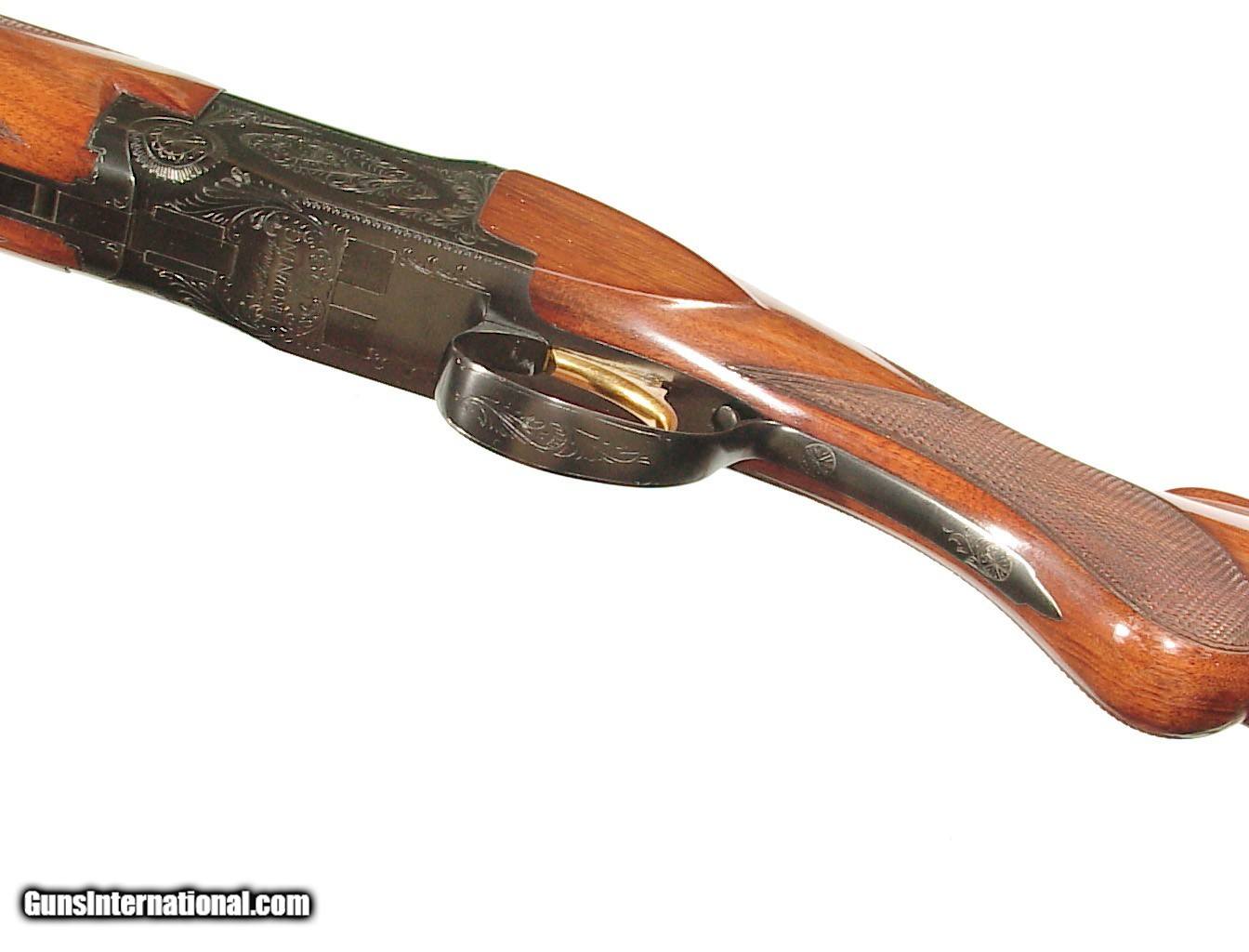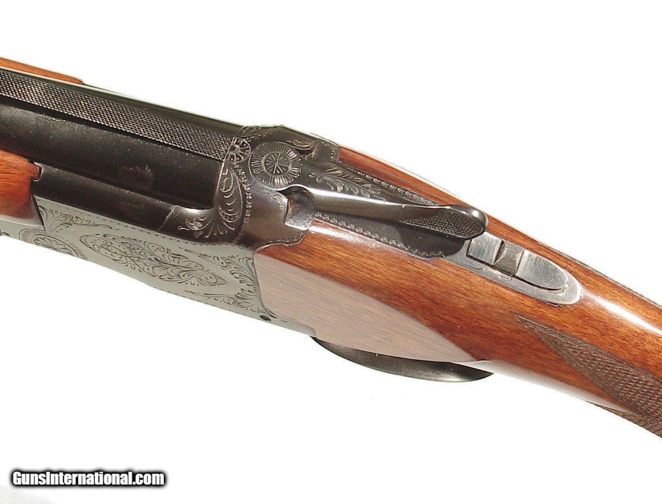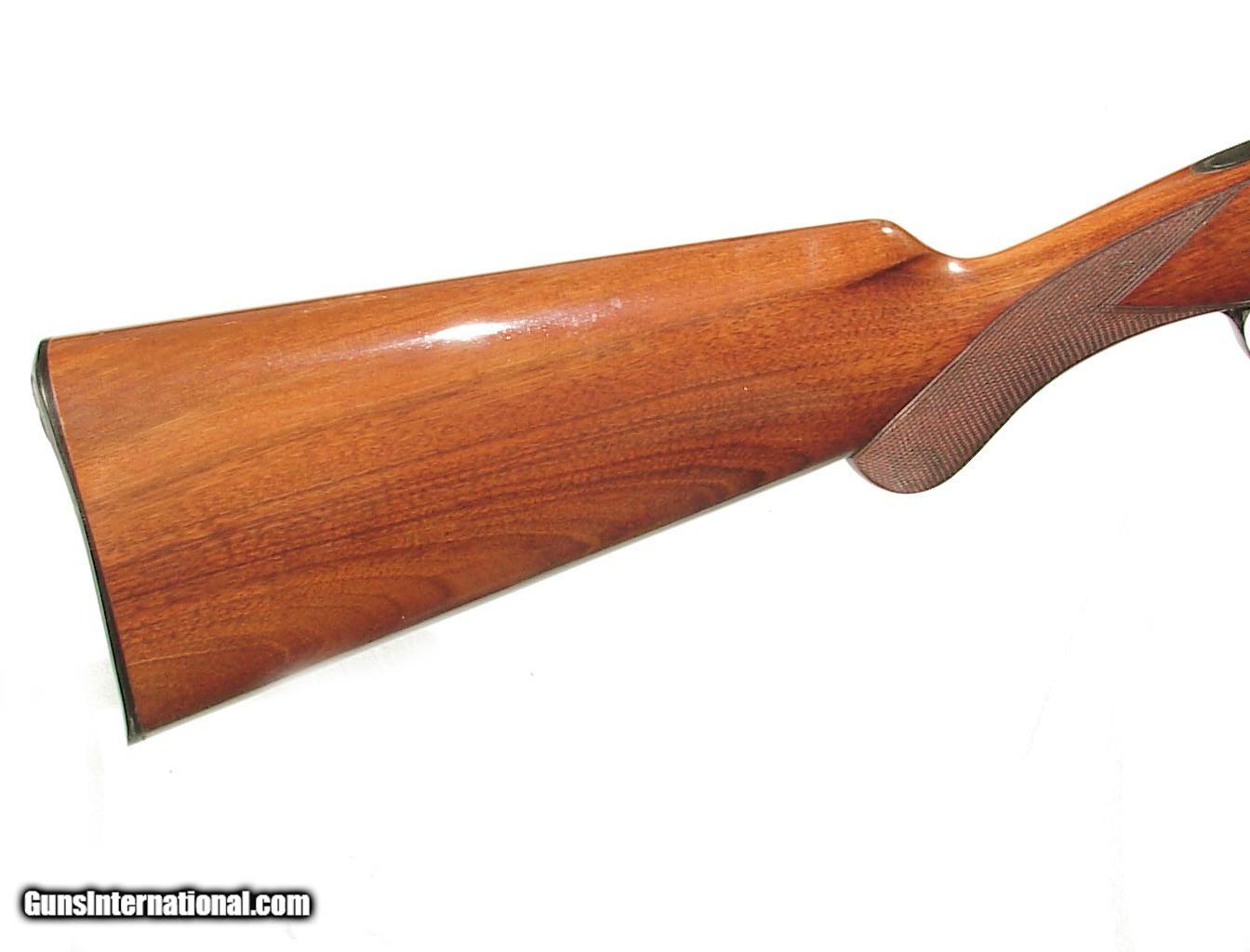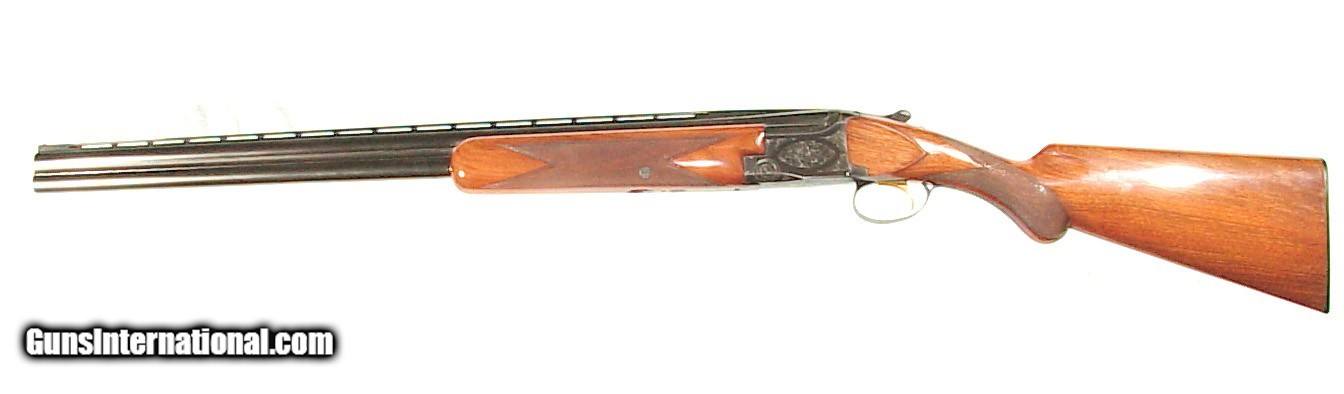 Description: 12 gauge, 26 1/2" barrels choked imp & mod. Superposed engraved action with auto ejectors selective with the top safety. Single trigger. Checkered forend and round knob pistol grip buttstock ending with factory buttplate. LOP: 14 1/4" COMB: 1 1/2" HEEL: 2 3/8" WEIGHT: 7lbs 3oz. In very near mint, unused original condition retaining 99% plus blue on the barrels and receiver. Super wood and checkering. Mint bores and mechanically perfect. 1960 mfg. SOLD Curio/Relic: Yes |