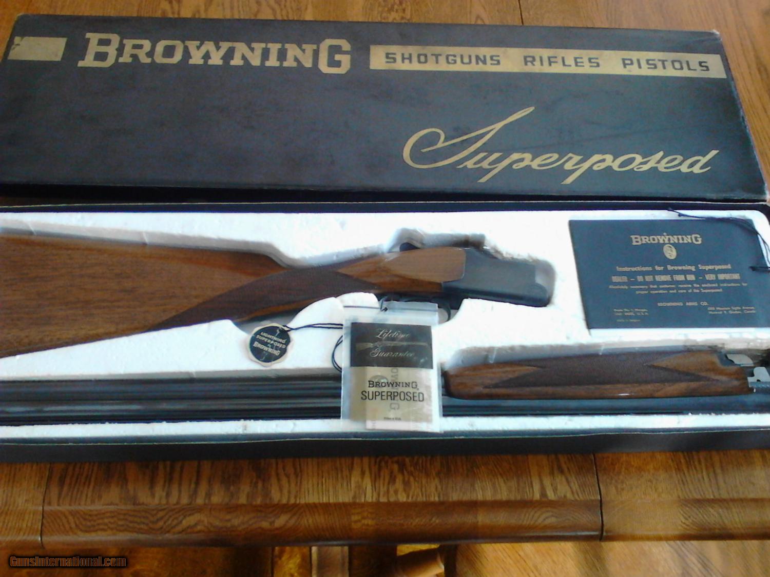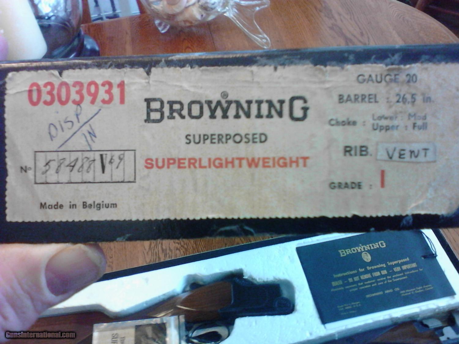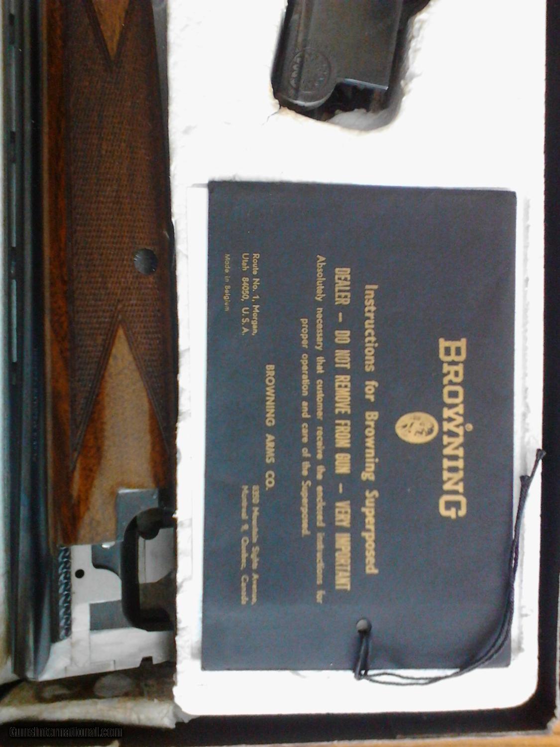 Description: Browning superposed super light weight 20 ga 26.5" Belgium made full and mod chokes with original hang tags and very good box.Mfg 1969. SOLD Manufacturer: Browning Model: Superposed Super lightweight Serial Number: 58488V69 Caliber Info: 20ga Bore: 2 3\4 Chambers: Full mod Ejectors: Yes Condition: Excellent Metal Condition: Excellent Wood Condition: Excellent Bore Condition: Excellent Barrels: Excellent Barrel Type: Vent rib 26.5 Action: O U Triggers: Single selective Gauge Info: 20 Stock: Super light straight english Stock Dimensions: UN cut Butt Pad: Original LOP: 14 1\4 Rib: Vent Finish: Blued Manufacture Date: 1969 Chokes: Full Case: Box Item Location: Findlay Ohio |
