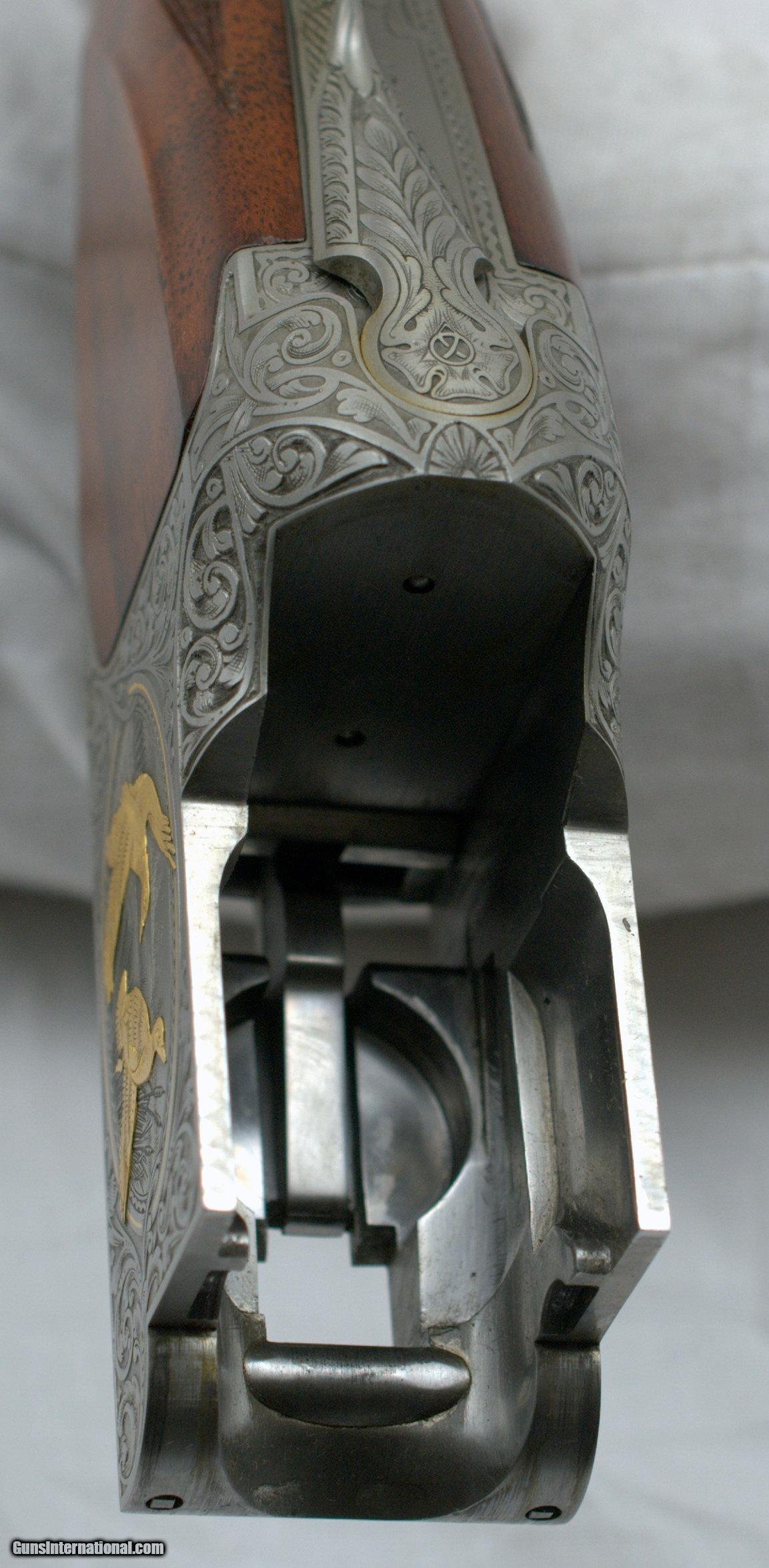Description: BROWNING B25 American Mallard 137 of 500 12 GA BEAUTIFUL CASED BROWNING MALLARD WATERFOWL SUPERPOSED 28″ Ventilated Rib barrels ... 2-3/4″ chambers ... Choked: MOD / FULL ... LOP 14 5/8" ... DAC 1 1/2" ... DAH 2 1/2" ... Weight: 7 lb 2 oz ... RKLT ... Ivory mid bead ... Simulated Ivory front bead ... Gold plated single selective trigger ... auto ejector ... non-automatic safety PROVENANCE: Rod Fuller Estate Collection. CONDITION: Extremely fine. As new. Has been fired but very well cared for. Special Note: This item contains or is made of ivory. Frame is beautifully scroll engraved with two gold mallards on right and left and two gold mallards on bottom and inlaid in gold “American Mallard 137 of 500 / Anas Platyahynchos” on the bottom of frame. Trigger guard beautifully acanthus engraved with gold mallard head on bow. Barrels retain virtually all its original blue. Frame is excellent. Mechanics are excellent. Bores are bright and shiny. Stock is RKLT configuration with 14-5/8″ LOP over skip line checkered butt. Stocks are beautifully checkered with nicely figured walnut. Buttstock shows virtually all its orig hand rubbed oil finish with minute handling marks. Accompanied by beautiful brass cornered full walnut case with maroon velvet lining and leather handle. Case is excellent overall with minor handling marks. Overall a beautiful high art Browning Superposed. Call with any questions and see our other listings for ... "Only the best!" SHIPPING INFORMATION: Buyer pays all shipping costs. SOLD |