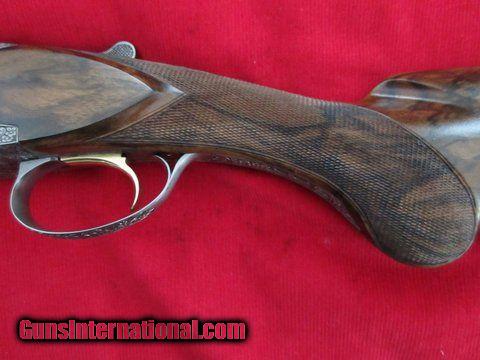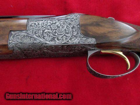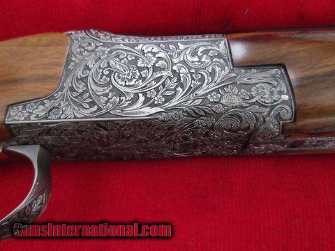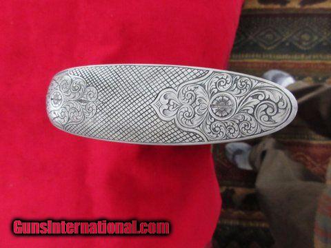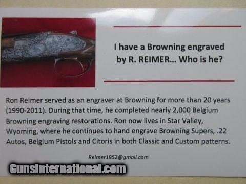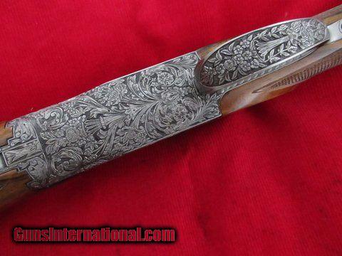 Description: Browning Superposed D5G .410 O/U shotgun . 26 1/2 " barrels , SK/SK . Gun is in New condition and has been engraved by former Browning Master Engraver Ron Reimer . It has beautiful European Walnut Wood . ( 1 1/2 x 2 1/2 x 14 1/4 " ) . Buttstock has a custom engraved steel buttplate in addition to 24 LPI over the grip checkering .Browning hard case included .Made in Belgium , Free Shipping . SOLD Serial Number: #1J345 |