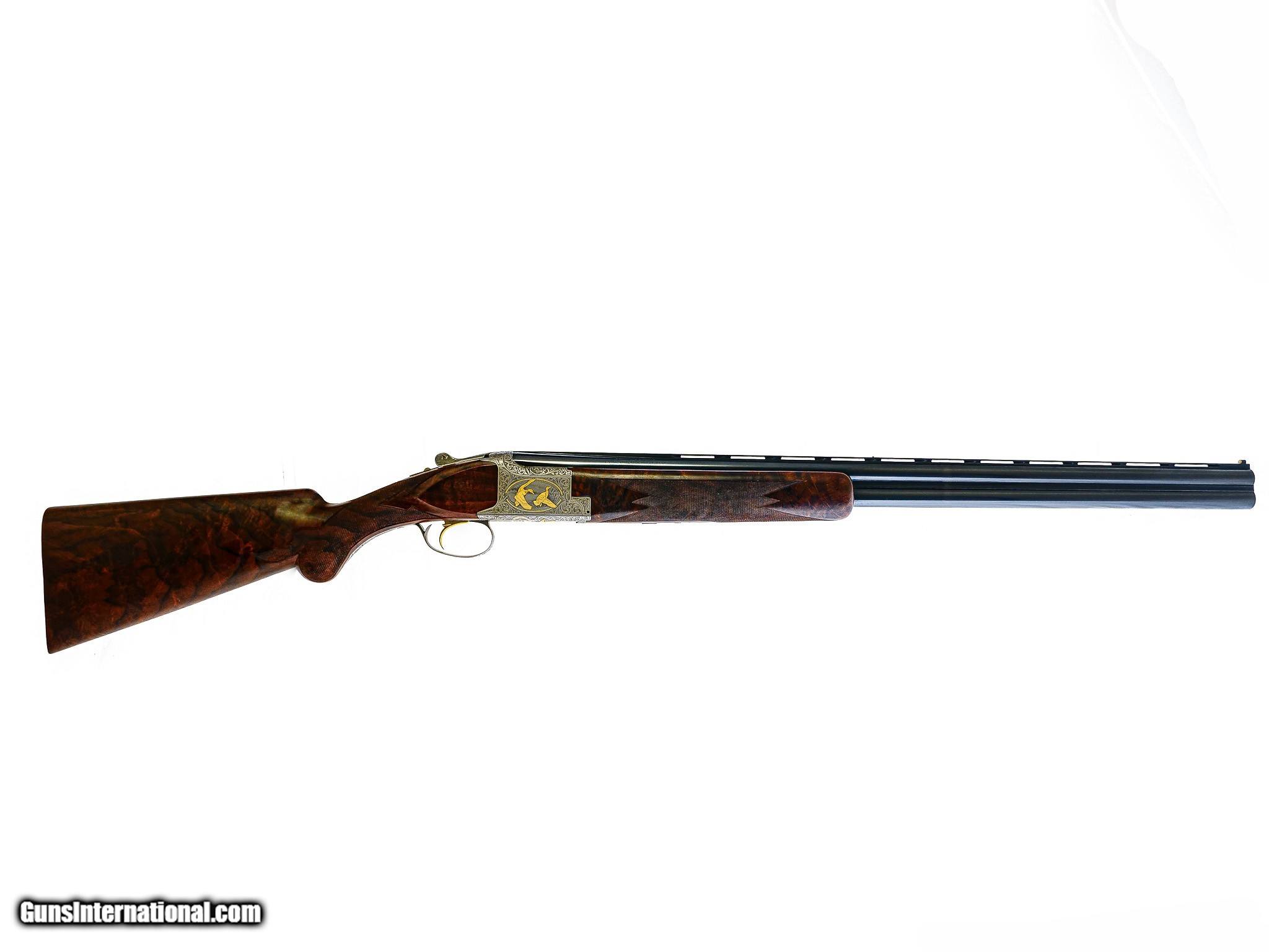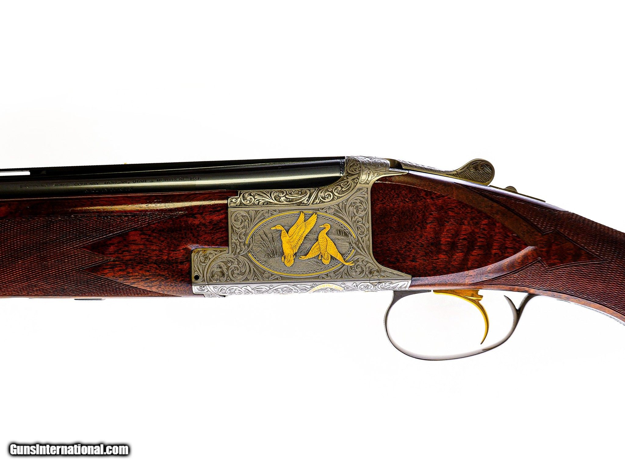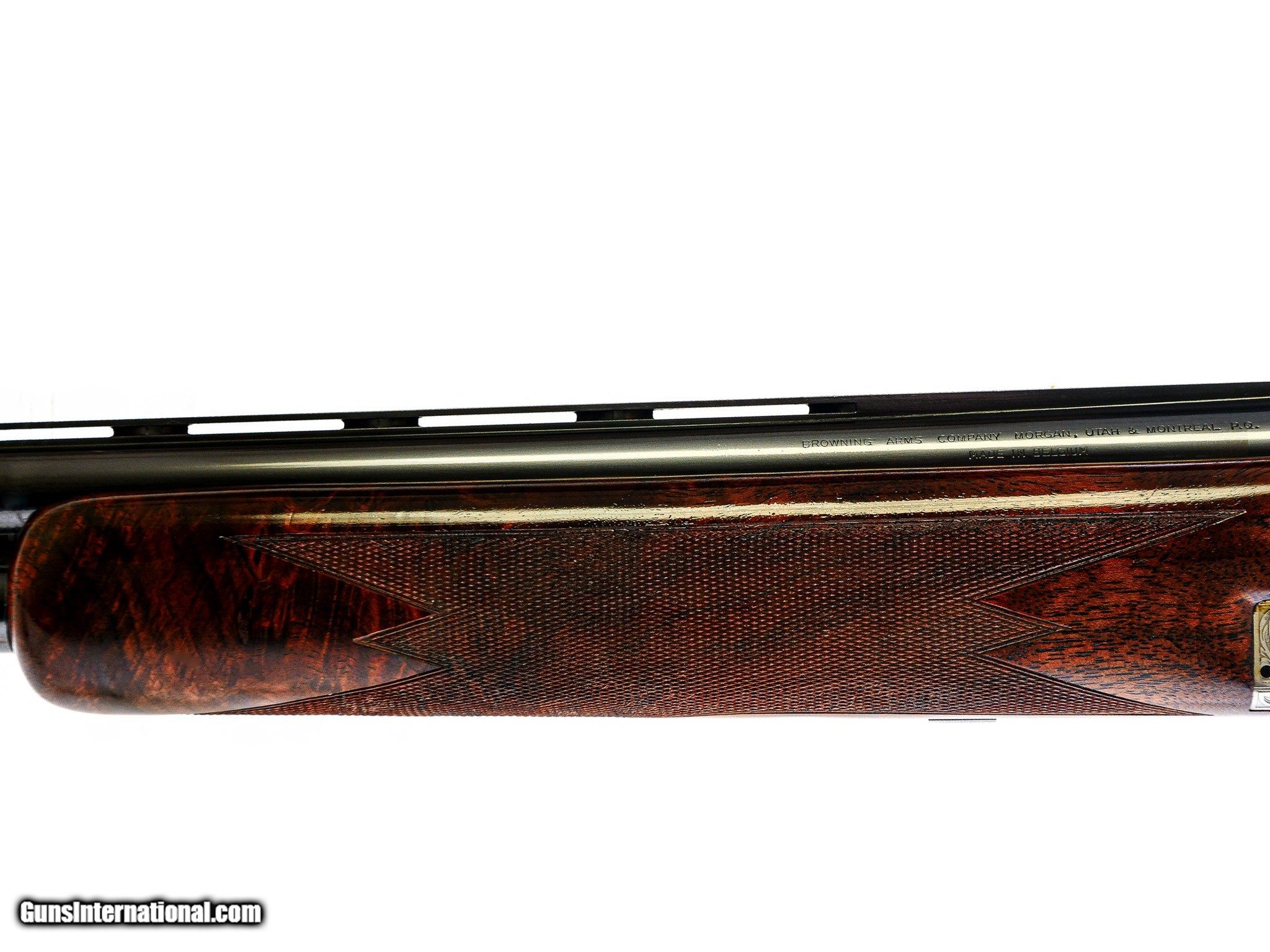 Description: Browning - American Mallard, O/U, Made In Belgium, 12ga. 28" Vent Rib Barrels Choked F/M. Round knob, long knob, long tang, checkered butt, magnificent gold inlay mallard, engraving #291 of 500. Beautifully figured stock, choked Full/Mod. Brand new gun produced in 1980, unfired and perfect in every way. The ultimate collector gun of Browning Over-and-Unders. Inv: 66559 14 3/8" x 1 1/2" x 1 3/8" $10,500.00 SOLD |