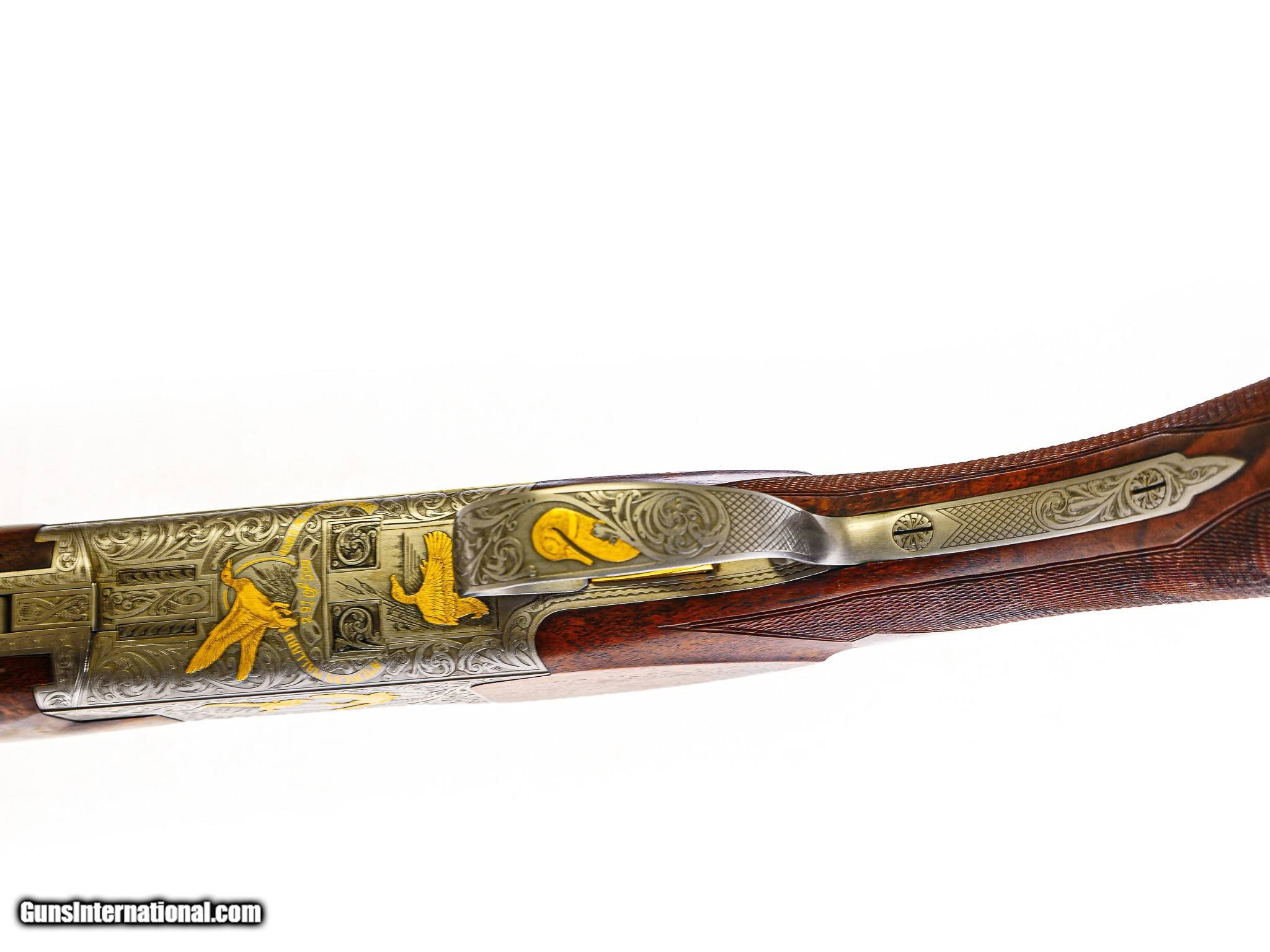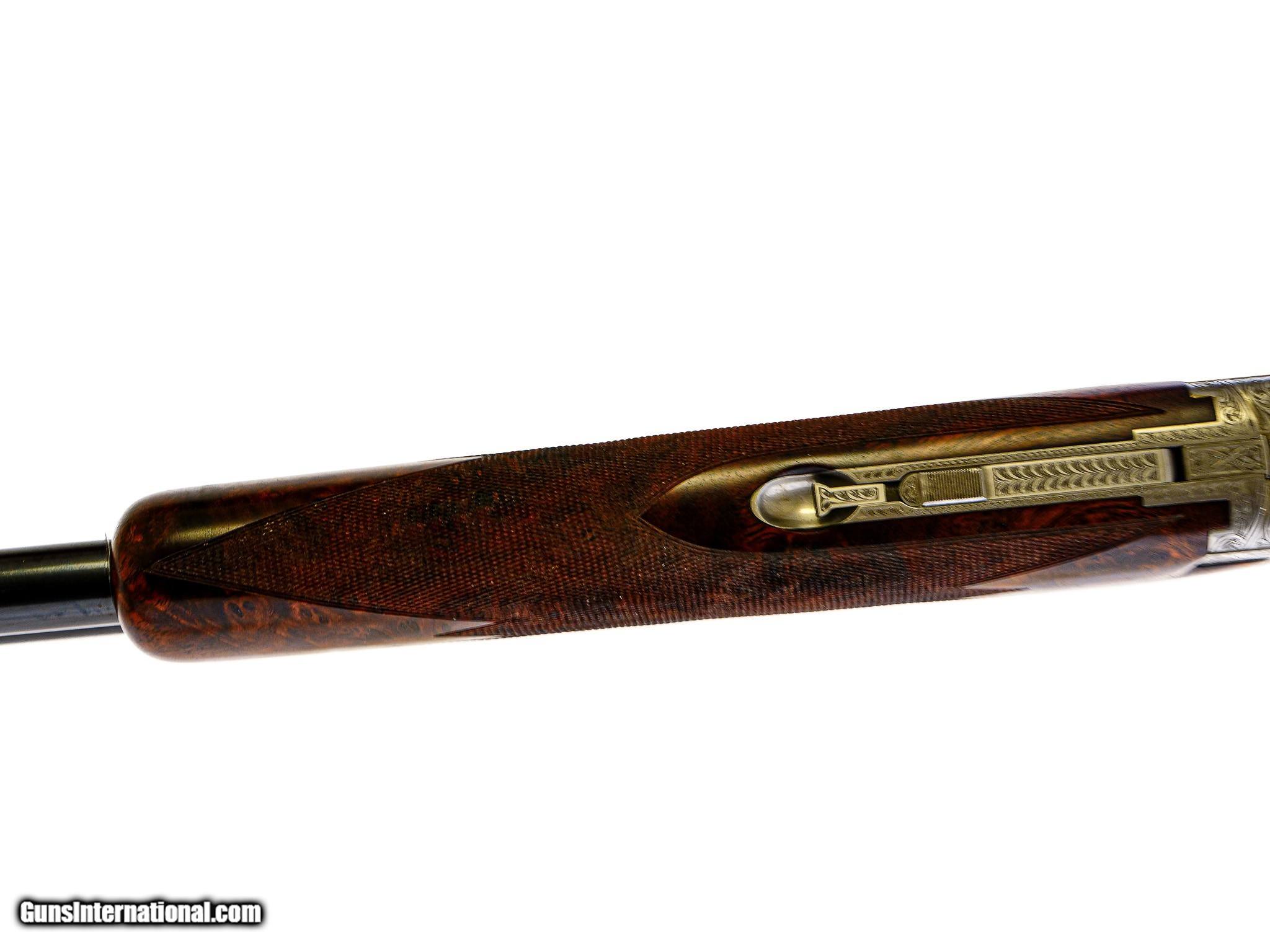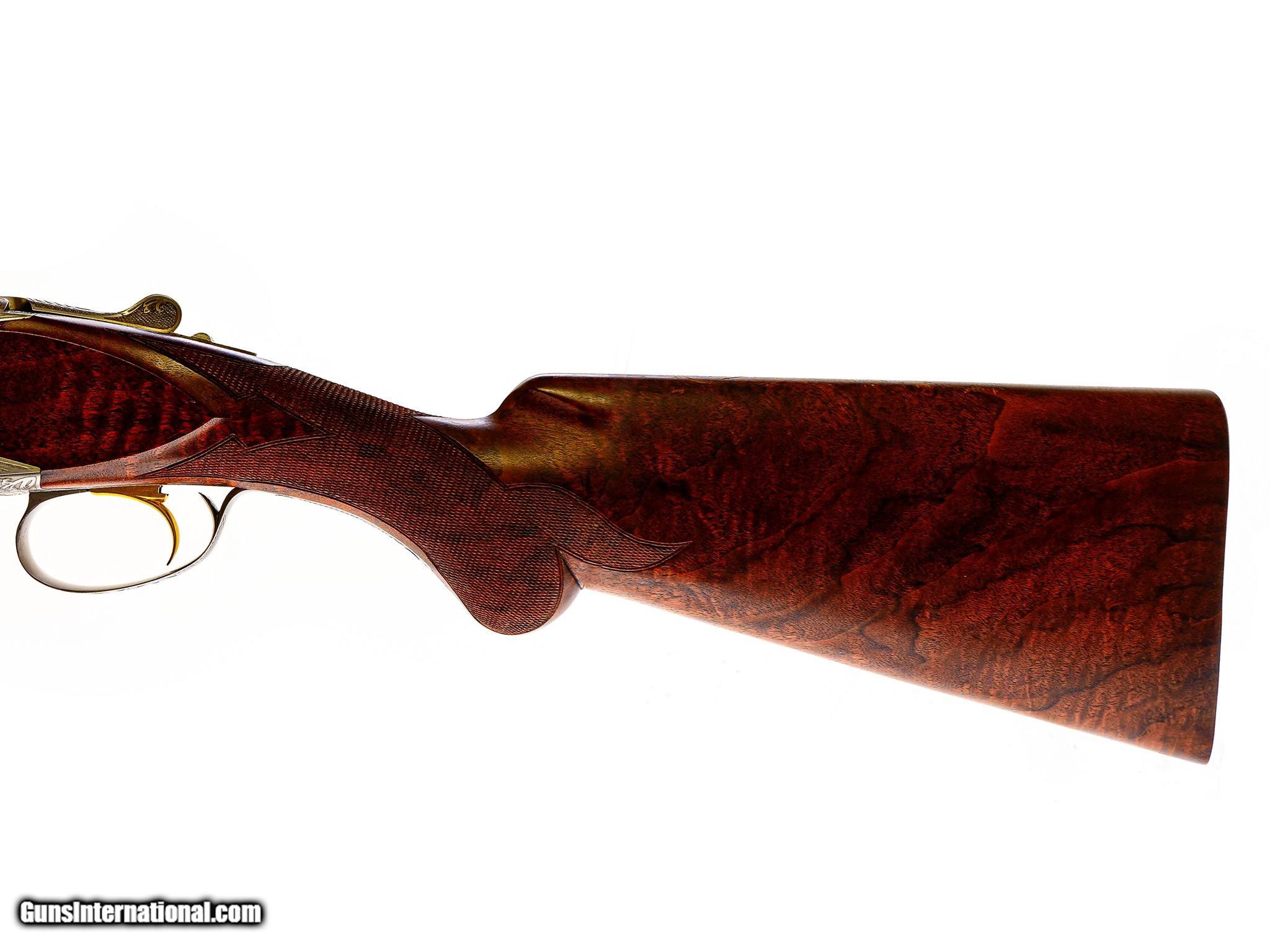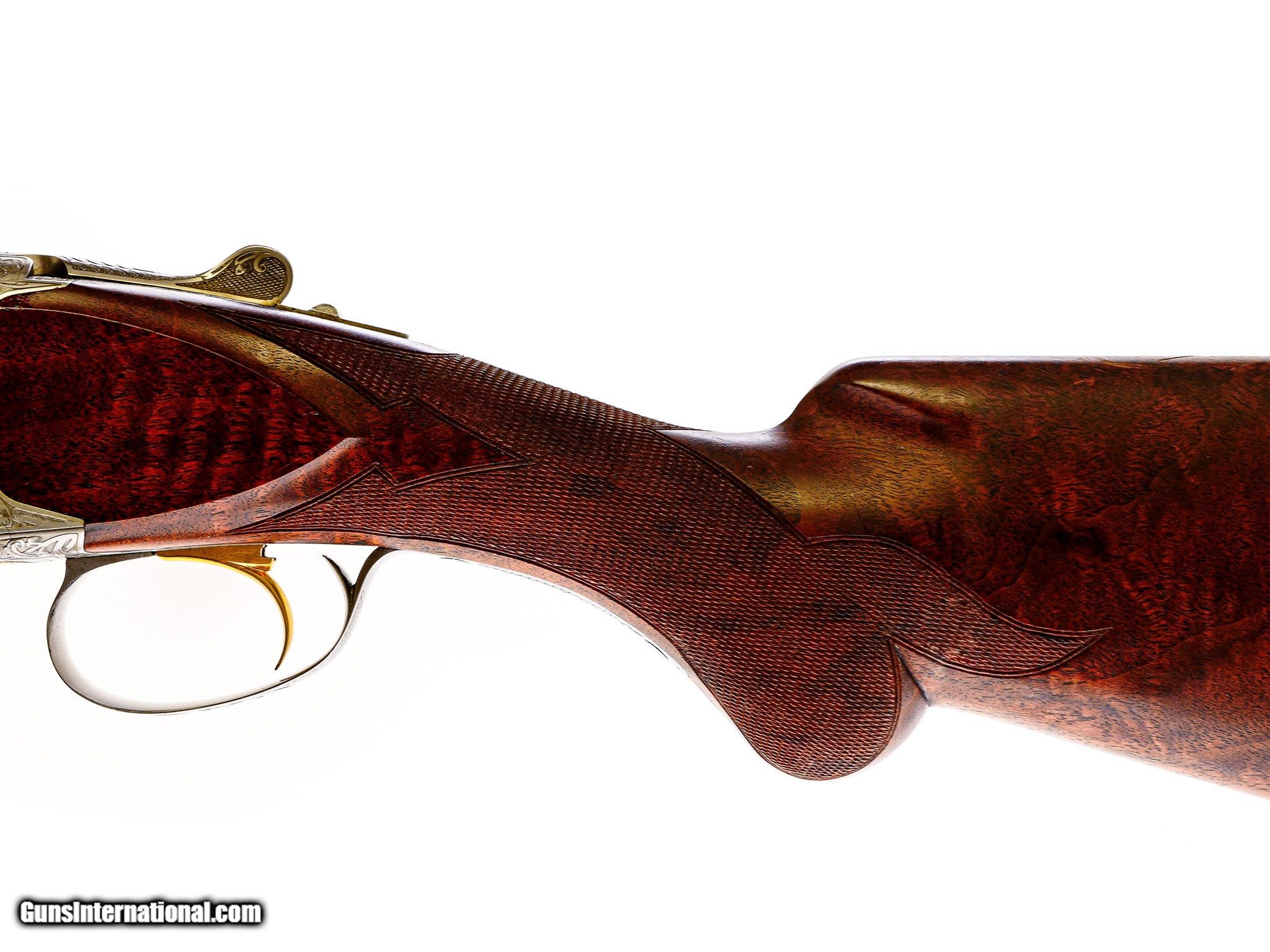 Description: Browning - American Mallard, O/U, Made In Belgium, 12ga. 28" Vent Rib Barrels Choked F/M. Round knob, long knob, long tang, checkered butt, magnificent gold inlay mallard, engraving #291 of 500. Beautifully figured stock, choked Full/Mod. Brand new gun produced in 1980, unfired and perfect in every way. The ultimate collector gun of Browning Over-and-Unders. Inv: 66559 14 3/8" x 1 1/2" x 1 3/8" $10,500.00 SOLD |