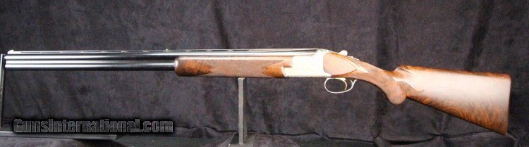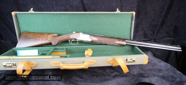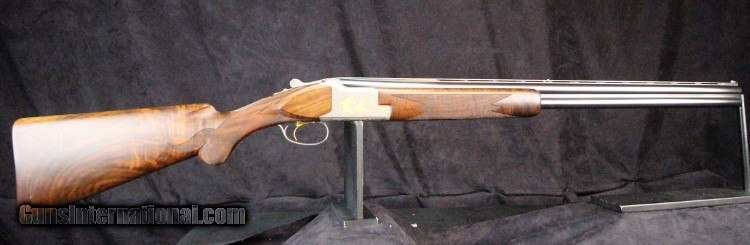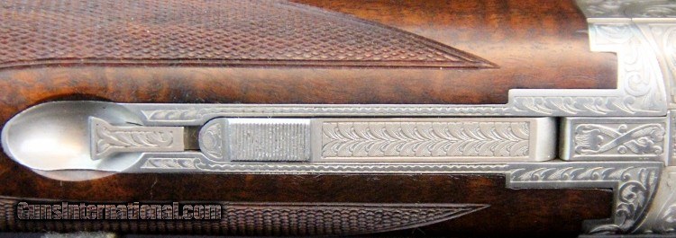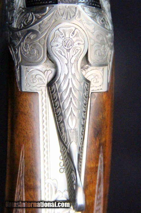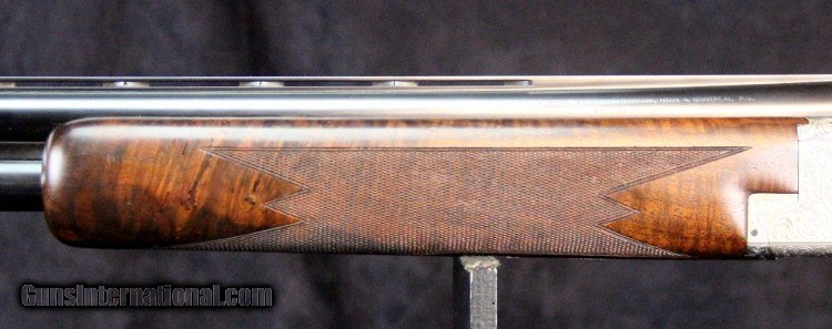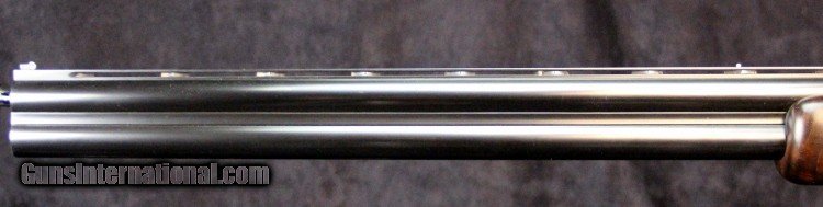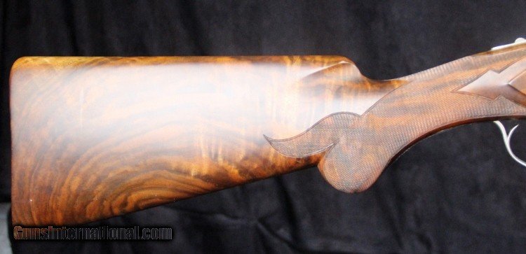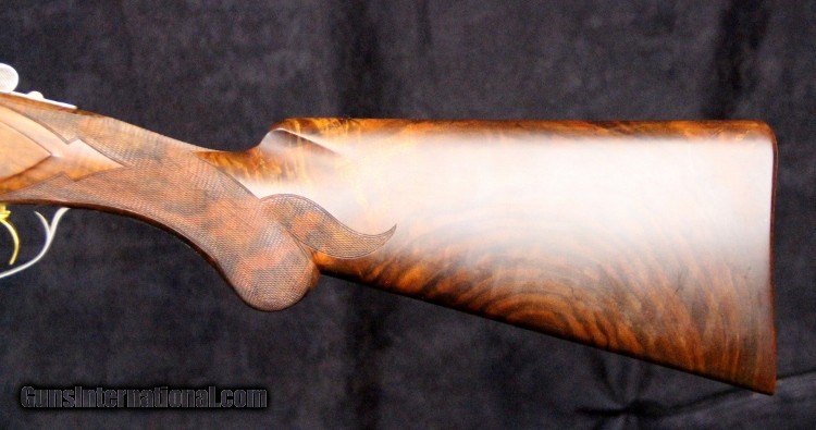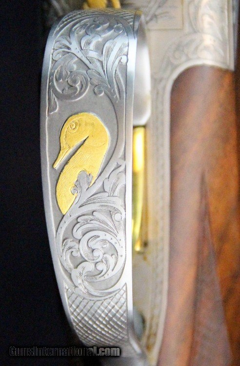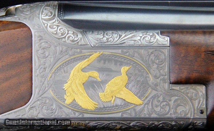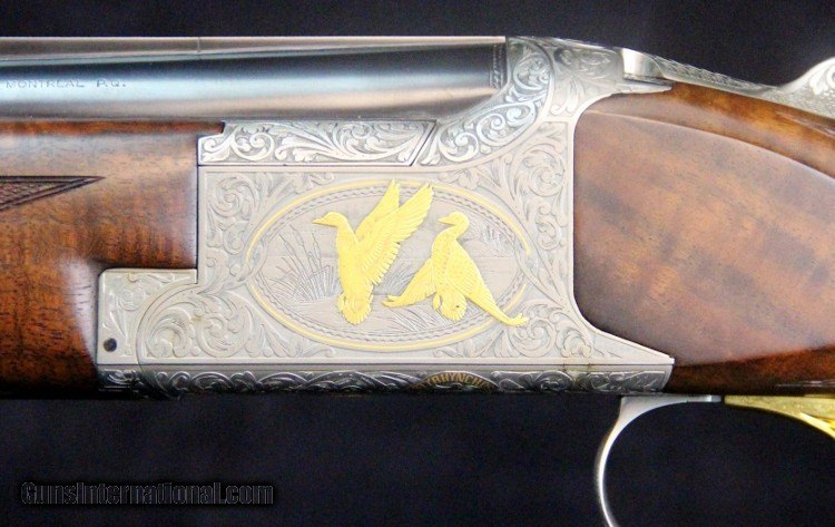 Description: 12ga, #8G4PM00336, #336 of 500, 28 inch barrels, Belgian made, F/M chokes, 3 inch chambers, 14 1/4 inch LOP, blue and engraved stainless finish with gold mallard inlays, rich burled walnut stock and forearm, SS trigger, ejectors, case. Condition: fine condition overall SOLD |