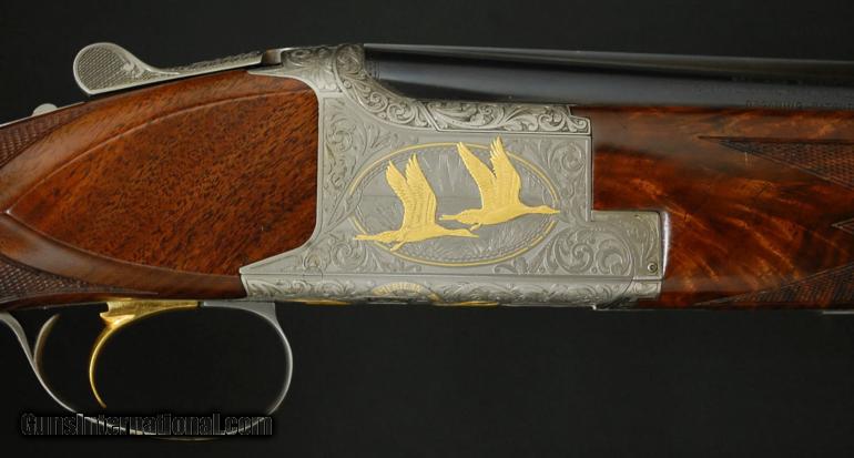 Browning American Pintail, Belgian manufacturer 12ga, 28” barrels, MOD/FULL, Round knob, long tang, checkered butt, the highest figured exhibition piece, feathered walnut, gun number 181 of 500, magnificent scroll engraving with raised gold, pintails, superb belgian workmanship, brand new in its presentation wood box. These highly collectible Brownings are some of the most ornate Brownings ever made. And represent the best collecting opportunities.