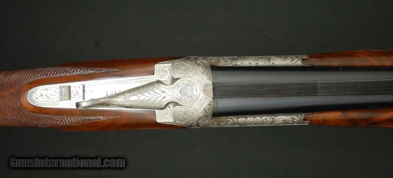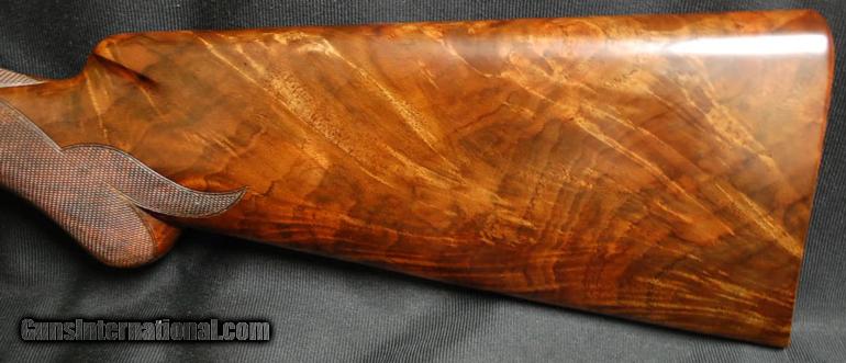 Description: Browning American Pintail, Belgian manufacturer 12ga, 28” barrels, MOD/FULL, Round knob, long tang, checkered butt, the highest figured exhibition piece, feathered walnut, gun number 181 of 500, magnificent scroll engraving with raised gold, pintails, superb belgian workmanship, brand new in its presentation wood box. These highly collectible Brownings are some of the most ornate Brownings ever made. And represent the best collecting opportunities. 14 1/2 x 1 1/2x 2 ½ INV# 24173 7lbs 8oz $9,995.00 SOLD |