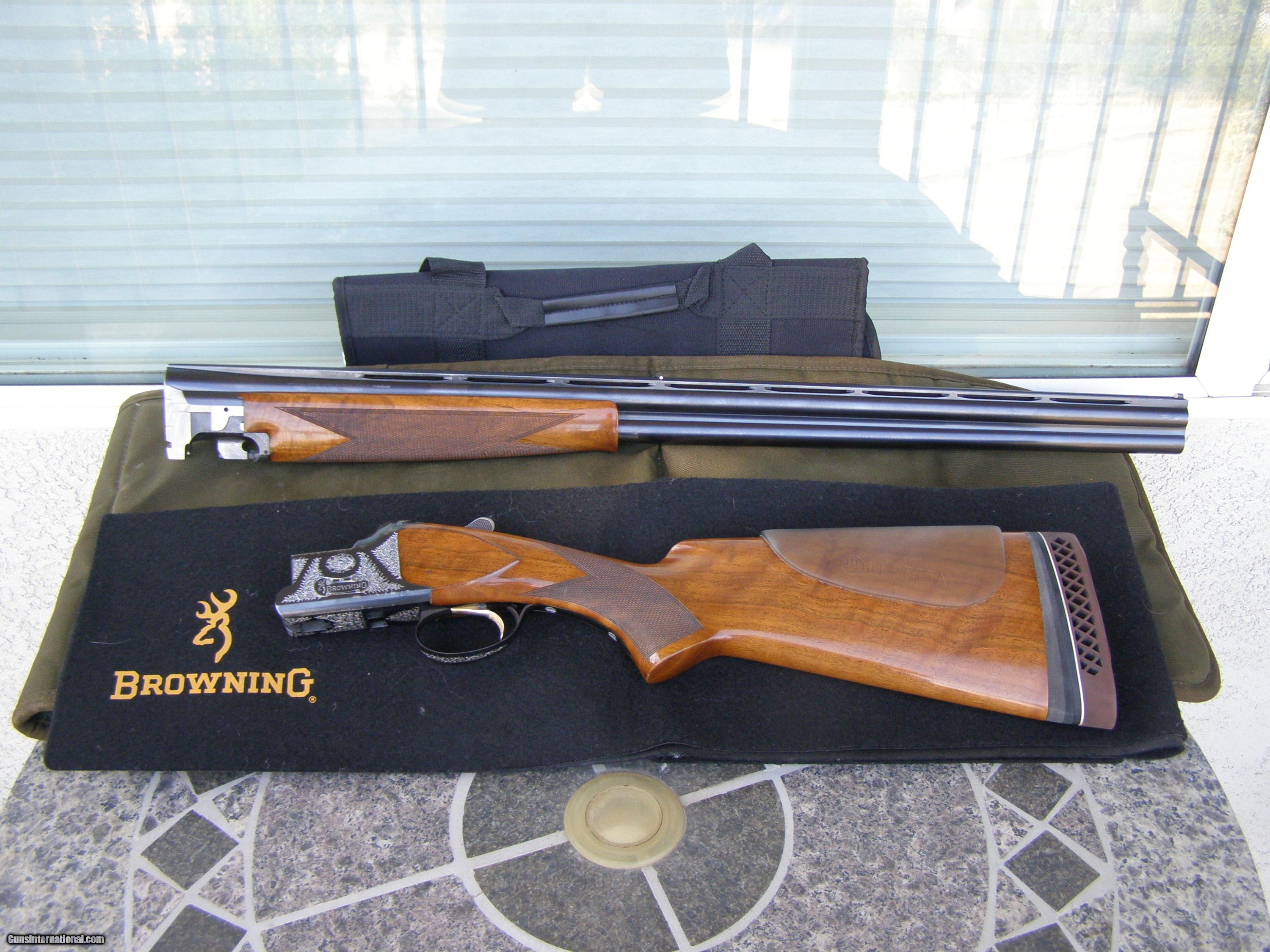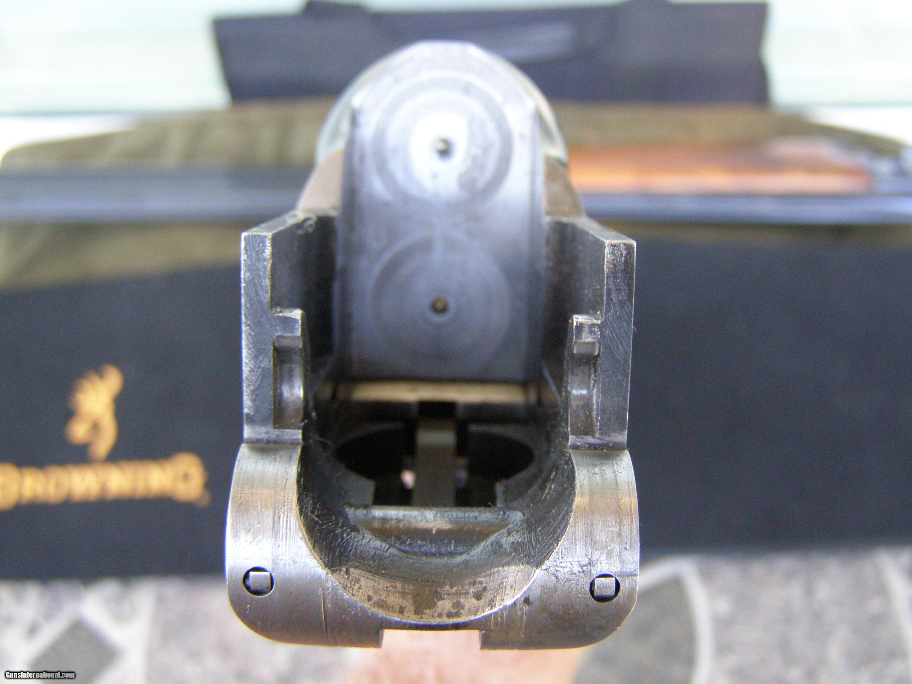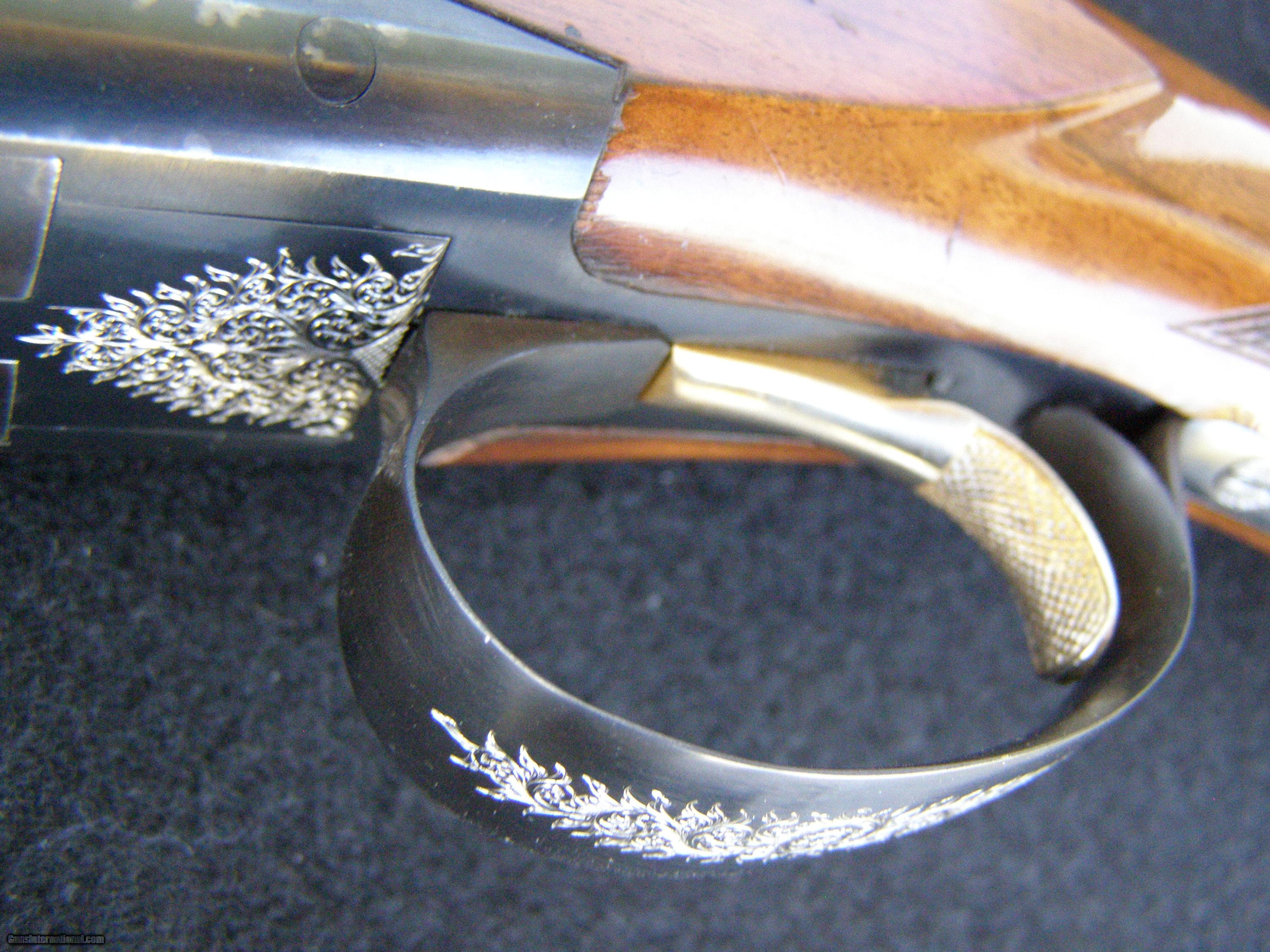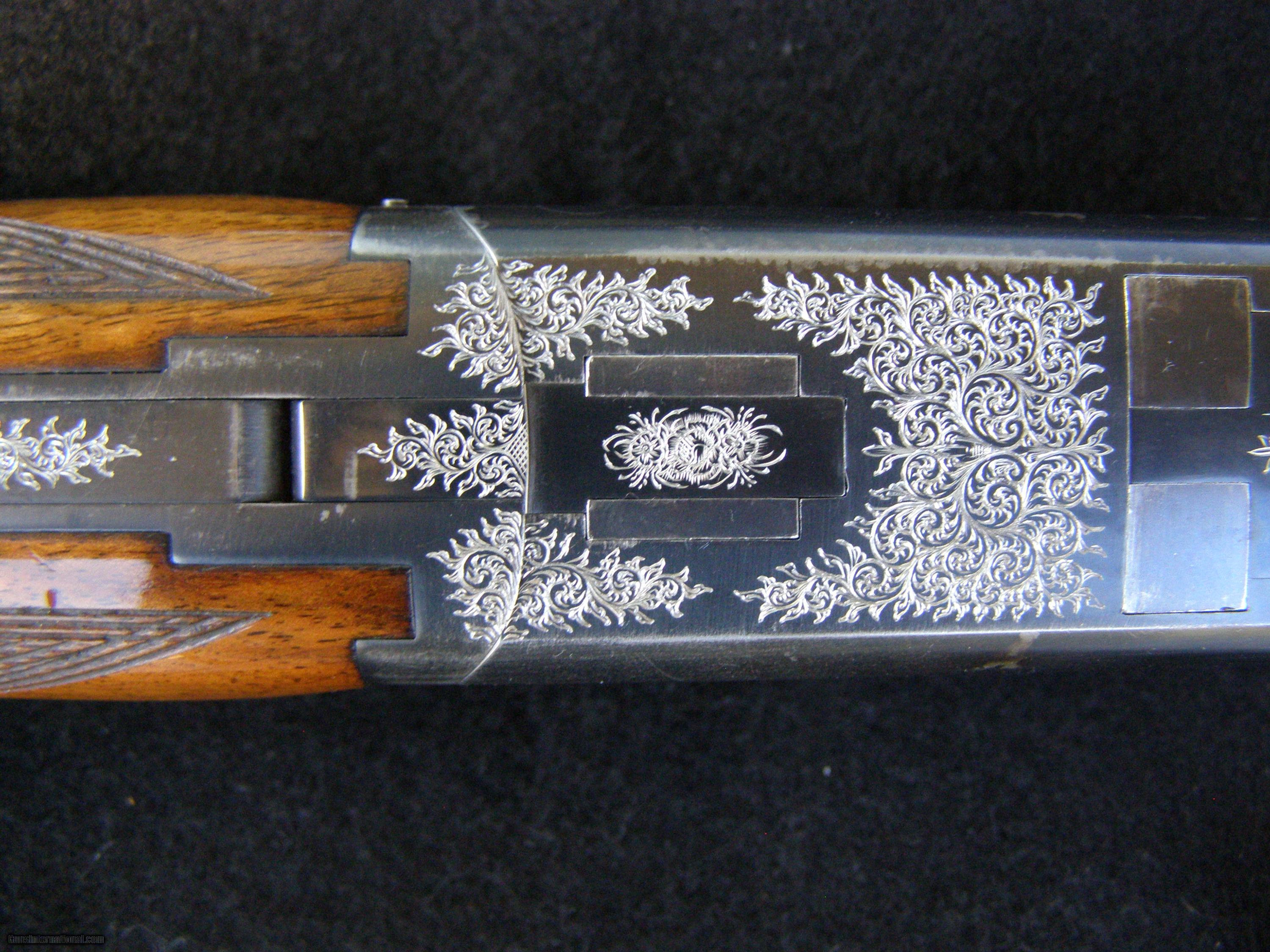 Description: RARE Belgian Browning Superposed "Sporting Clays" twelve gauge, 3" mag shotgun. Thirty (30) inch bbls choked IC/Mod w/medium width sporting rib & Schnabel forend. Fifteen (15) inch LOP to Pachmayr pad. Ser # 8J3Py151xx. Flat knob, long tang. Target trigger. Top lever right of center. Custom rose scroll engraving by master engraver Charles Lee, formerly of Purdey. Very good condition. Please add $35 for shipping & insurance to your Lower 48 FFL dealer. SOLD |