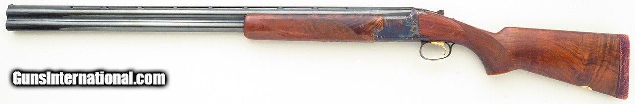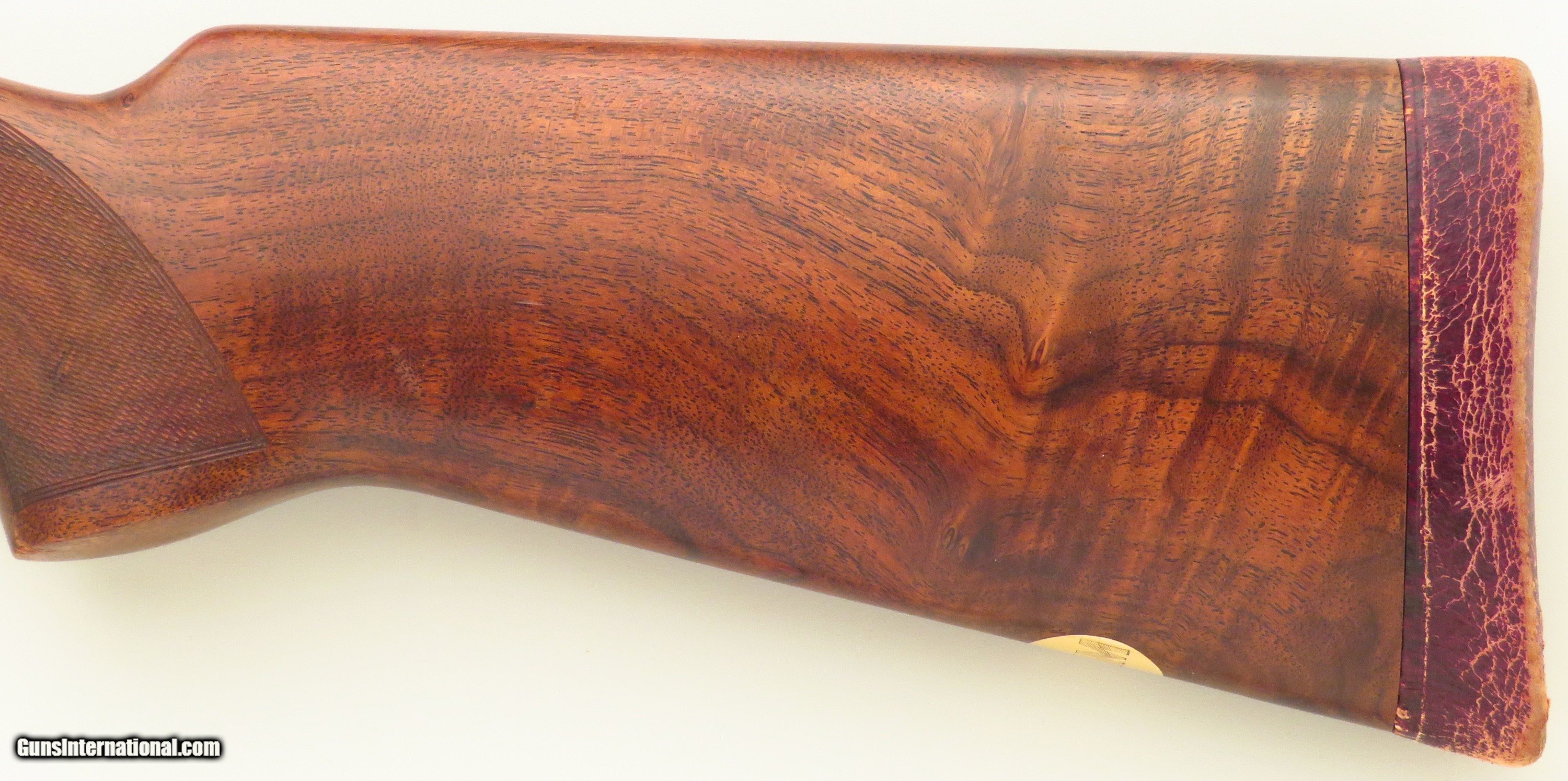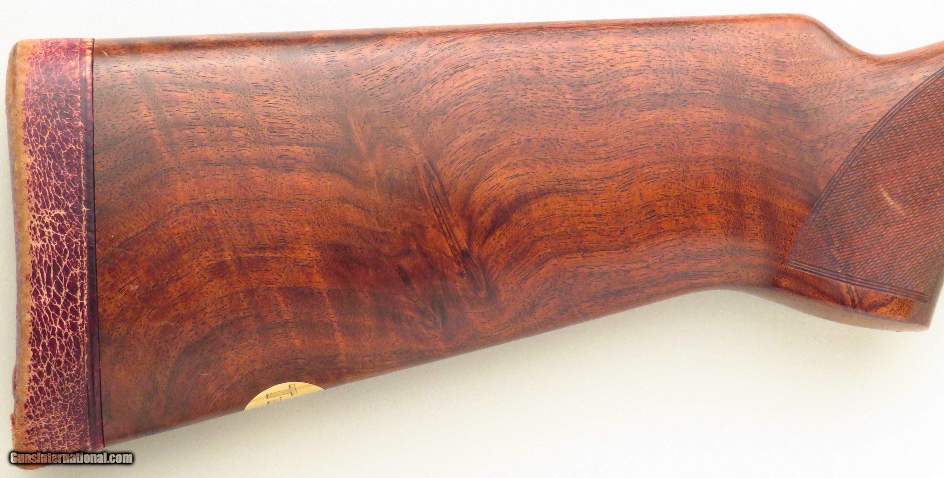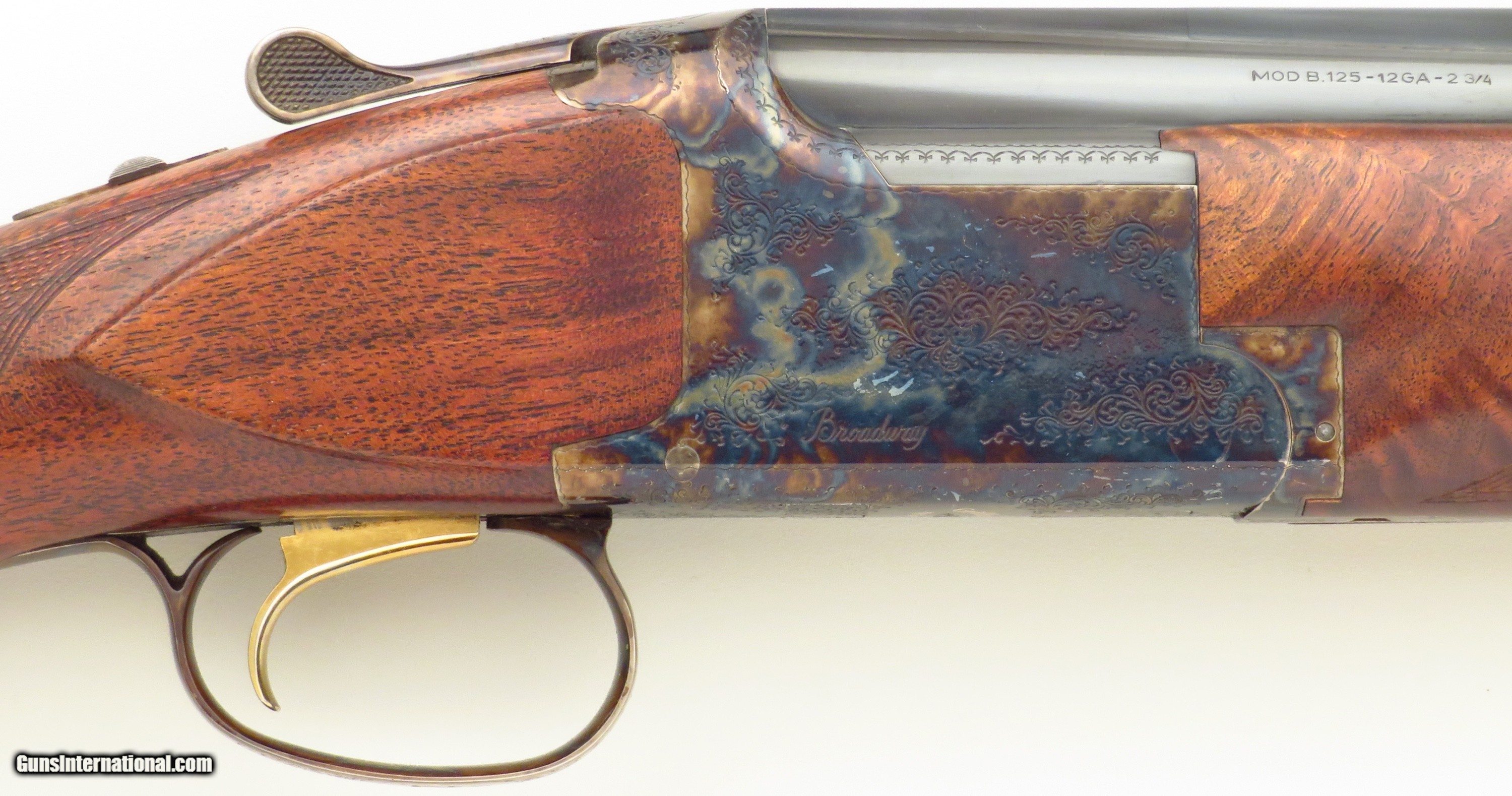 Description: Browning B-125 Broadway 12 gauge. Imported circa 1990 among a special edition commissioned by Griffin & Howe, serial 252NR07GH has a 30-inch barrel (Invector choke tubes, .510-inch wide matted rib, 2.75-inch chambers, ejectors). Features include a mechanical safety/selector, inertia trigger, color case action, along with a AA-grade walnut stock with panel checkering and a leather-covered recoil pad. No box or papers. CHOKE TUBES: Two are included - (IC & F). ENGRAVING: Signed 1x by P. Lallemand, the receiver, lever, latch and guard wear a bordered scroll patter to some 50 percent coverage. DIMENSIONS: Weight is 8.0 pounds. Length-of-pull is 14.2 inches, drops are 1.5 and 1.9 inches, and cast off is approximately .35 inches. CONDITION: The bores are flawless, mechanics are snappy and barrels full on face (and open with resistance). Barrel finish is at least 95 percent, colors are vivid with trace lifting of laquer and wood approximately 95 percent with a chip in the grip and rubbing on the pad cover. The price is firm and layaway is available. $2,250 plus shipping. SOLD Shotgun Gauge: 12 Gauge |