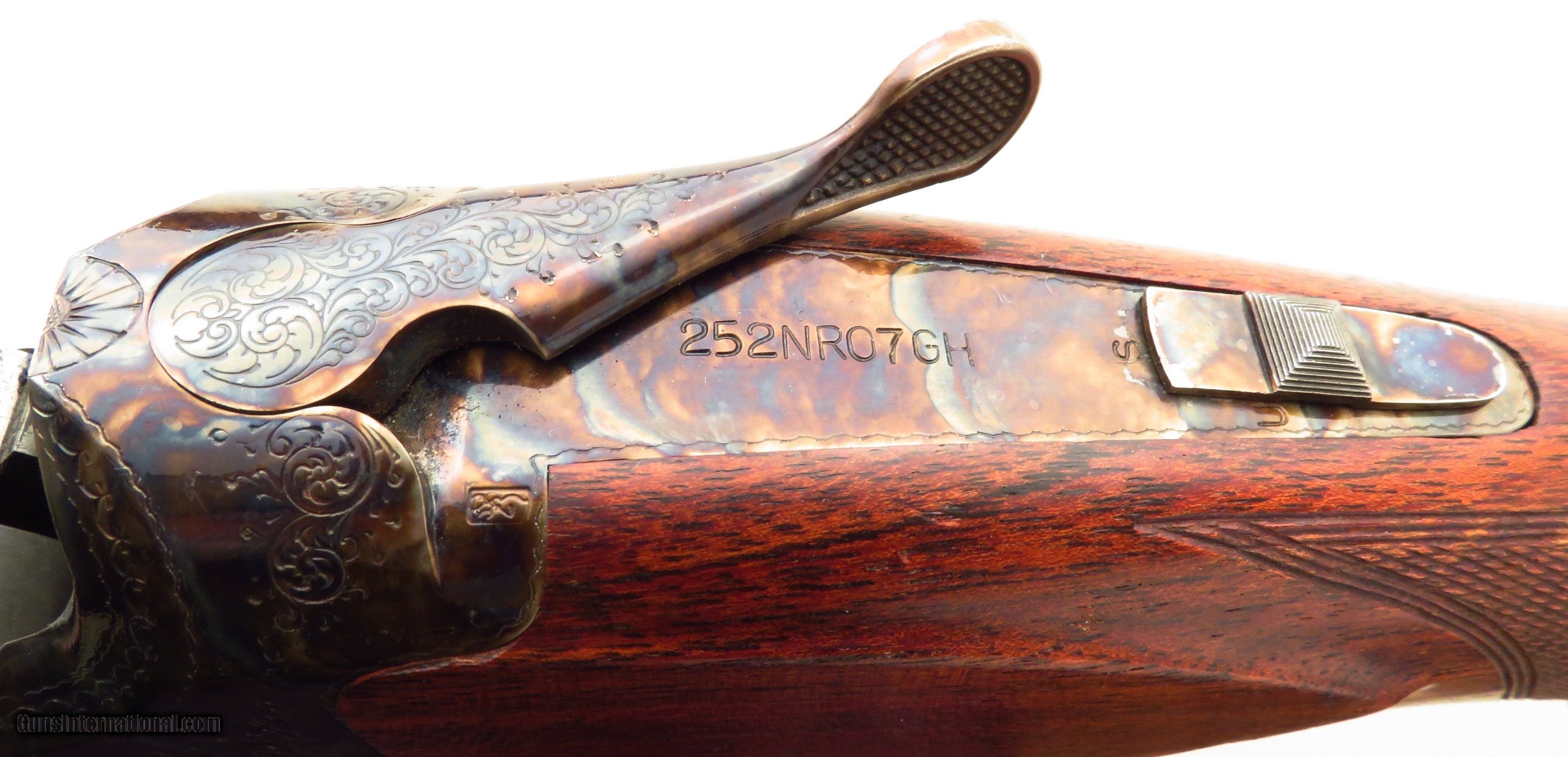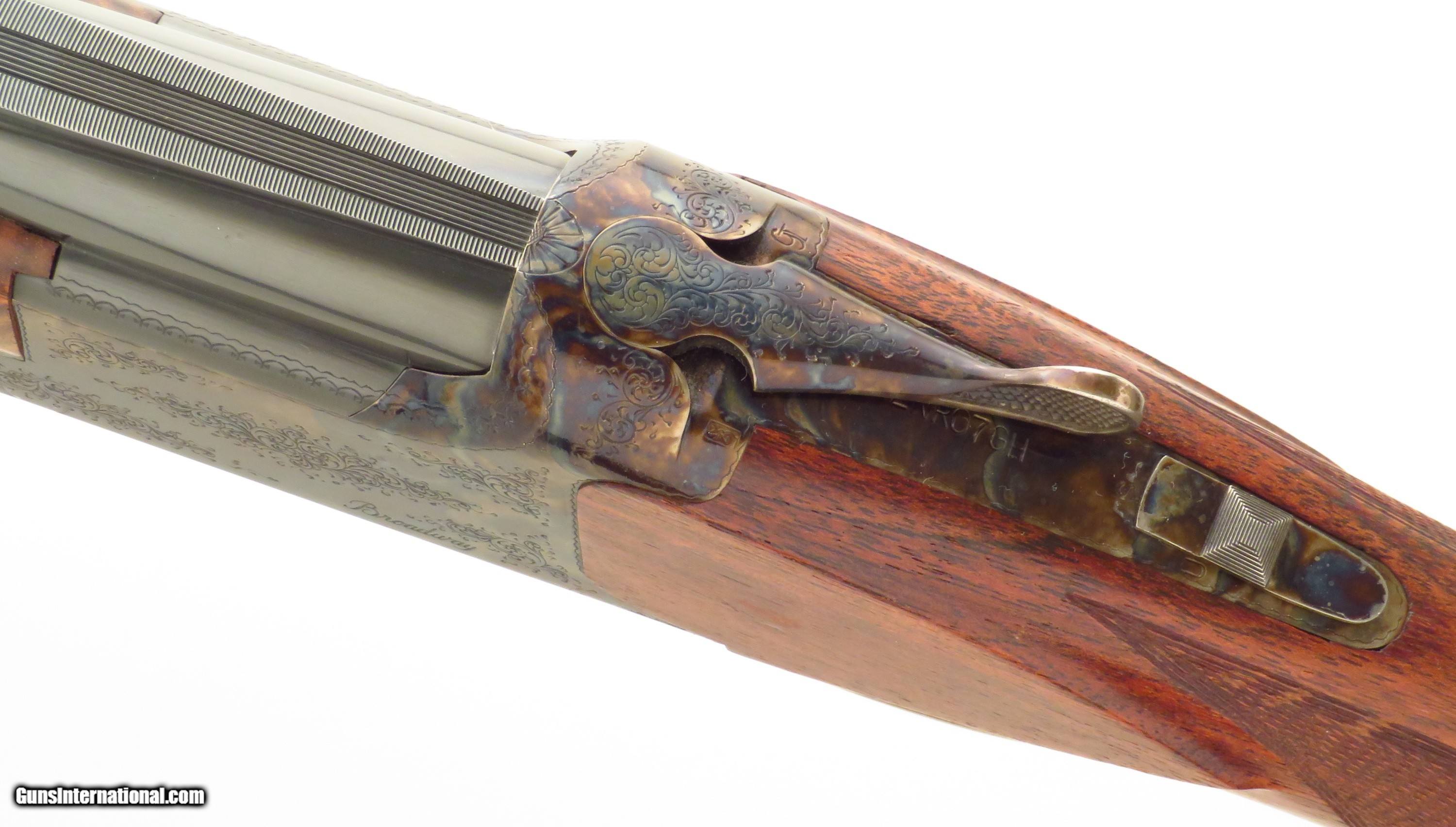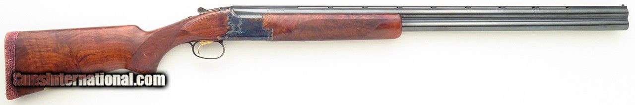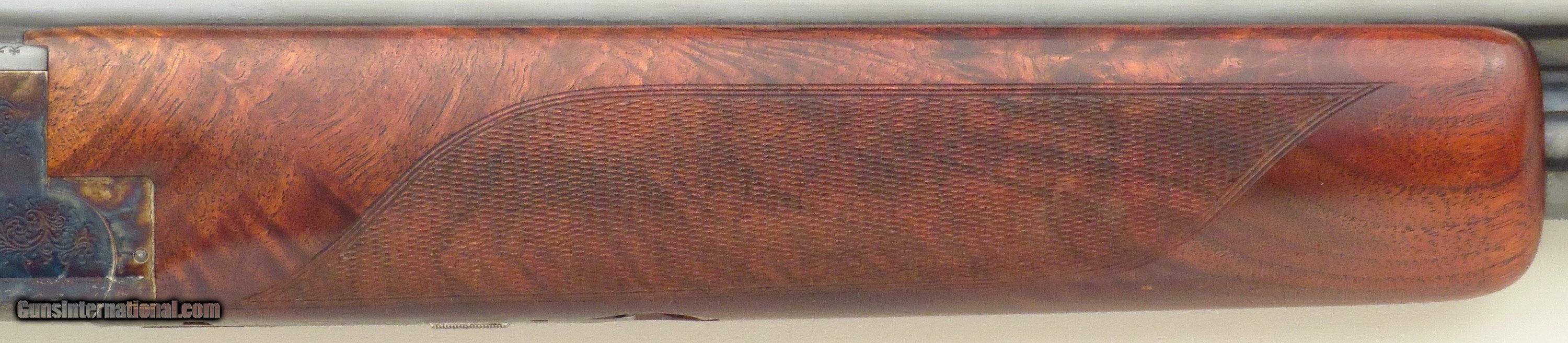 Description: Browning B-125 Broadway 12 gauge. Imported circa 1990 among a special edition commissioned by Griffin & Howe, serial 252NR07GH has a 30-inch barrel (Invector choke tubes, .510-inch wide matted rib, 2.75-inch chambers, ejectors). Features include a mechanical safety/selector, inertia trigger, color case action, along with a AA-grade walnut stock with panel checkering and a leather-covered recoil pad. No box or papers. CHOKE TUBES: Two are included - (IC & F). ENGRAVING: Signed 1x by P. Lallemand, the receiver, lever, latch and guard wear a bordered scroll patter to some 50 percent coverage. DIMENSIONS: Weight is 8.0 pounds. Length-of-pull is 14.2 inches, drops are 1.5 and 1.9 inches, and cast off is approximately .35 inches. CONDITION: The bores are flawless, mechanics are snappy and barrels full on face (and open with resistance). Barrel finish is at least 95 percent, colors are vivid with trace lifting of laquer and wood approximately 95 percent with a chip in the grip and rubbing on the pad cover. The price is firm and layaway is available. $2,250 plus shipping. SOLD Shotgun Gauge: 12 Gauge |