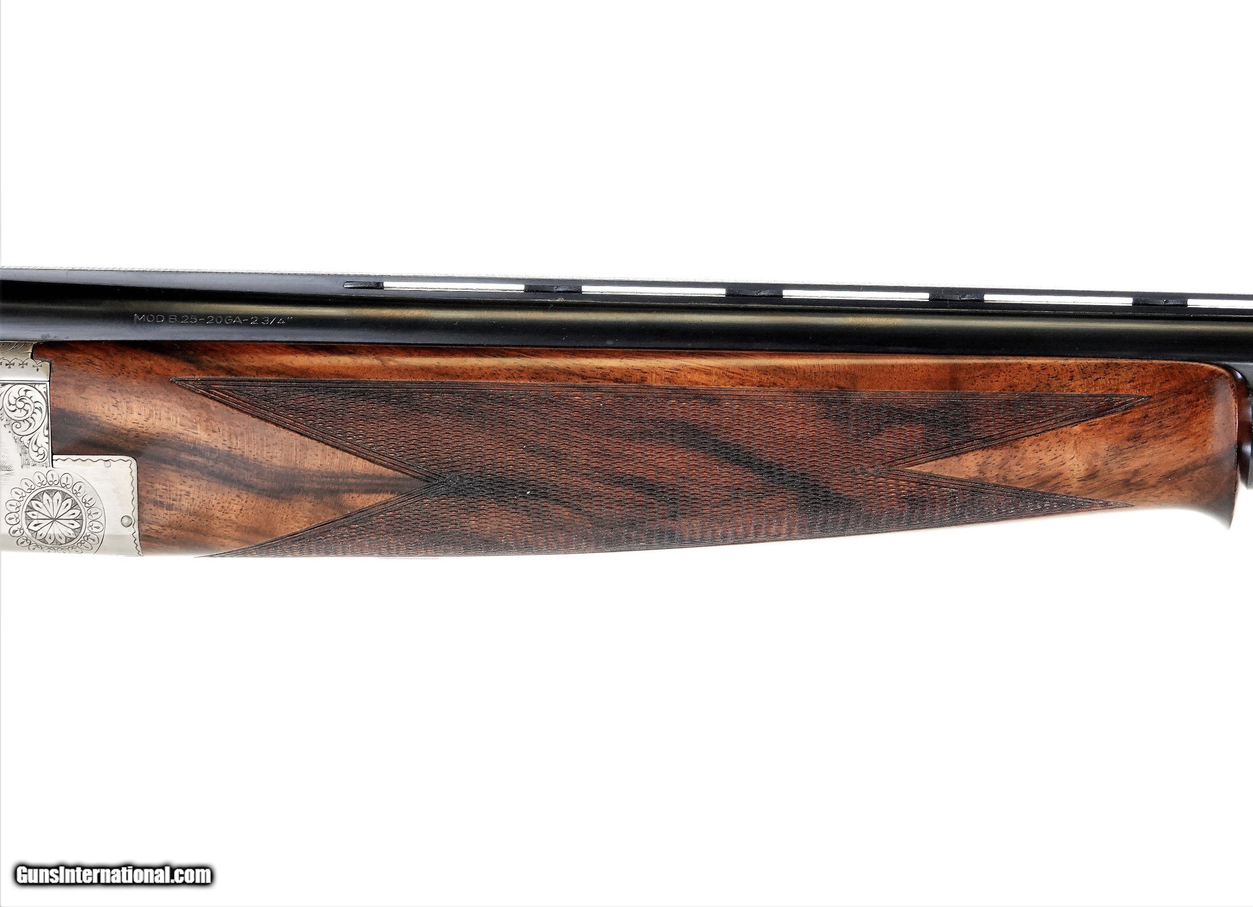 Description: Browning - B25 B2G, 20ga. 30" Barrels Choked IC/M. Round knob, long tang stock, Browning butt plate, schabel forend, ventilated rib, single selective trigger, highest quality 2001 Belgian custom shop manufacture, beautiful B2G engraving pattern featuring cock pheasants and mallard game vignettes over a coined finish signed by J.M. Martens, includes factory leather case, gun remains in as new and pristine condition and appears unfired. Inv: 29282 6 lbs. 5 oz. 14 ½” x 1 ½” x 2” $12,999.00 SOLD |