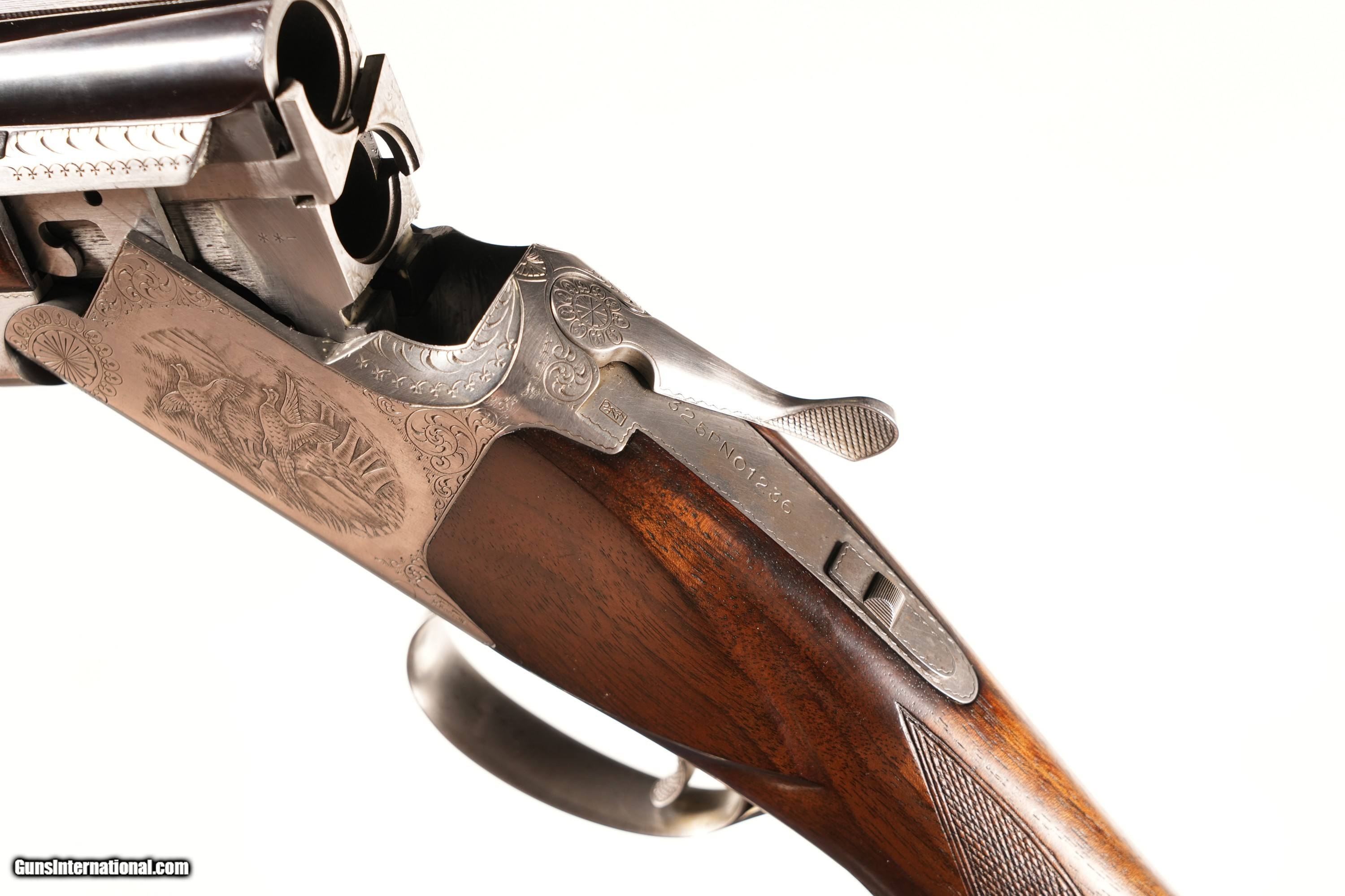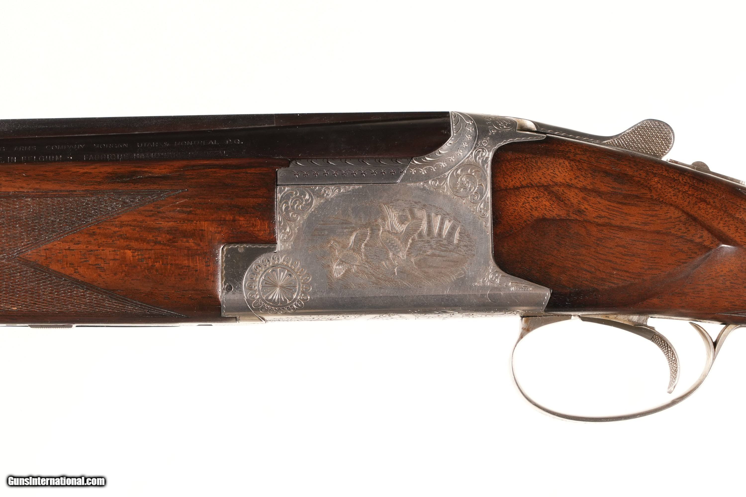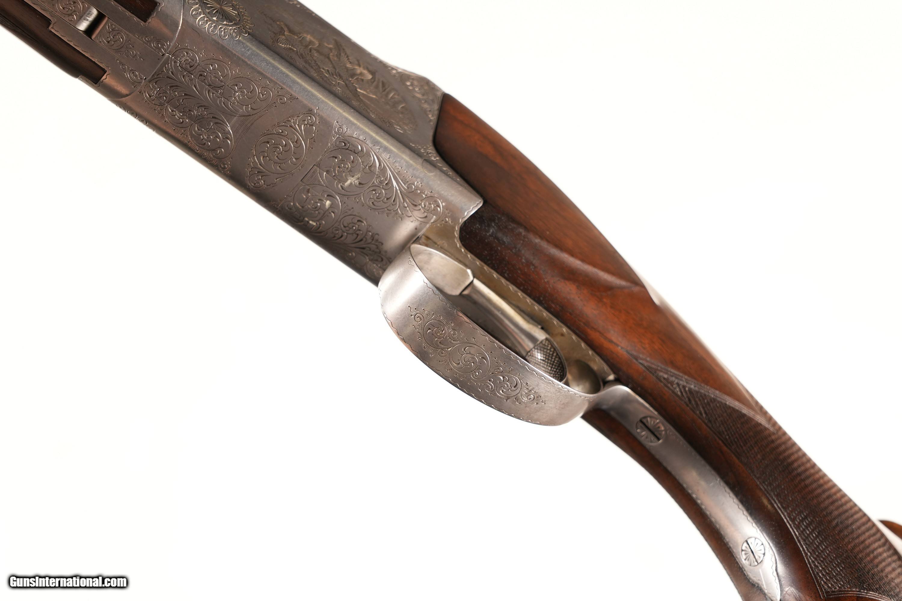 Description: Browning B2G 12 ga, signed by M. Bodson, Game scene engraved French grey receiver with vignettes of Pheasants and Waterfowl with foliate and scrolls. 28" Broadway vent rib Bbl with IM & Mod chokes 2 3/4" chambers Single selective trigger with ejectors. 14 1/4" LOP 1 1/2" DAC 2 1/2" DAH Cast off 5mm 7 lbs 5 oz Mfd 1989. Condition Very fine with Most all finishes remaining. Excellent stocks with some light handling. Mechanically fine • Free Shipping, No Credit Card Fees. • Lay-a-way available for this firearm. • 1/3 Down, a 1/3 in 30 Days 1/3 in 60 Days. SOLD Shotgun Gauge: 12 Gauge Manufacturer: Browning Model: B2G Serial Number: 325PN01236 Barrel Length: 28 Bore: 12 Ga Chambers: 2 3/4 Ejectors: Yes Condition: Extremely Fine Metal Condition: Extremely Fine Wood Condition: Extremely Fine Bore Condition: Bright Barrels: 28 Barrel Type: Over Under Action: Box Lock Ejector Triggers: Single Selective Stock: Checkered walnut Stock Comb: 1 1/2" Stock Heel: 2 1/2 Stock Cast: Cast Off 5mm Butt Pad: Composite LOP: 14 1/4 Rib: Broadway Vent Rib Finish: Blue & French Grey Weight: 7 Lbs 5 oz Sights: Bead Manufacture Date: 1989 Chokes: Imp, Mod & Mod Engraving: M. Bodson Game Scene Engraved & Signed |