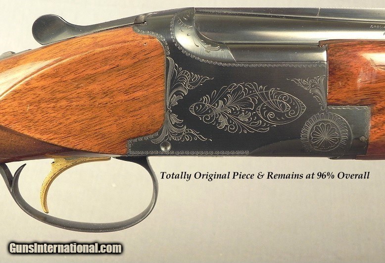 Description: #53806 S6, Belgium Browning Superposed Lightning Grade I Original Factory 12 & 20 Two Barrel Set, Round Knob Long Tang stock that remains totally original, Made in 1966, Both the 12 & 20 bore barrels are 26 1/2" vent rib and both choked Imp. Cyl. & Mod., The 12 bore at .722 .010 & .016"(Imp.Cyl. & Mod.), 2 3/4" chambers, Factory marked Imp.Cyl. & Mod., The 20 bore at .622 .006 & .015"(Imp.Cyl. & Mod.), 3" chambers, Factory marked Imp.Cyl. & Mod., Single selective trigger, Game forends on both barrel sets, Round knob long tang pistol grip stock at 14 7/16 x 1 1/2 x 2 3/8" over the original Browning buttplate, As a 20 bore it is 7 lbs. 8 oz. and as a 12 bore it is 7 lbs. 8 oz. as well, It handles the same as a 12 or a 20, This gun is Totally original and the barrel blue remains at 97%, The receiver blue is at 98%, The trigger guard retains 98% blue, The trigger face has 95% gold plating, The wood has original finish and remains at 95%, The checkering at 100%. The barrels inside and out are as new and look like they did 55 years ago. It is tight as a tick and the top lever lays well to the right. This 12 / 20 set has been well kept and I can assure you it was never used a lot or in harsh conditions. It is in the proper Browning trunk that remains in nearly the same condition as the gun. SOLD Curio/Relic: Yes Shotgun Gauge: 12 Gauge, 20 Gauge |